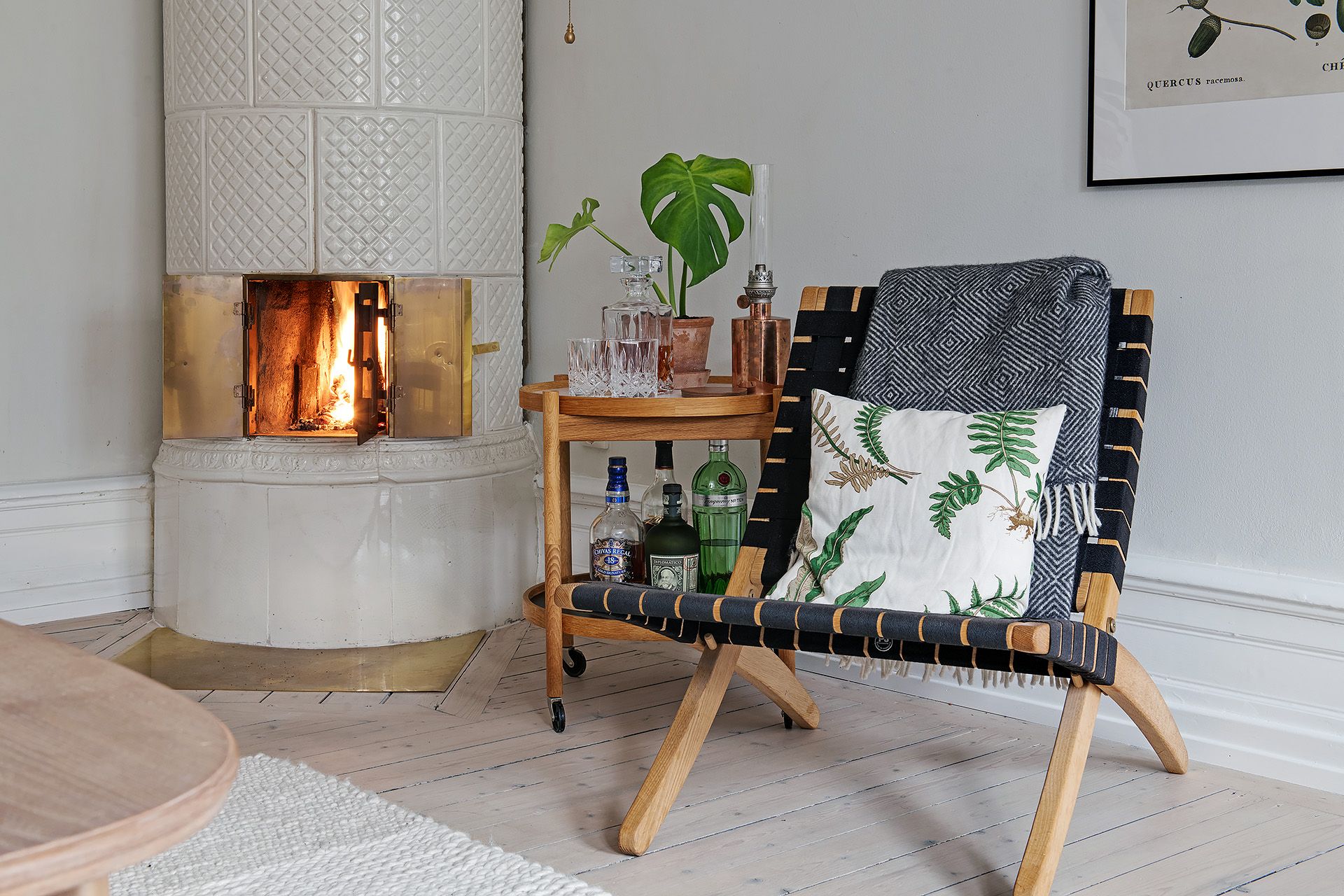 Eventuellt är det detta steg som inledde hela kakelugnsdrömmen nämligen att fantisera om och sedan bestämma sig för vilken typ av kakelugn du vill ha och efter det, kontakta en kakelugnsmakare. I den här bostaden valde man att installera en nedmonterad kakelugn som tidigare suttit i ett landshövdingehus i Göteborgsstadsdelen Haga, vilket får våra Alvhem-hjärtan att klappa lite extra hårt, såklart. Malin och Jonas valde att anlita E. Henriksson Kakelugnsmakeri och de har flertalet nedmonterade kakelugnar från olika årtionden att välja mellan. Skulle kakelugnen vara för hög eller låg för rummet går det till och med att ta bort eller lägga till kakelplattor för att den ska passa in. Det finns också olika valmöjligheter kring gnistskyddet som behöver ligga på golvet, Malin och Jonas valde ett i mässing, samt vilken typ av luckor du vill ha. Eftersom det var viktigt för paret att se elden utan att det skulle påverka dess brinntid så valde de att sätta en glaslucka innanför mässingsluckorna så att dessa kunde stå öppna under eldningen.