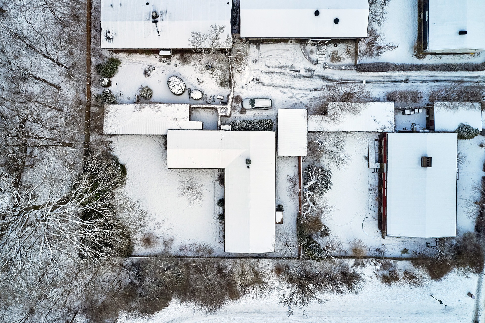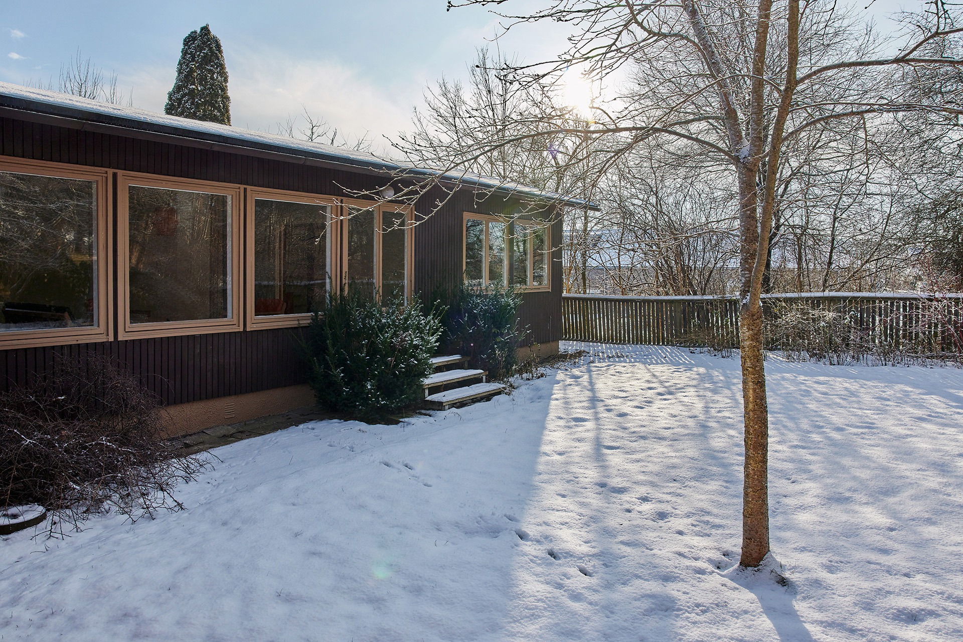 Enplansvillans form, och att den är byggd i vinkel med en loggia i ena änden, skapar en härlig, insynsskyddad innergård. Här växer körsbär, magnolia, blodlönn, syrén och äpple och precis utanför tomtgränsen ligger det en skogsdunge full av gamla ekar.