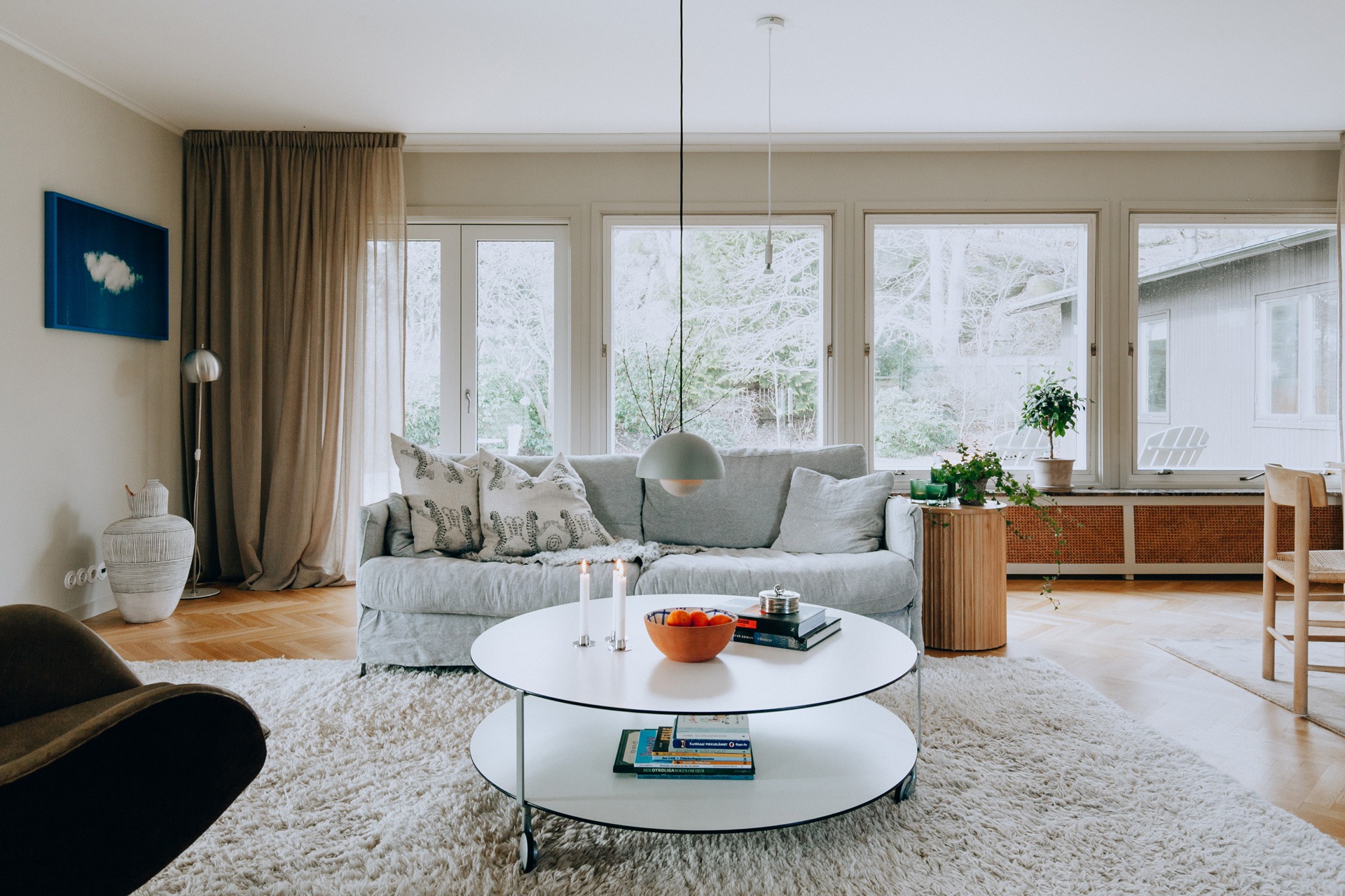 Vardagsrummet badar i ljus tack vare det stora fönsterpartiet som vetter ut mot trädgården. För detaljnördar i allmänhet och originaldetaljnördar i synnerhet är den vackra fönsterbrädan i brun marmor tillsammans med elementskyddet i rotting och fönsterhandtagen med sin karaktäristiska bakelitknopp som ljuv musik för ögonen. Om man kan säga så.