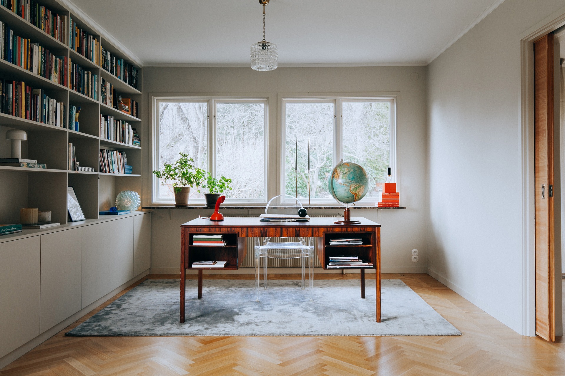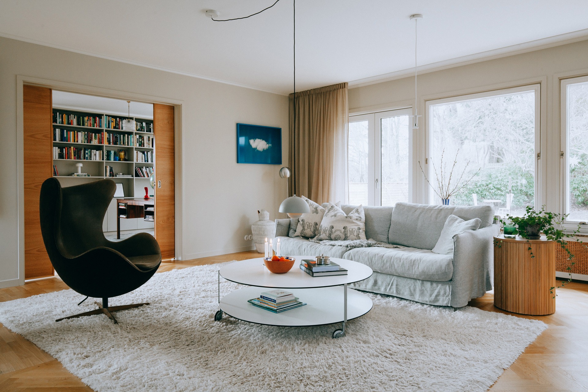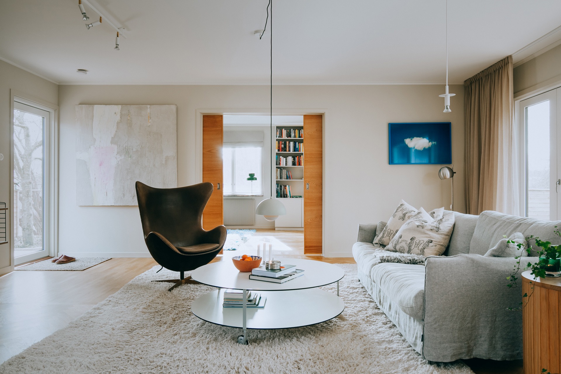 Vardagsrummet och det kombinerade biblioteket och arbetsrummet är avgränsade av två rejäla skjutdörrar. I biblioteket, som har fönster åt både söder och väster, har Amanda låtit platsbygga en stor bokhylla.