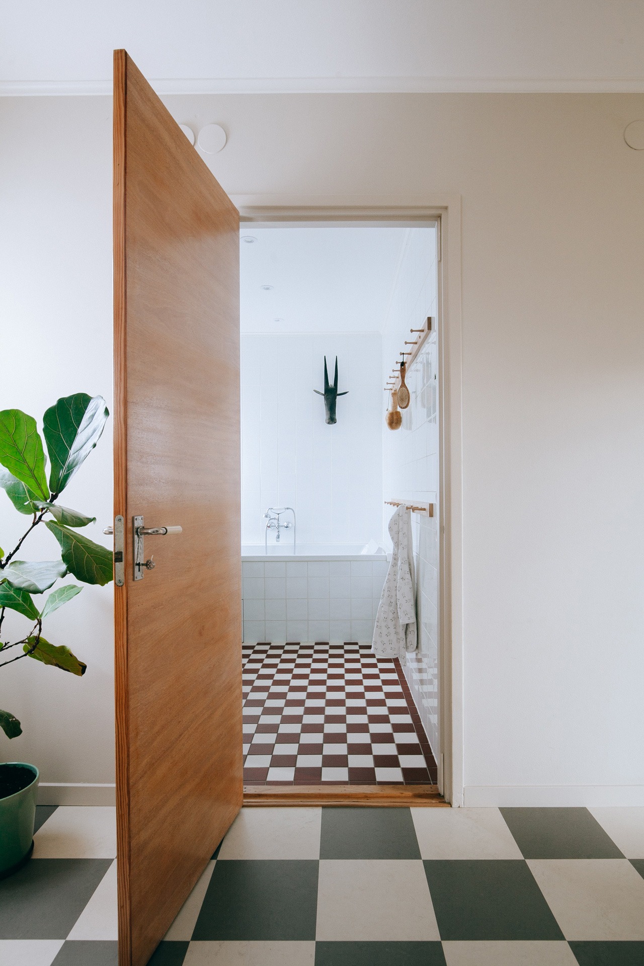 I direkt anslutning till hallen ligger husets badrum. Här har Amanda skapat en funkisinspirerad 50-talsdröm, uppdaterad till 2023 års standard. Golvet går i vitt och mörkt rostrött och badkaret är inkaklat. Hallens nya linoleummatta syns på bilden nedan.