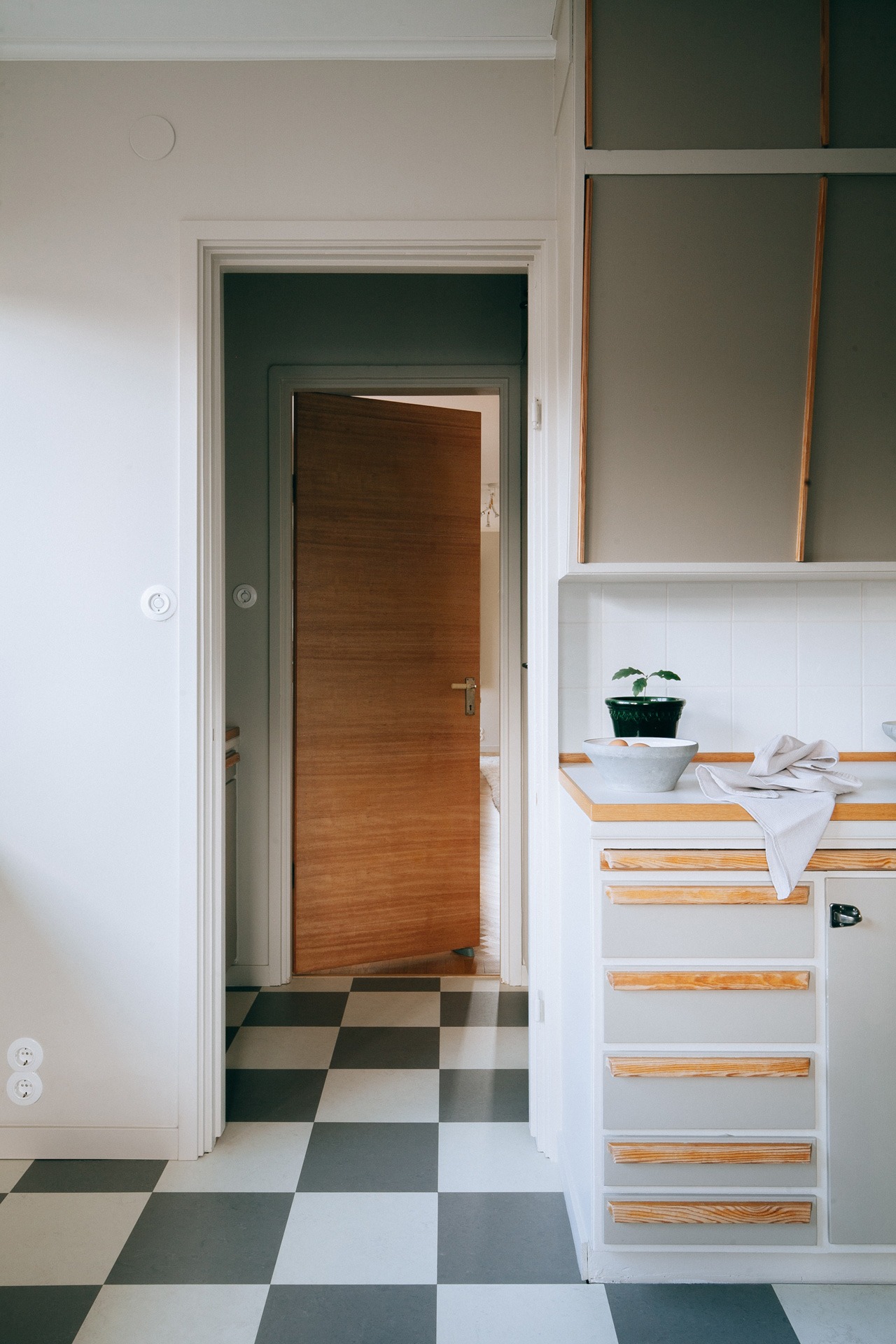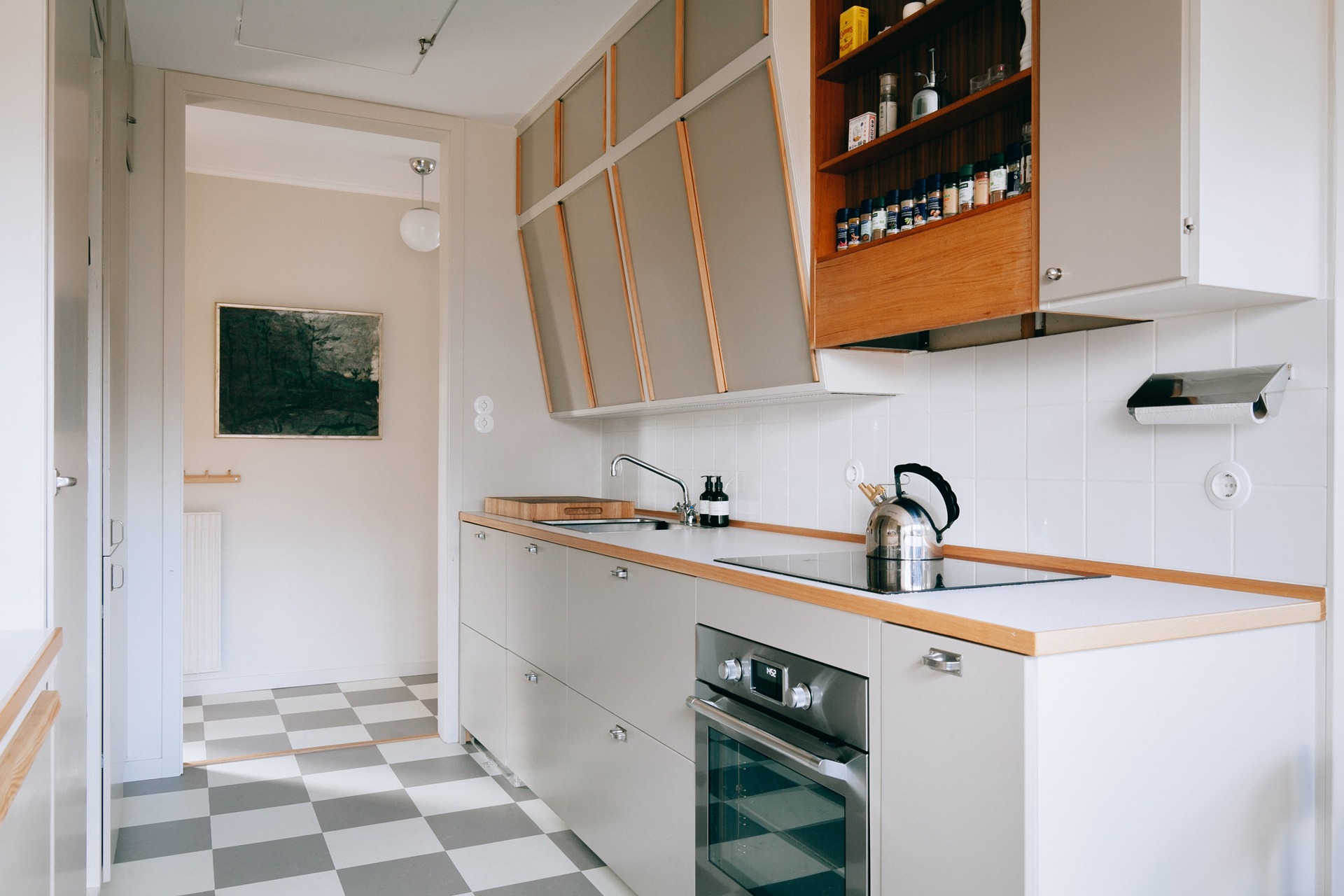 – Jag har behållit alla överskåpen och skåpen i serveringsgången men eftersom folk var kortare förr, blev köksbänken för låg så där har jag bytt underskåpen till nya. Men jag valde tidstypiska blandare och bänkskivor så därför känns det ändå som om hela köket är i originalutförande.