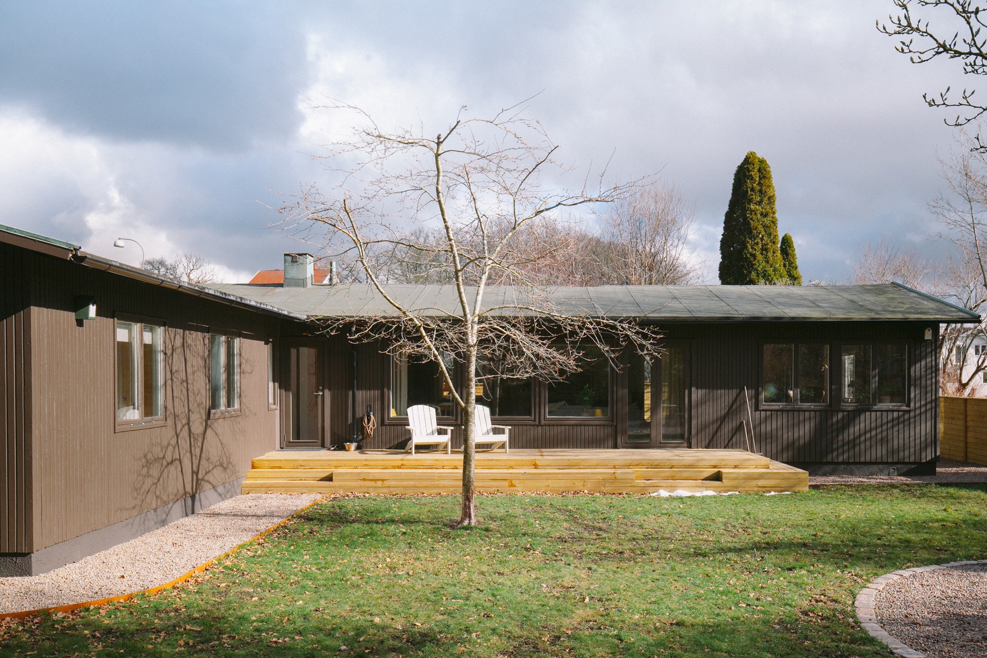 Fasaden behövde jag dock ta tag i direkt. När huset byggdes målades det brunt och det ville jag behålla men för att få det lite modernare valde jag en något mörkare nyans och lät måla in fönstren i samma kulör.