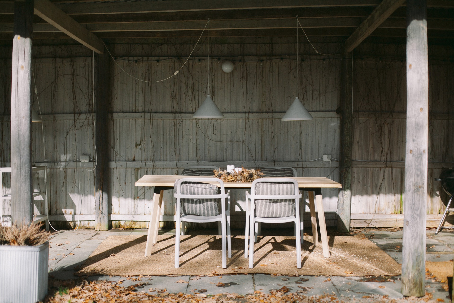 – Jag funderade på vad en ”loggia” var när jag tittade på planskissen inför visningen. Jag hade aldrig hört det uttrycket innan, men det har visat sig vara trädgårdens bästa plats! Ett enklare uterum skulle man väl kunna säga. Och också det enda utrymmet som jag inte har rört sedan vi flyttade in. Det finns absolut potential att göra både utekök och orangeri där men samtidigt gillar jag den som den är, i sin enkelhet. Och vi använder den massor.
