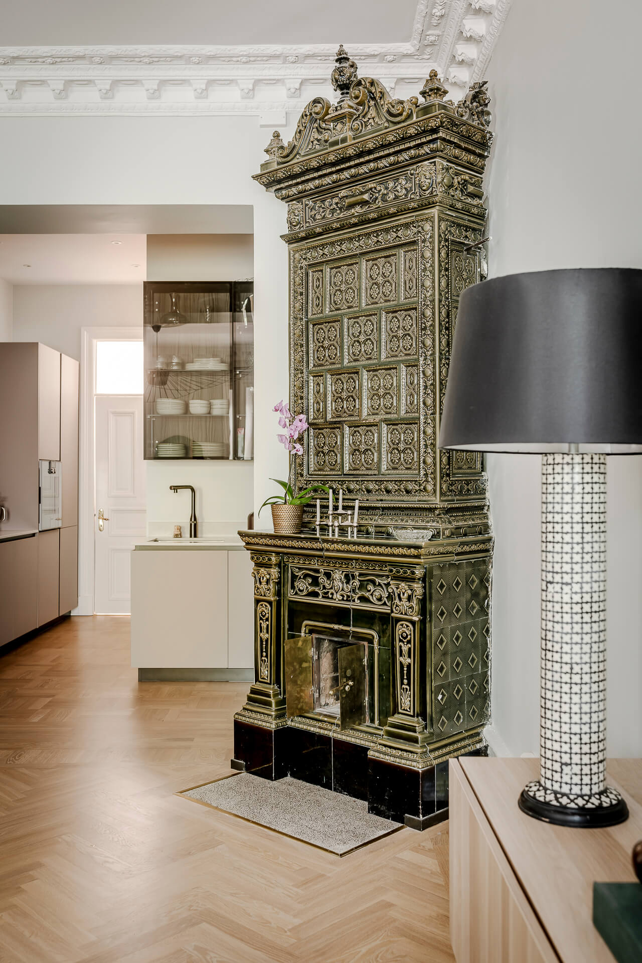 Högt i tak, vackra stuckaturer, höga originallister och en maffig mörkgrön kakelugn – i det här hemmet finns det många detaljer att förälska sig i. I den ljusa, rymliga lägenheten med utsikt över Vasaparken bor Viktoria, Joakim, sonen Sixten (fyra månader) och hunden Melvin.