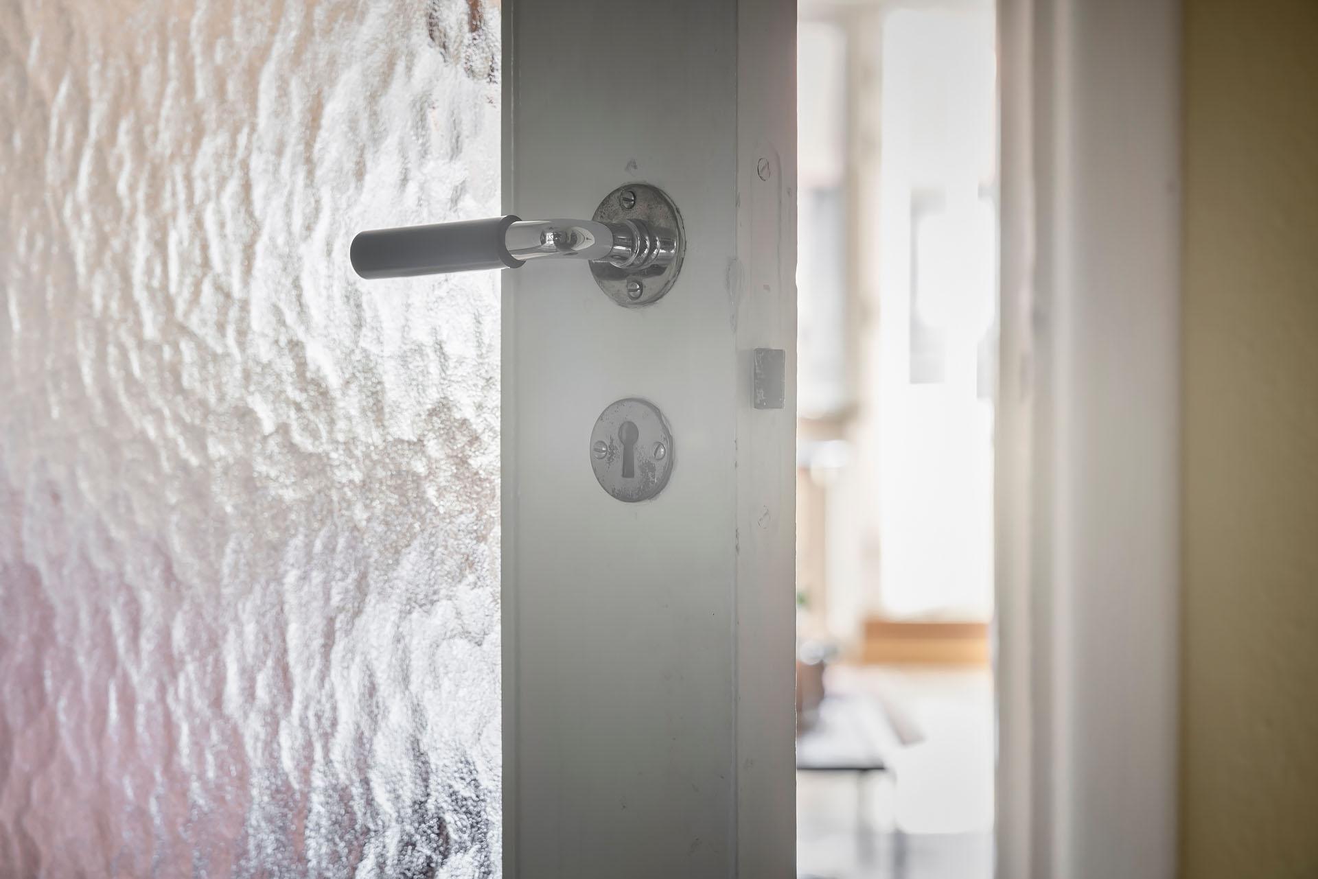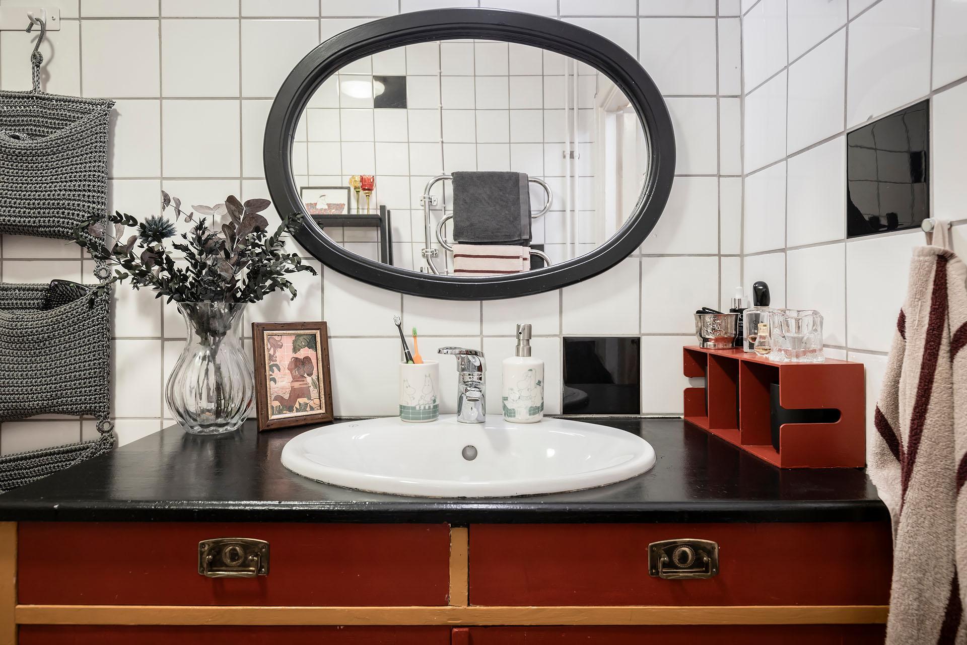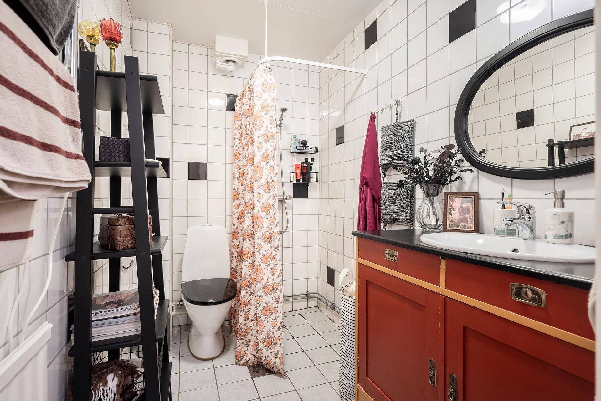 Bakom en originaldörr med bevarat lås gömmer sig ett rymligt badrum med duschhörna, handdukstork, toalett och specialbyggd tvättkommod. Badrummets väggar är klädda med vitt och svart kakel, och golvet belagt med ljusgrå klinker.