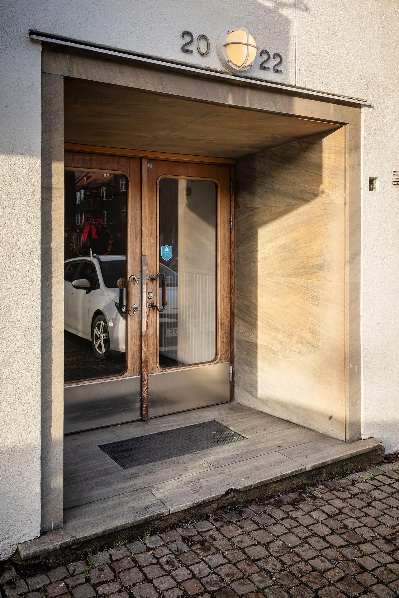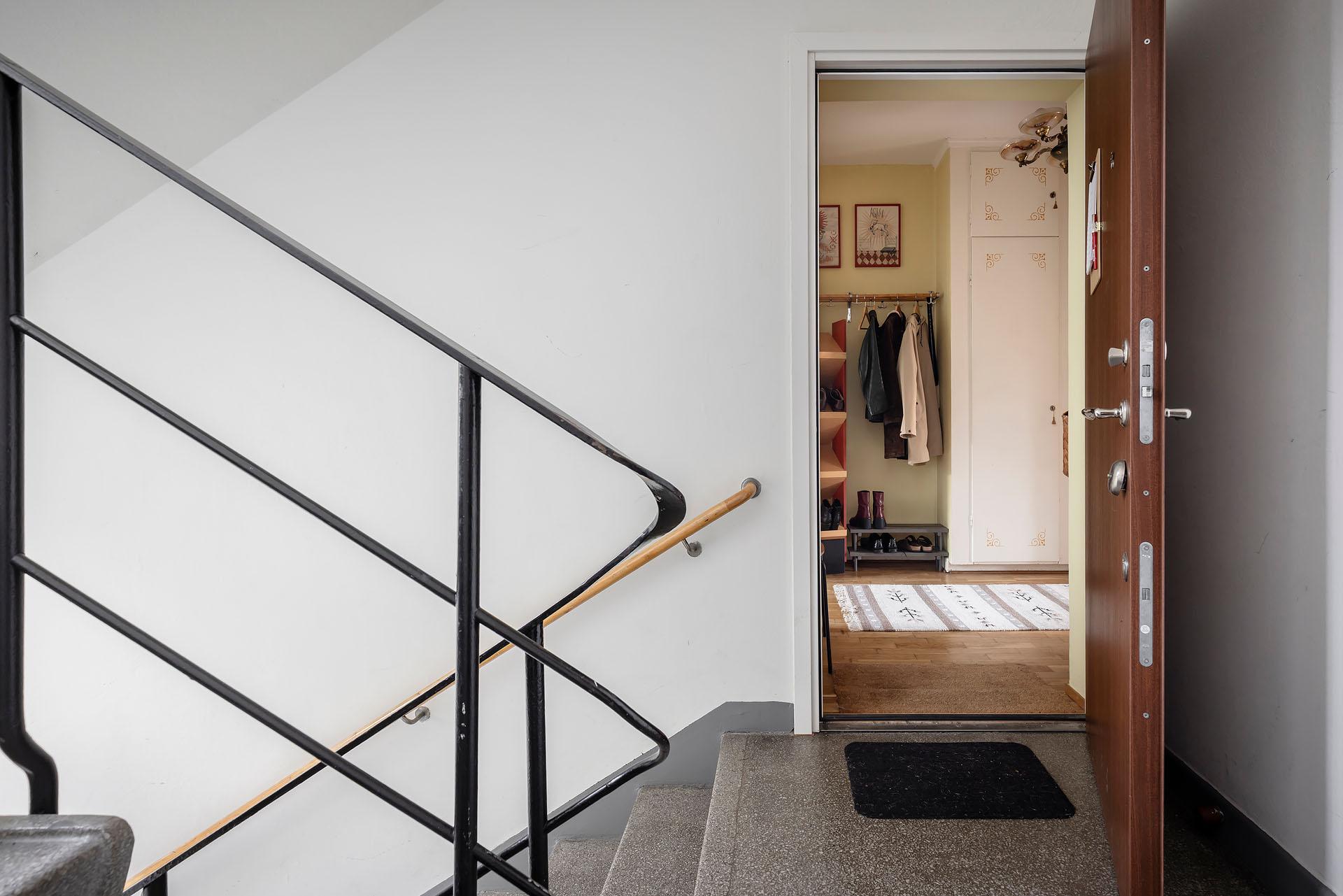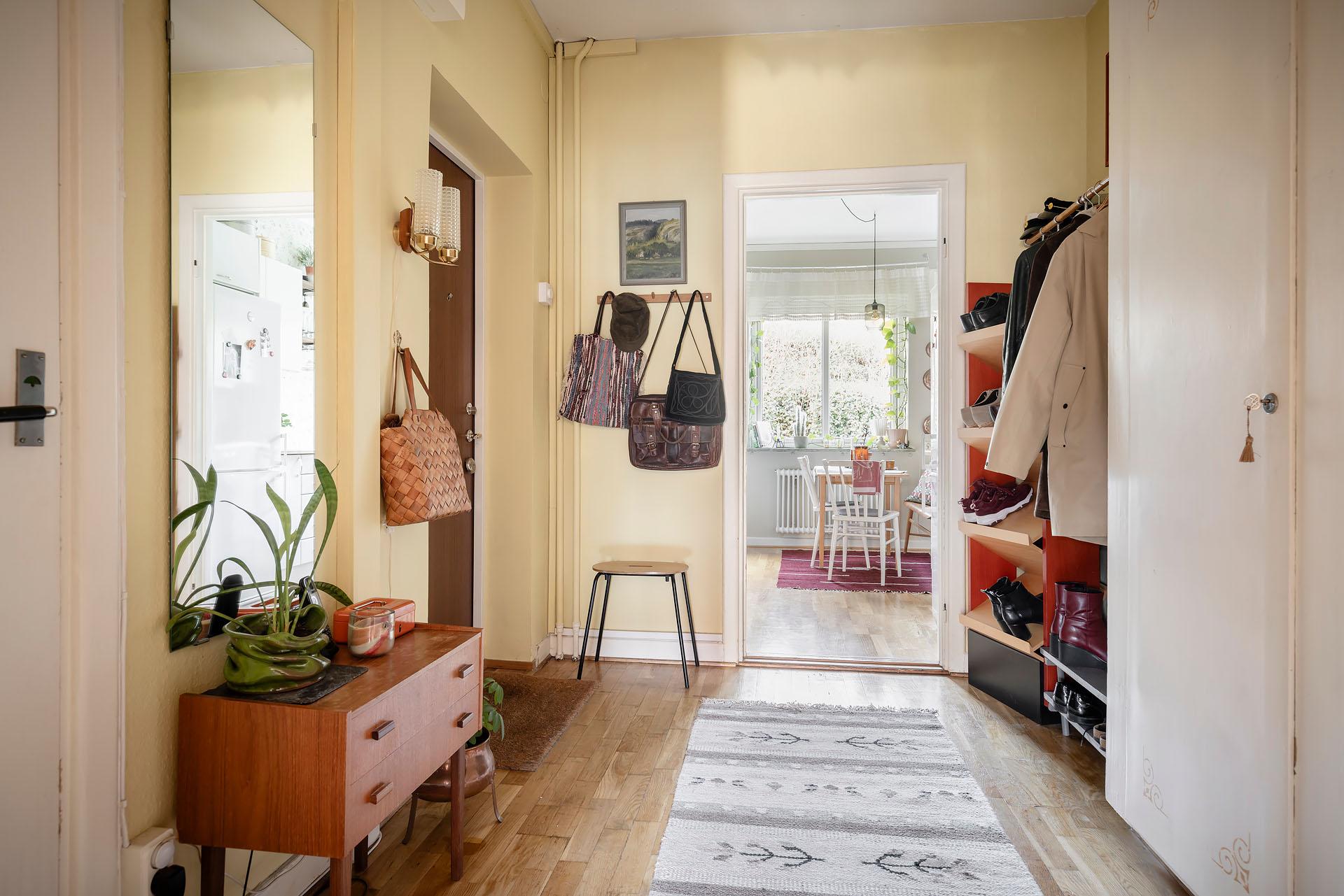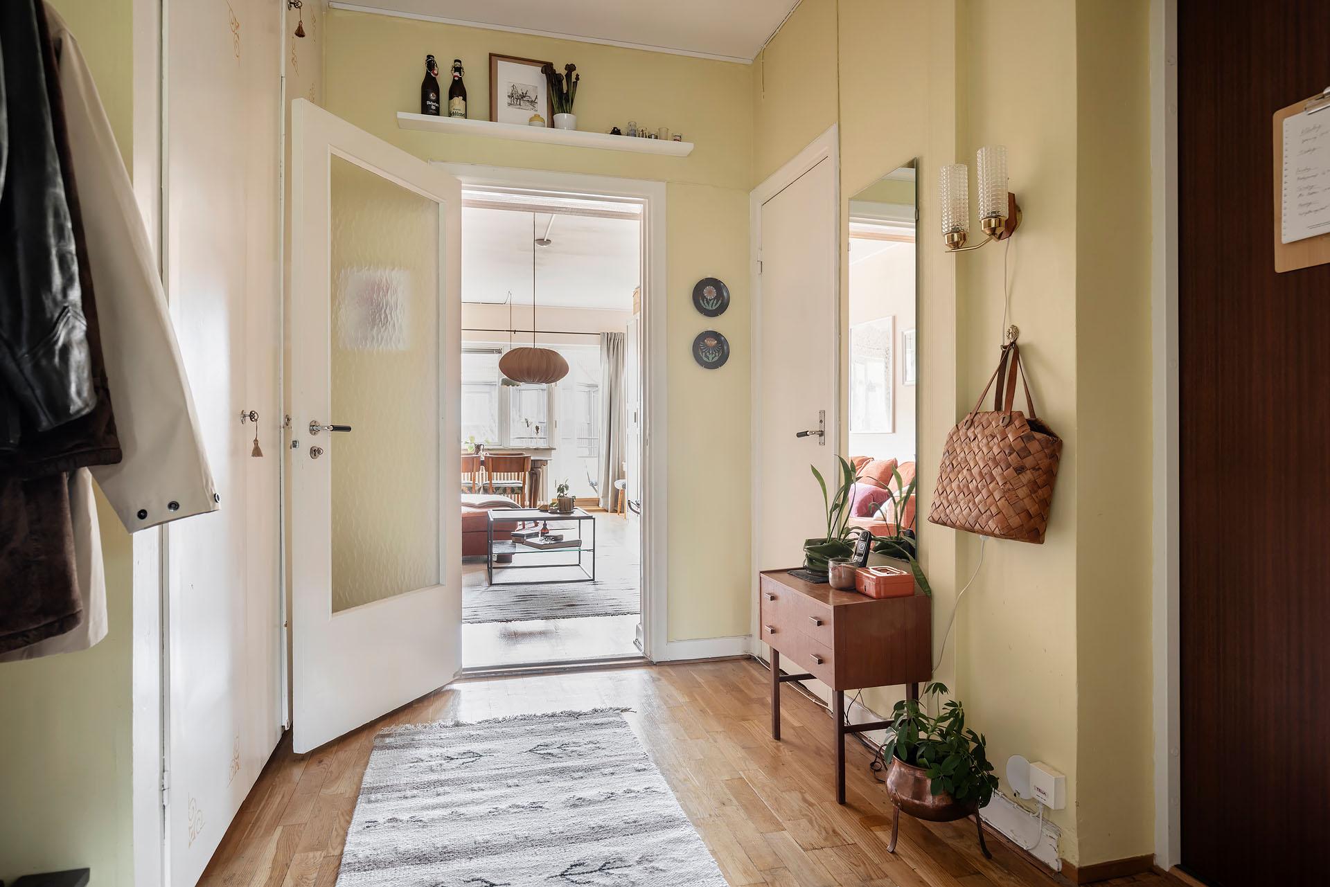 Hallen är rymlig, och mitt emot ytterdörren finns en avhängningsnisch med hatthylla i funkisstil. Utmärkta förvaringsmöjligheter från golv till tak erbjuds i form av två platsbyggda originalgarderober med överskåp. Väggarna är målade i en ljuvlig ljusgul färg, och liksom i övriga lägenheten är golvet belagt med parkett.