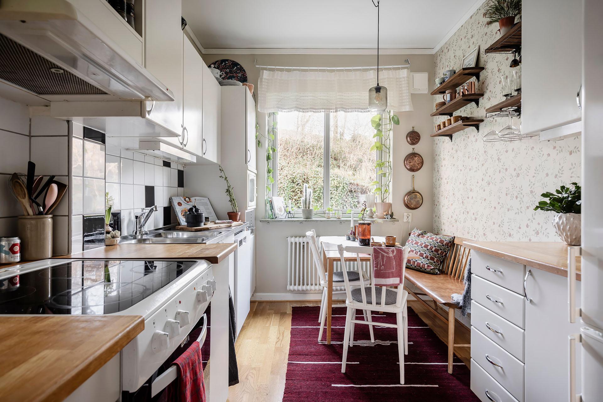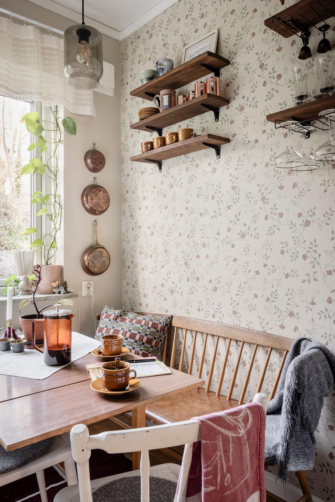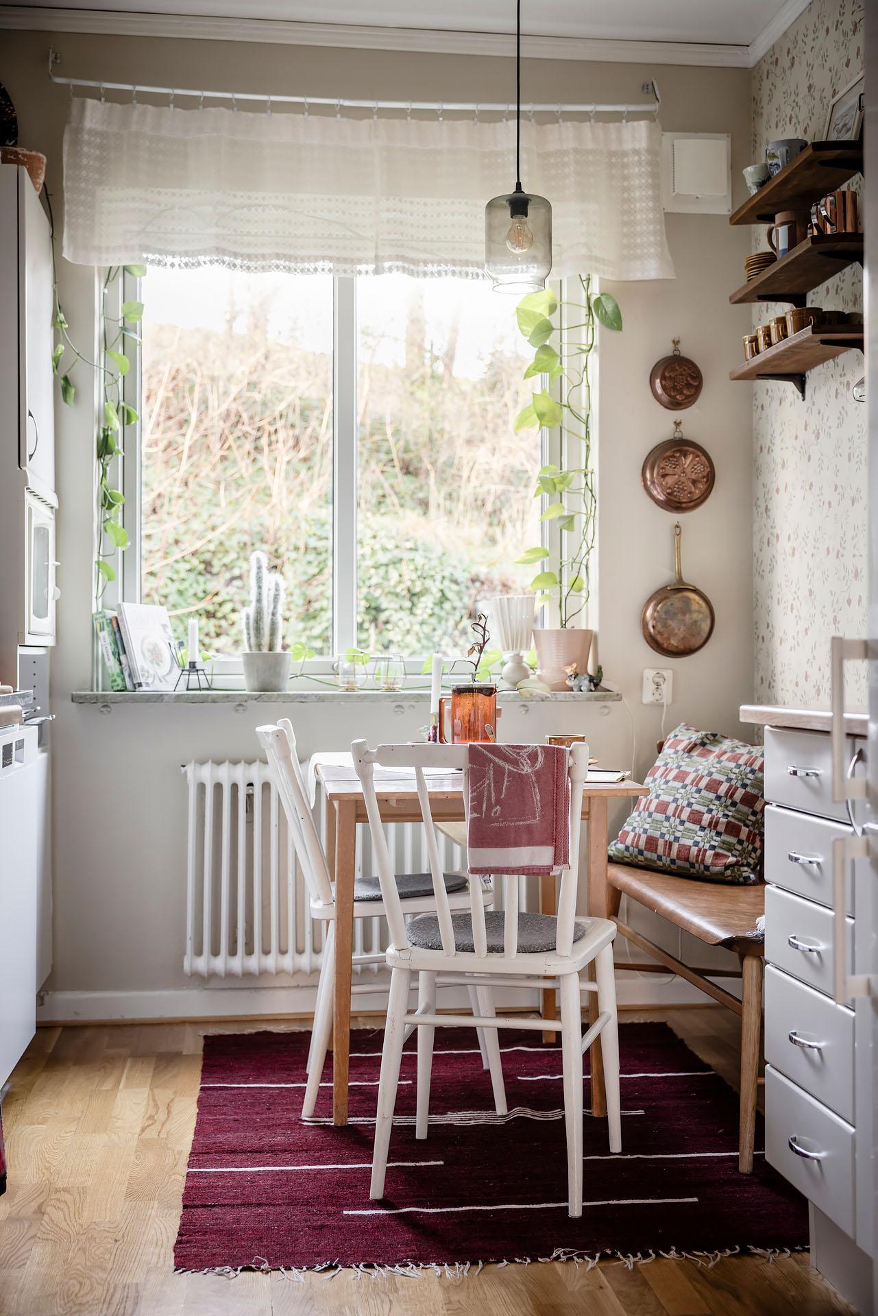 Köket är trivsamt och vid fönstret finns en ljus och mysig matplats. Kvällssolen strålar in genom grönskan. Det är väl tilltaget med både förvaring och arbetsyta, och här kan flera laga mat tillsammans utan att behöva trängas. Skåpen har vita luckor och lådor, och bänkskivorna är i massivt trä. Partierna ovanför arbetsbänkarna, diskbänken och spisen är klädda med svart/vitt kakel. Spisen kommer från Gram och den endast ett par år gamla diskmaskinen från Cylinda. Kylen/frysen och den inbyggda mikron är av märket Electrolux. Väggarna är målade i beige och tapetserade med en blommig tapet. Golvet är belagt med parkett.