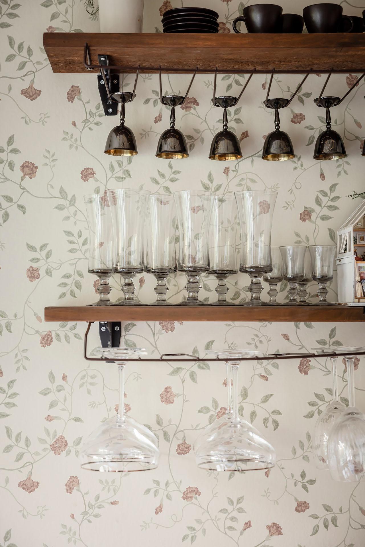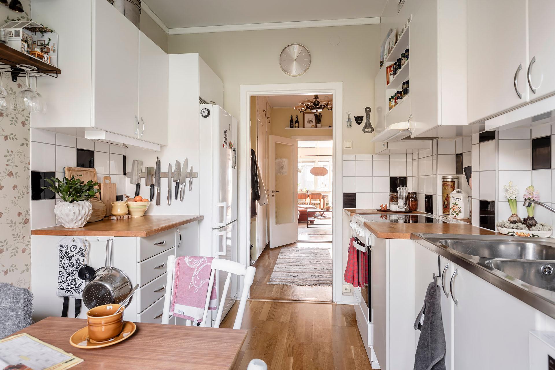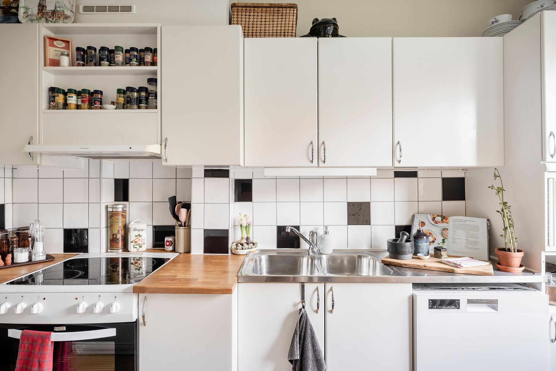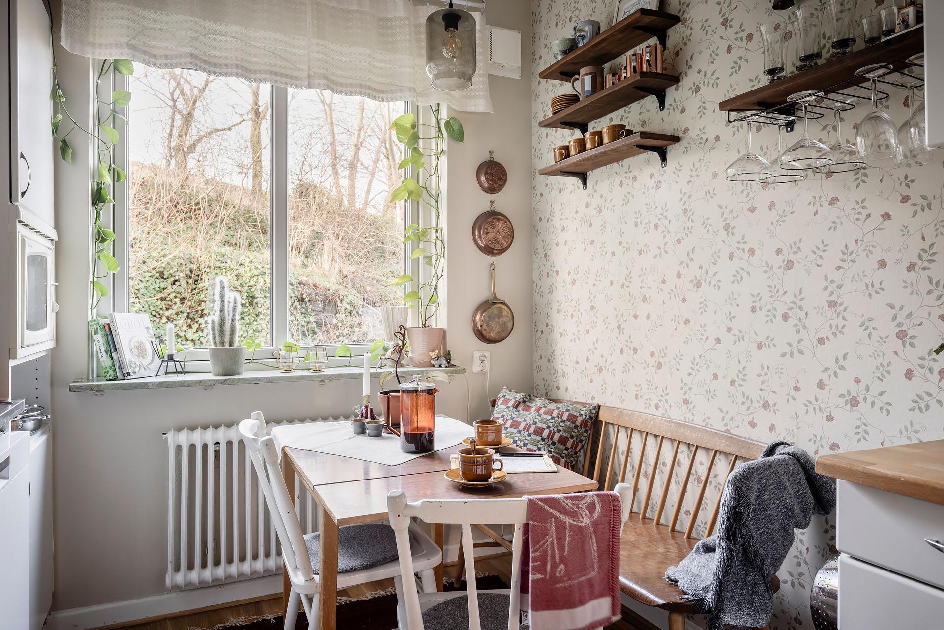 Köket är trivsamt och vid fönstret finns en ljus och mysig matplats. Kvällssolen strålar in genom grönskan. Det är väl tilltaget med både förvaring och arbetsyta, och här kan flera laga mat tillsammans utan att behöva trängas. Skåpen har vita luckor och lådor, och bänkskivorna är i massivt trä. Partierna ovanför arbetsbänkarna, diskbänken och spisen är klädda med svart/vitt kakel. Spisen kommer från Gram och den endast ett par år gamla diskmaskinen från Cylinda. Kylen/frysen och den inbyggda mikron är av märket Electrolux. Väggarna är målade i beige och tapetserade med en blommig tapet. Golvet är belagt med parkett.
