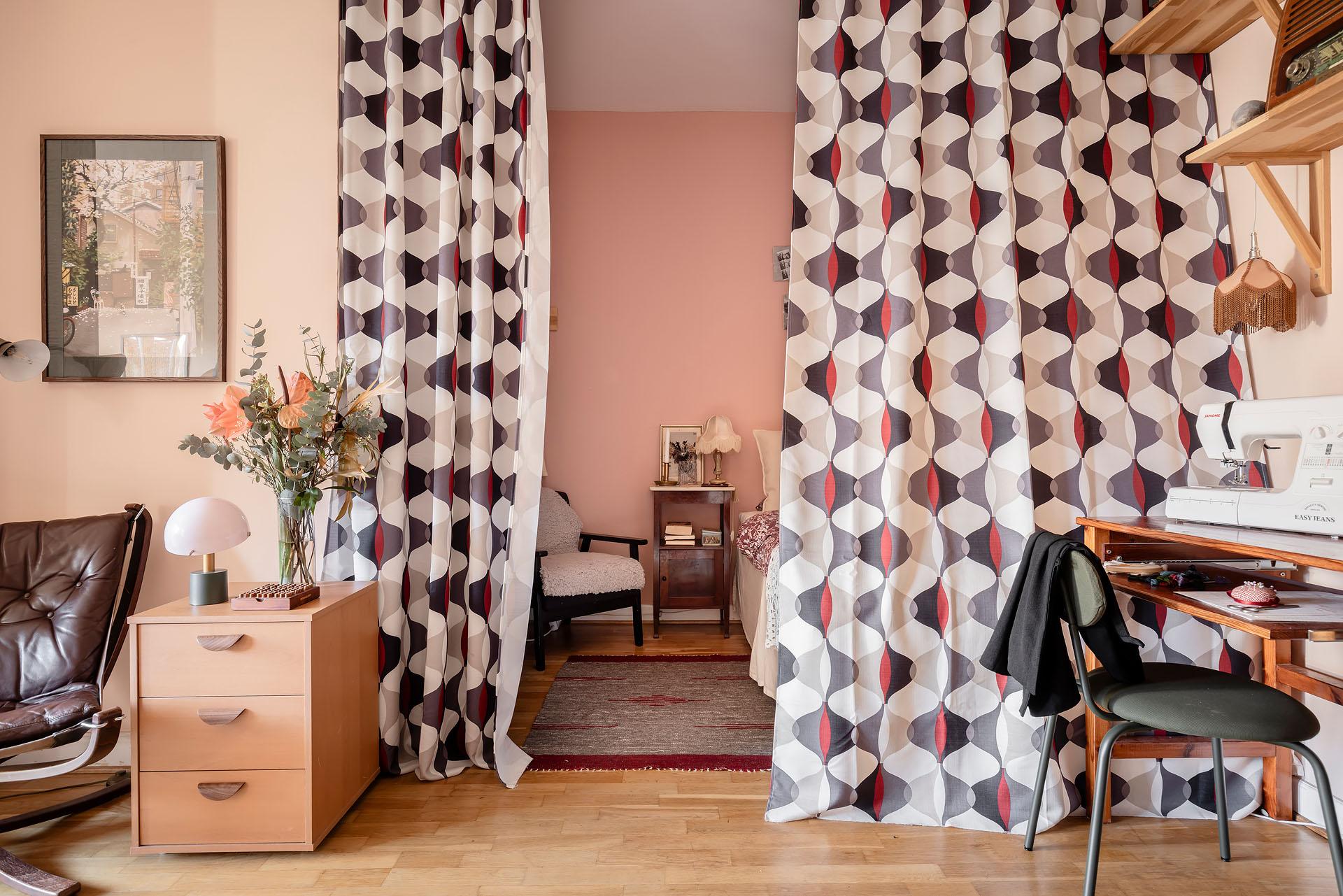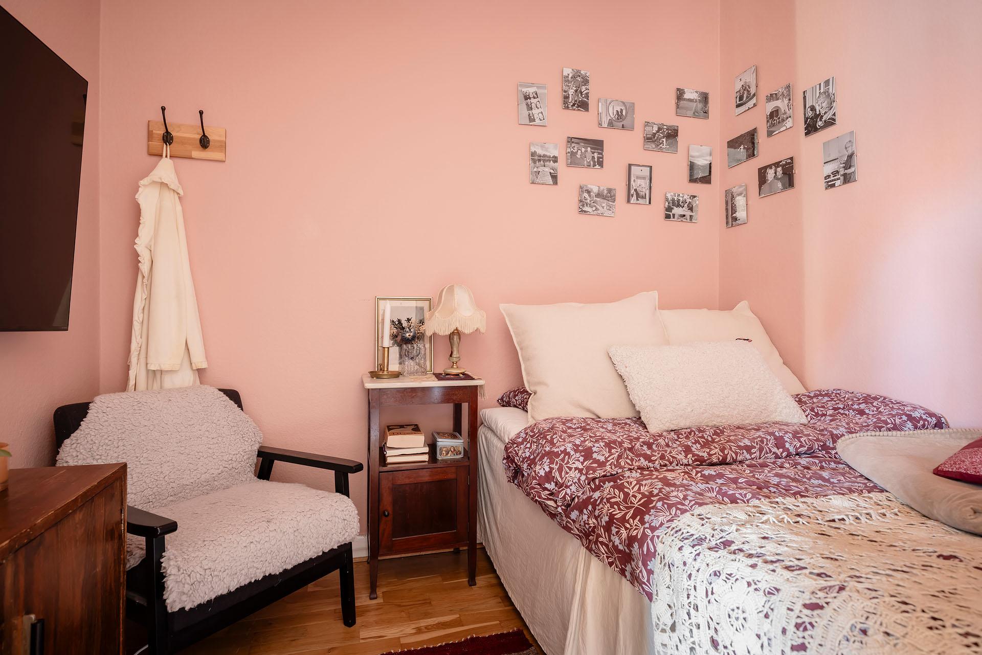 Även den avskiljbara sovalkoven är rymlig. Det finns plats för en dubbelsäng, alternativt en enkelsäng tillsammans med läsfåtölj, byrå med mera. Golvet är belagt med parkett och väggarna målade i rosa.