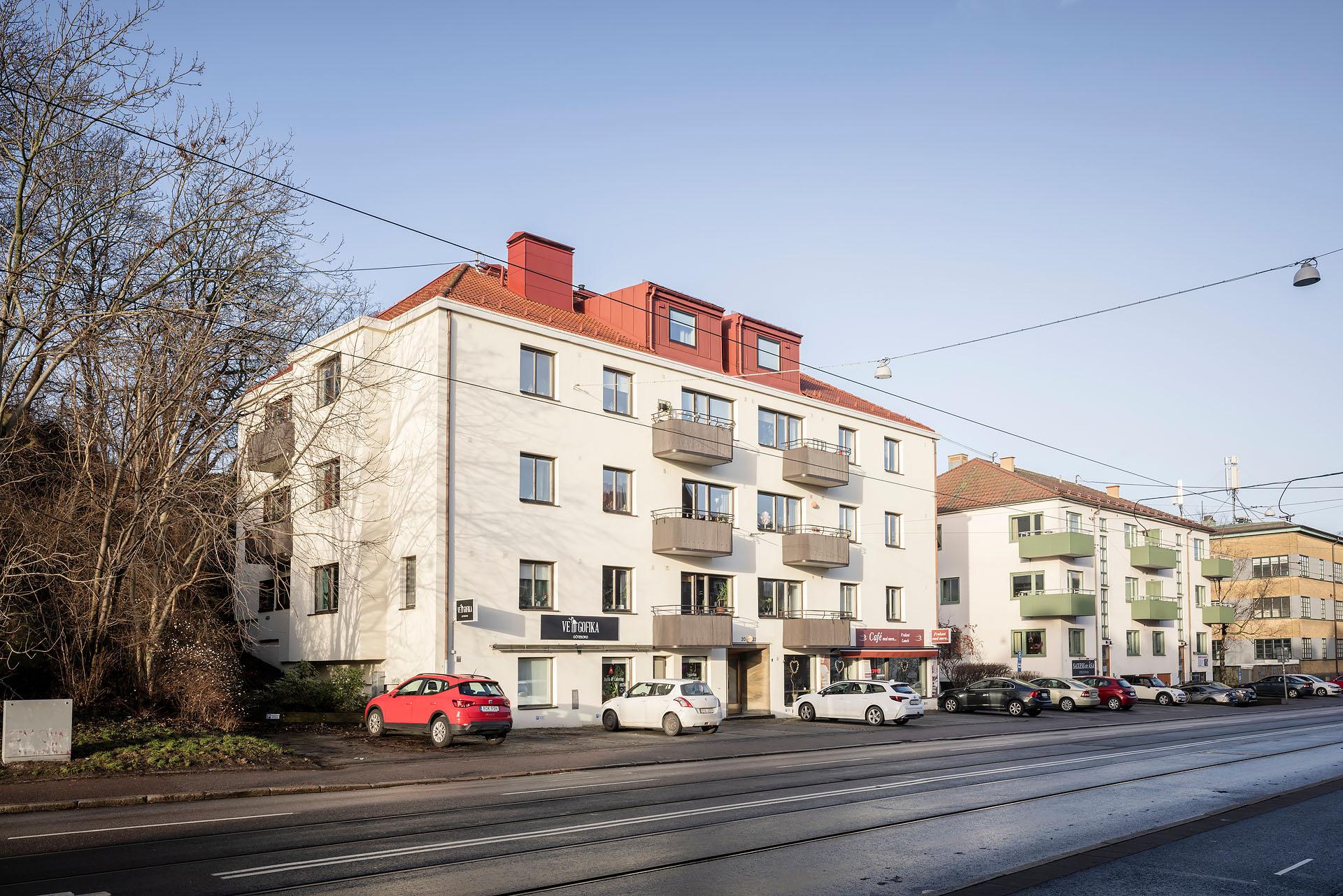Stigar ringlar sig upp till Redbergsparkens höjder med fantastisk utsikt över staden, och strax utanför husets stiliga originalportar väntar Redbergsplatsen med puls och kommunikationer. På kort gångavstånd har man Olskrokstorget med bland annat fiskbodar, grönsakshandlare, Systembolaget och en välsorterad Ica-butik med generösa öppettider. Med cykel, spårvagn eller buss tar man sig snabbt in till stan, och det är även nära till Delsjöområdets natur, Skatås motionsmöjligheter och Härlanda tjärns badplats.