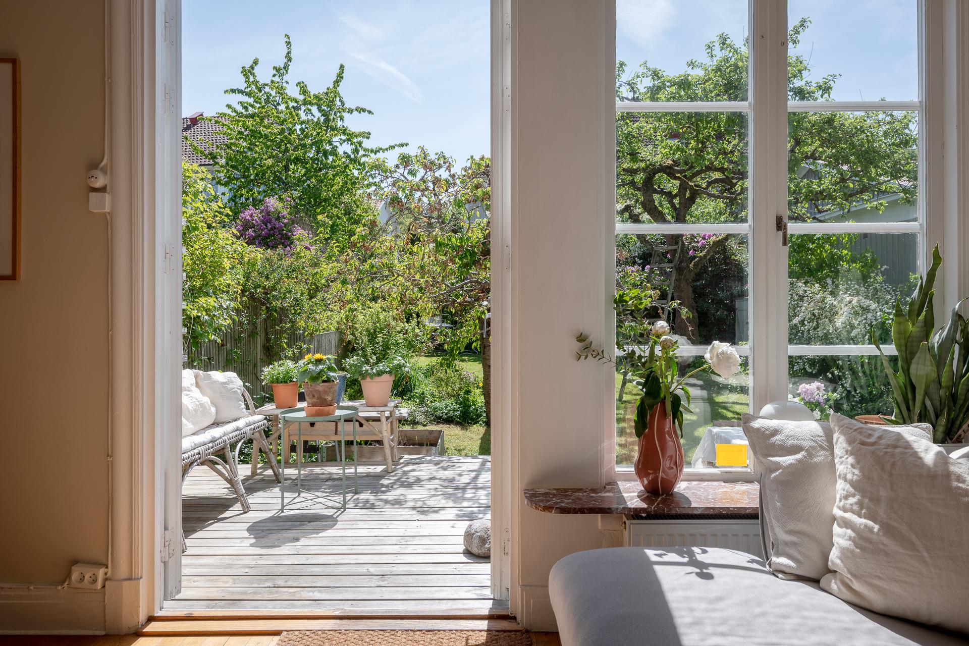 Våren spirar i ett av Göteborgs mest pastelliga områden, Änggården. Här ligger den här grönskande trean med trädgård! Till lägenheten hör också ett rum som kan hyras ut. Vardagsrummet har originalgolv, tjusiga handblåsta fönster, takrosett och dubbeldörrar som leder ut i den otroliga trädgården. Här växer fruktträd och bärbuskar och du har en egen uteplats för härliga middagar. Nämnde vi det soliga läget? Inte? Då gör vi det nu!