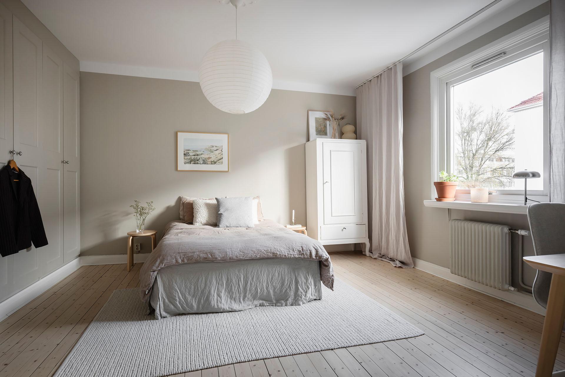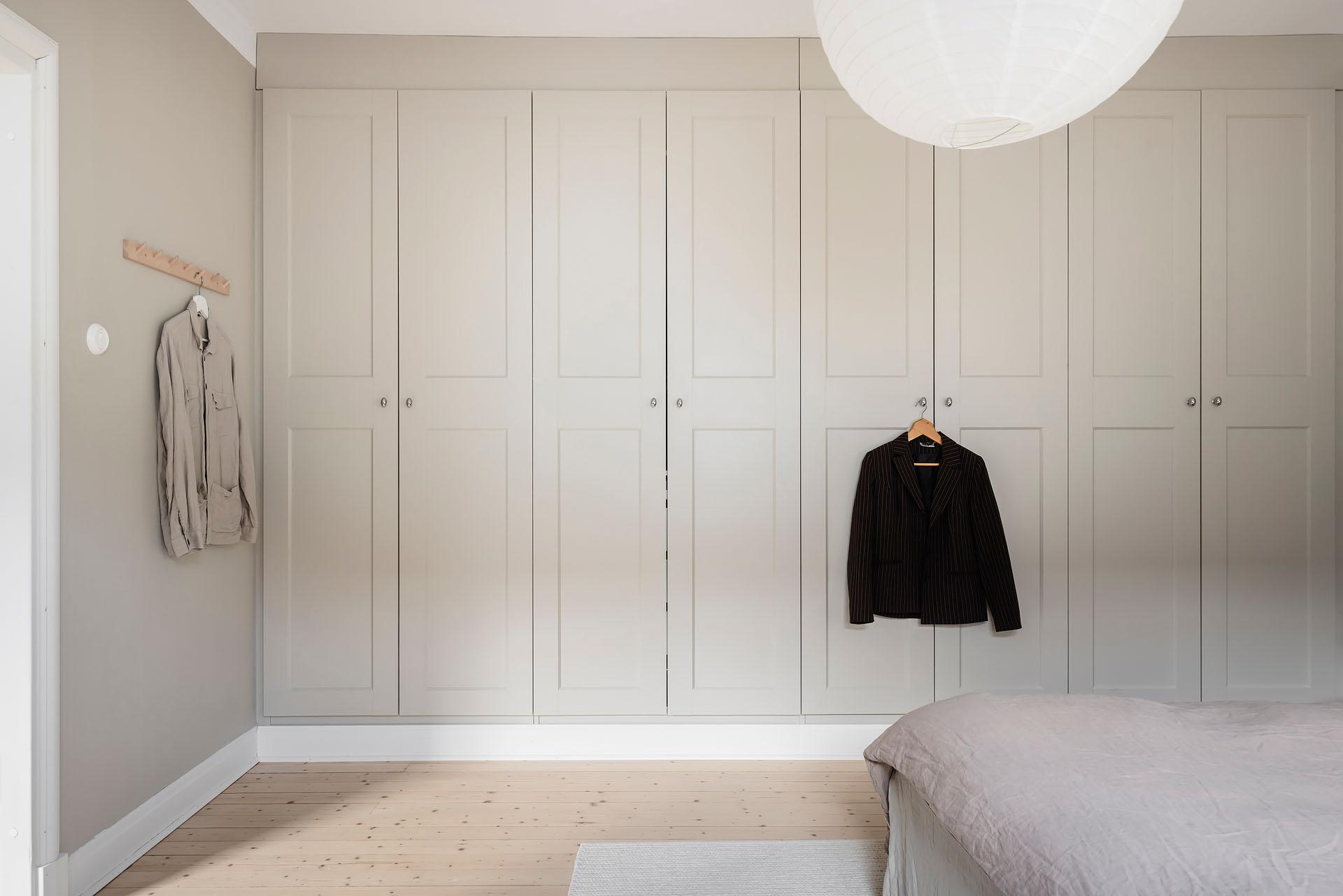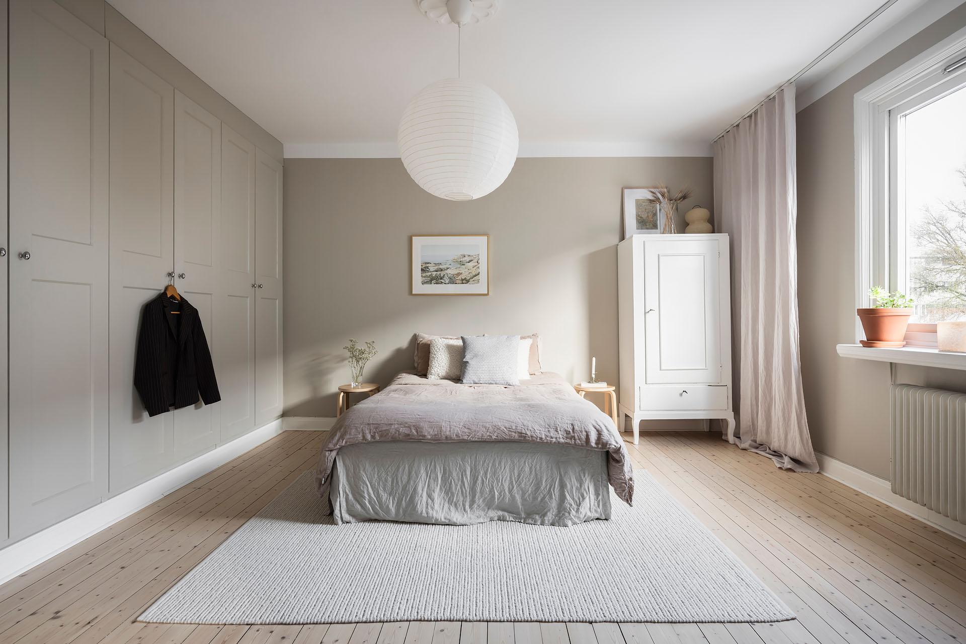 Ett lyxigt stort sovrum rum med framtaget brädgolvgolv och väggar målade i Soothing Beige från Jotun. De platsbyggda garderoberna längs hela väggen – inmålade i samma kulör som väggarna – ger ett stilrent intryck och utmärkt förvaring. Ovanför finns extra luckor för säsongsförvaring.