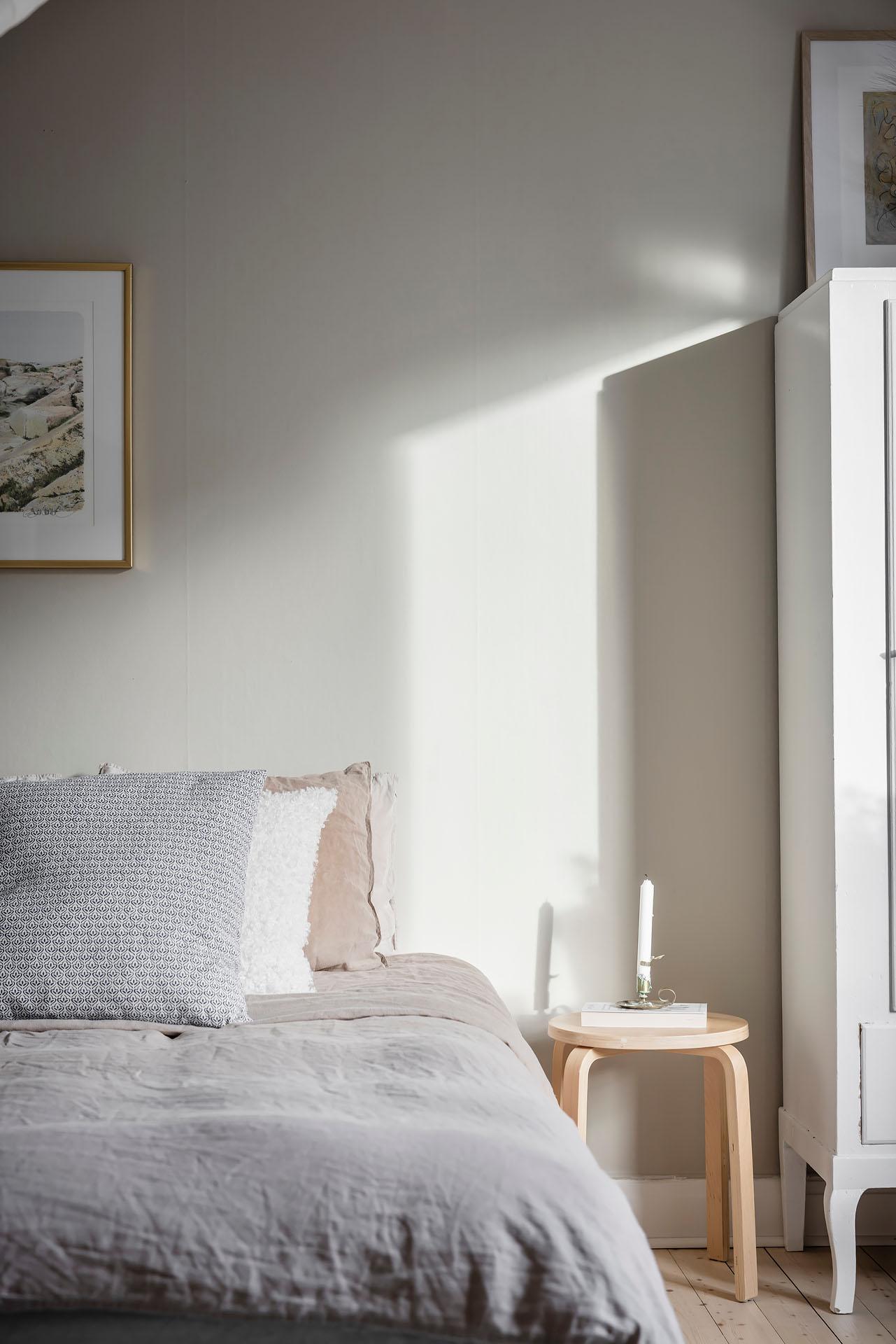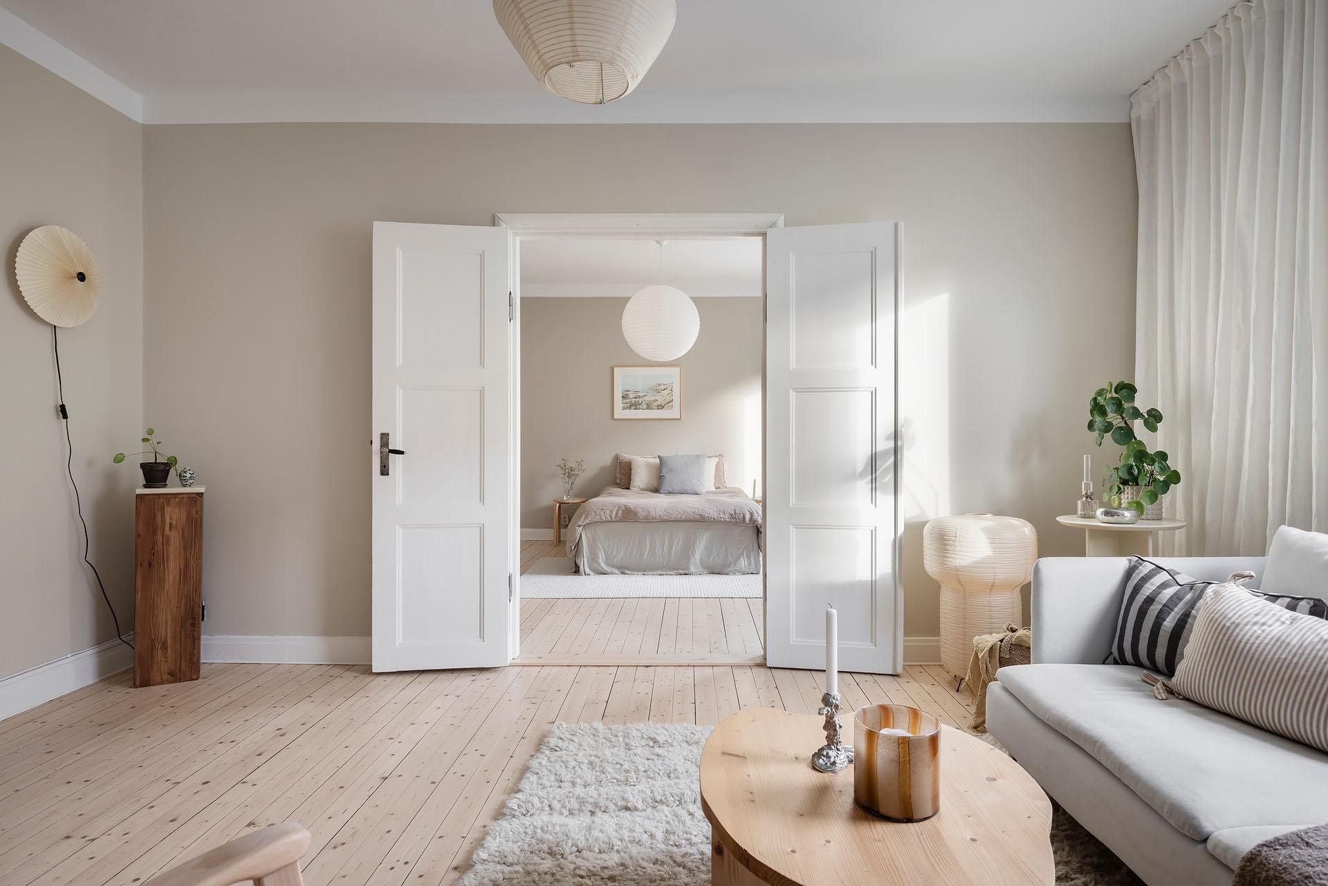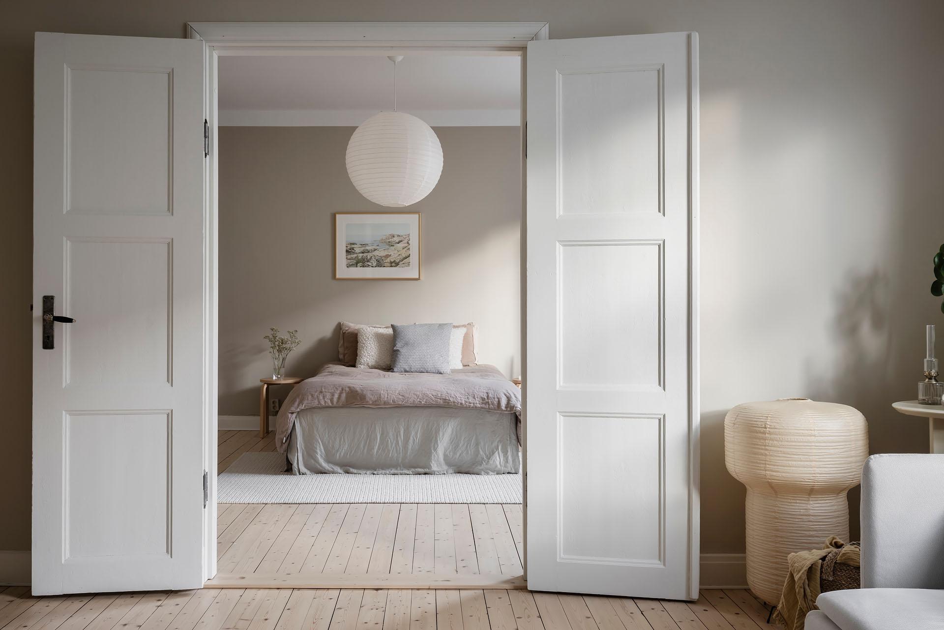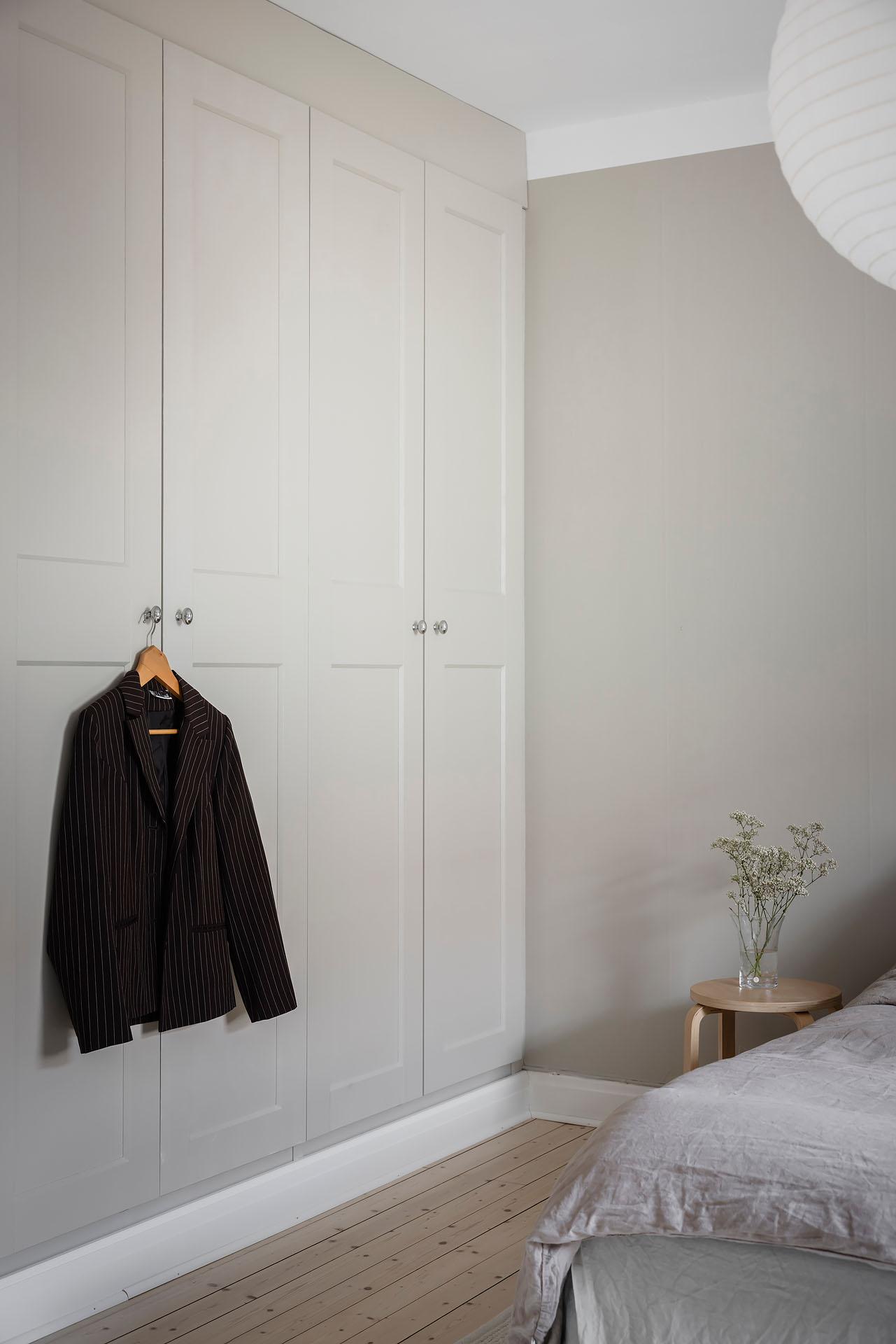 Ett lyxigt stort sovrum rum med framtaget brädgolvgolv och väggar målade i Soothing Beige från Jotun. De platsbyggda garderoberna längs hela väggen – inmålade i samma kulör som väggarna – ger ett stilrent intryck och utmärkt förvaring. Ovanför finns extra luckor för säsongsförvaring.