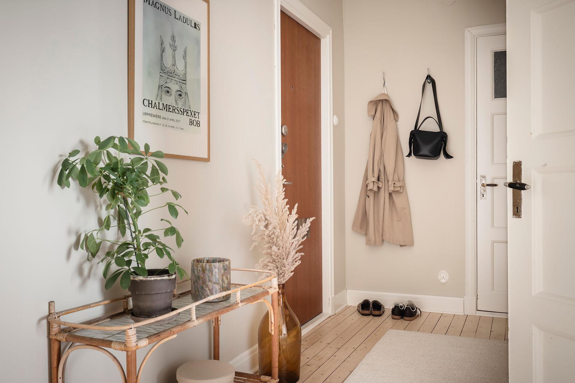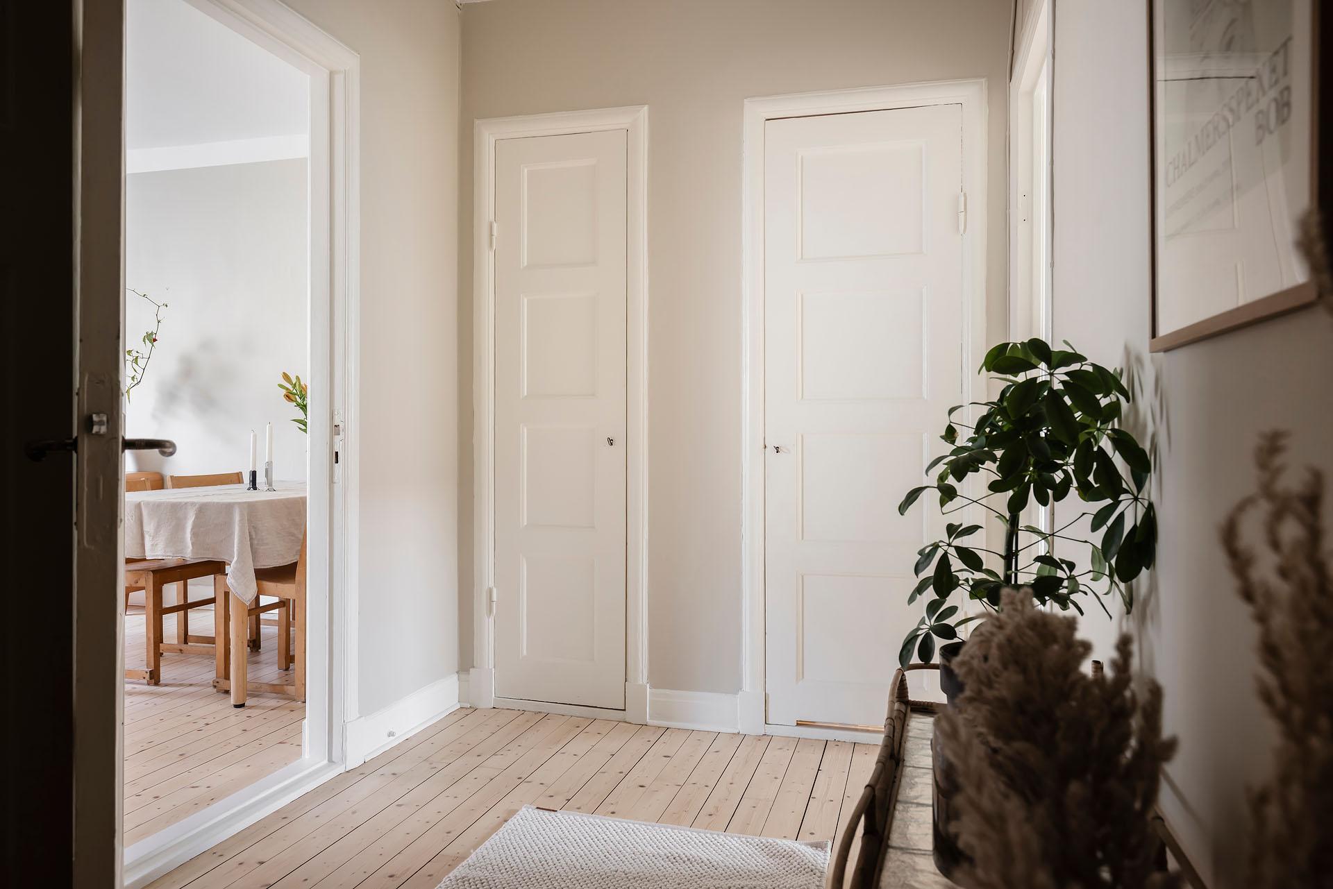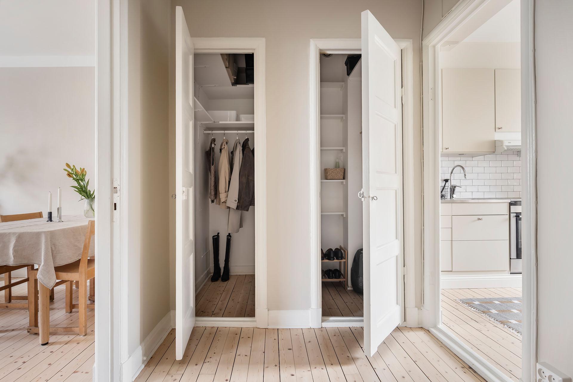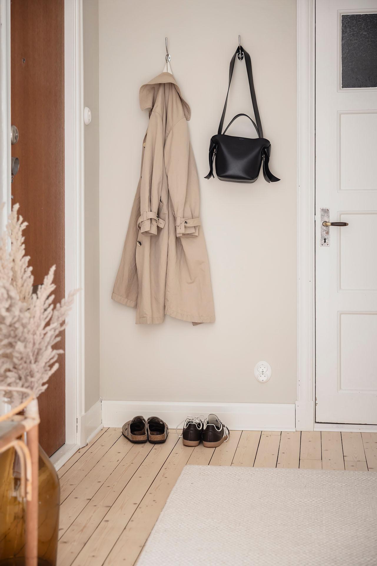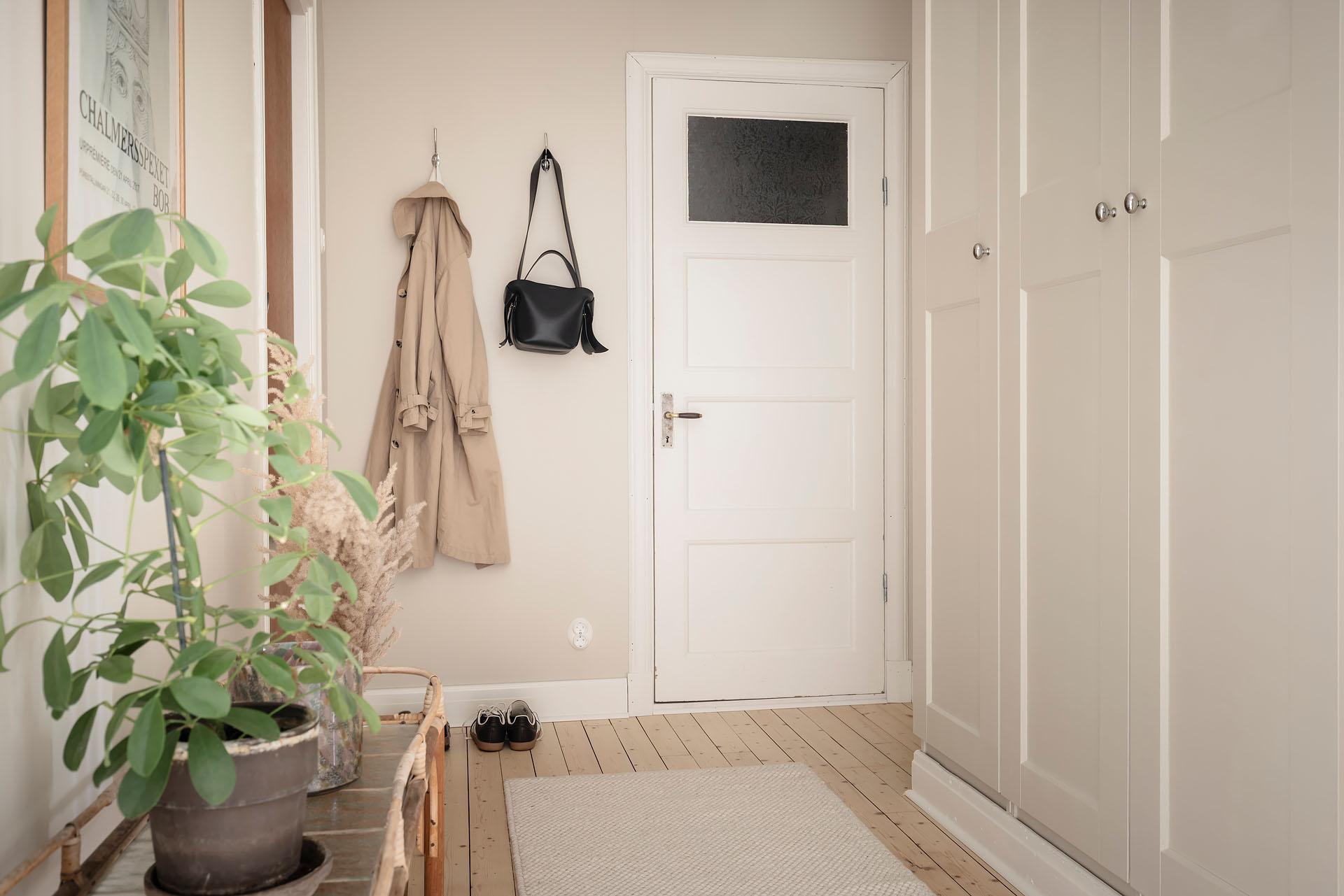 Redan i entrén sätts tonen för lägenheten. Dess väggar är målade i Vitt Te från Jotun, och golvet består av det framtagna brädgolvet som löper vidare in i bostaden. De platsbyggda garderoberna ger god förvaring och ett städat intryck direkt vid entrén. Från hallen nås den stora klädkammaren, som erbjuder förvaring långt utöver det vanliga.