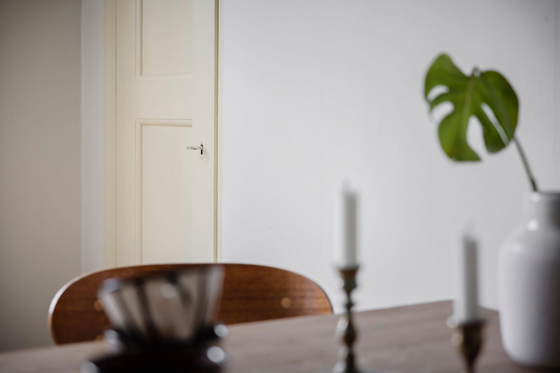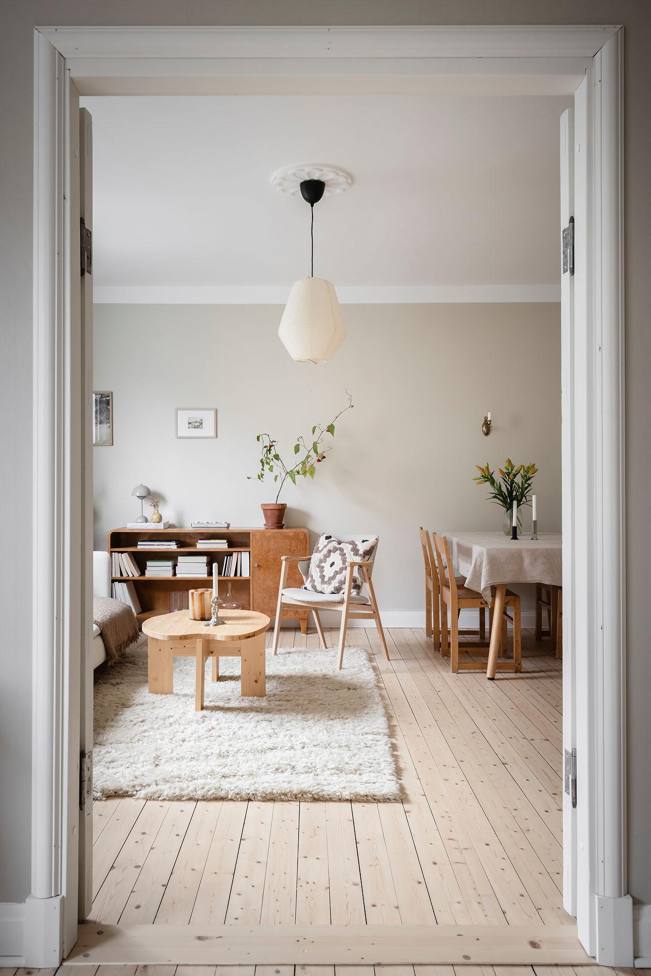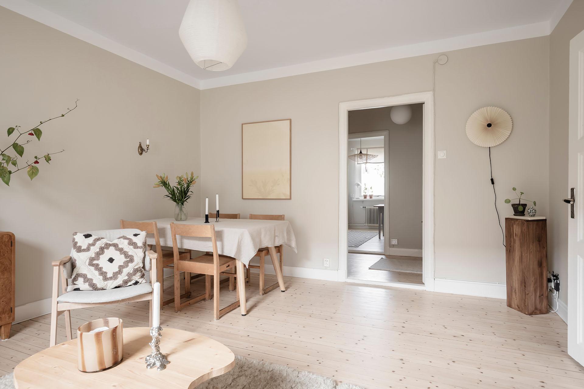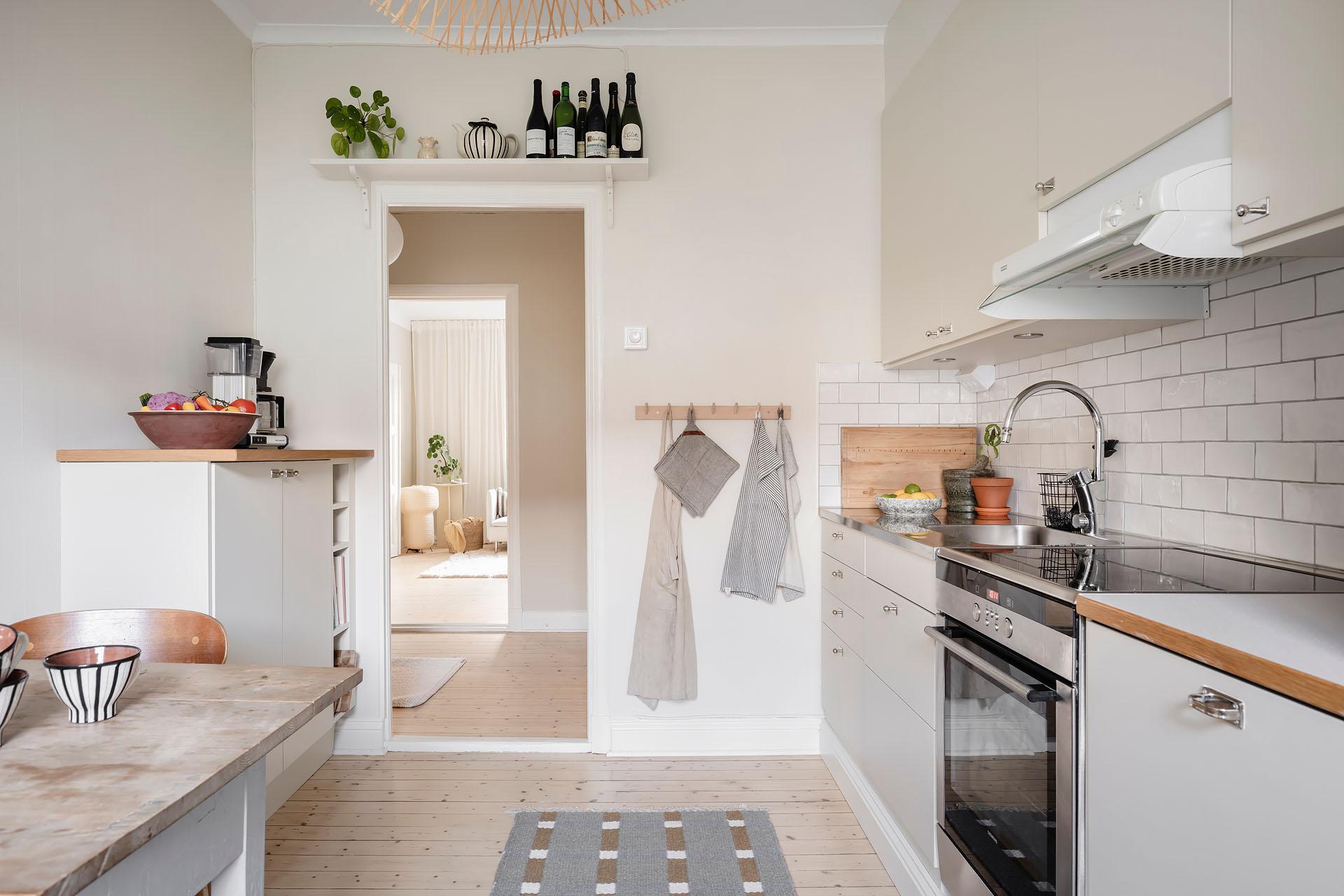 Redan i entrén sätts tonen för lägenheten. Dess väggar är målade i Vitt Te från Jotun, och golvet består av det framtagna brädgolvet som löper vidare in i bostaden. De platsbyggda garderoberna ger god förvaring och ett städat intryck direkt vid entrén. Från hallen nås den stora klädkammaren, som erbjuder förvaring långt utöver det vanliga.