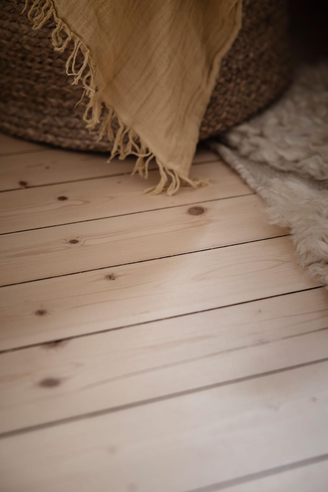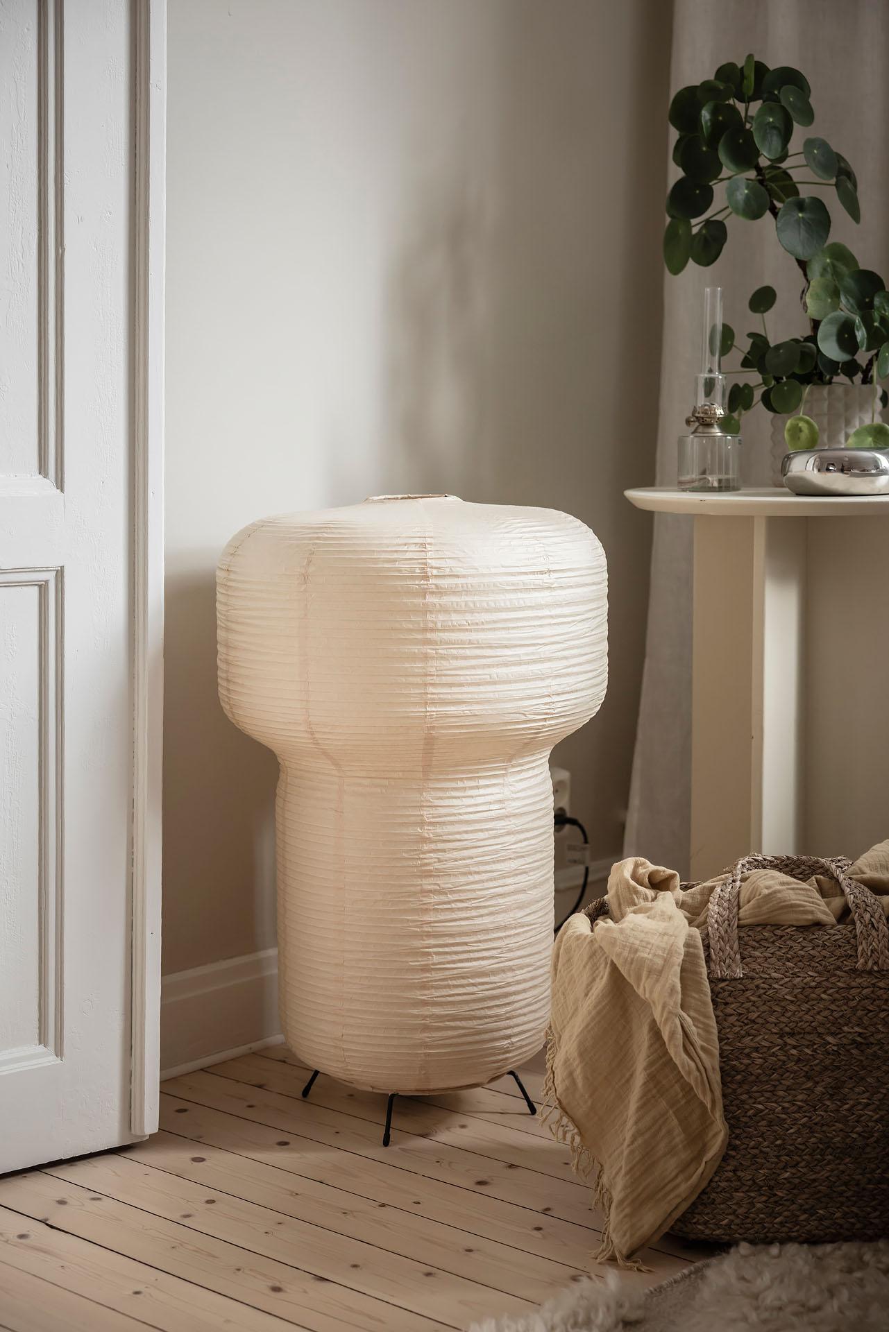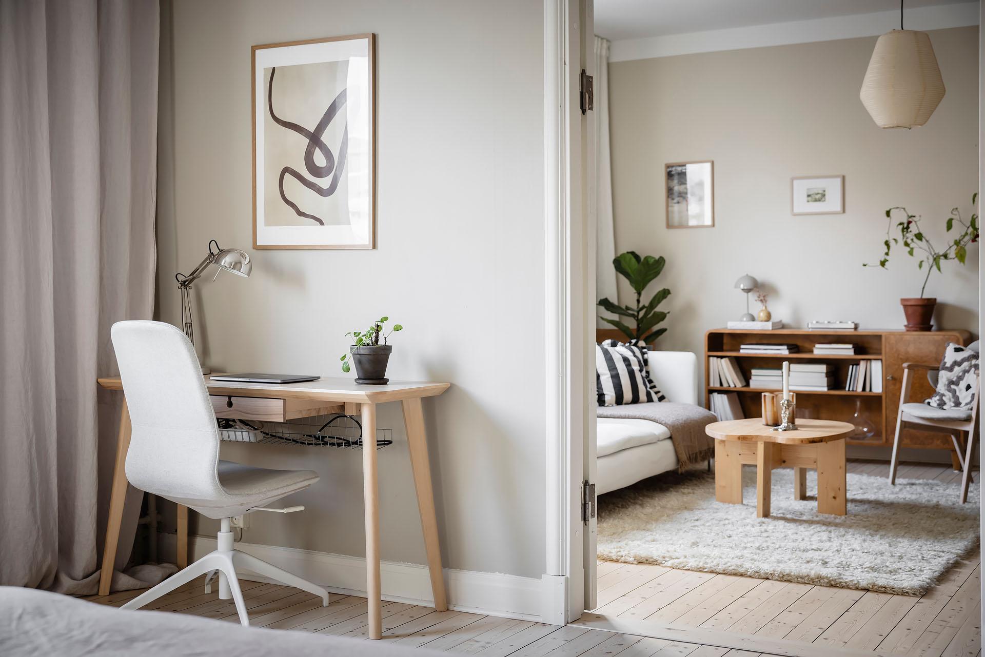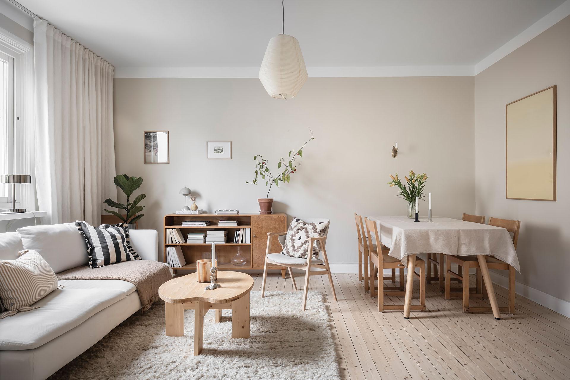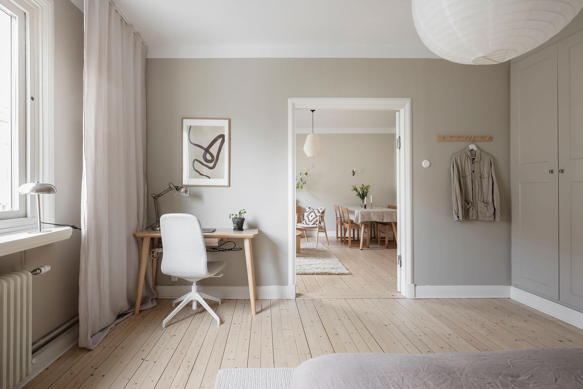 Redan i entrén sätts tonen för lägenheten. Dess väggar är målade i Vitt Te från Jotun, och golvet består av det framtagna brädgolvet som löper vidare in i bostaden. De platsbyggda garderoberna ger god förvaring och ett städat intryck direkt vid entrén. Från hallen nås den stora klädkammaren, som erbjuder förvaring långt utöver det vanliga.