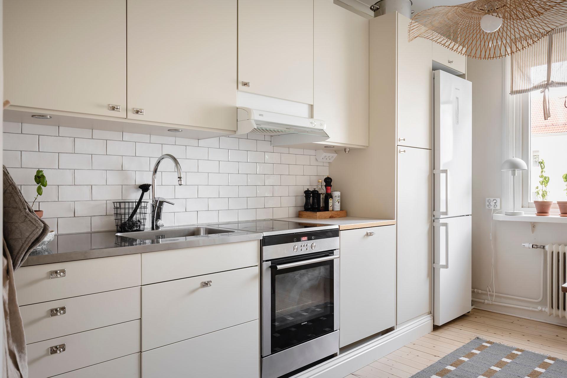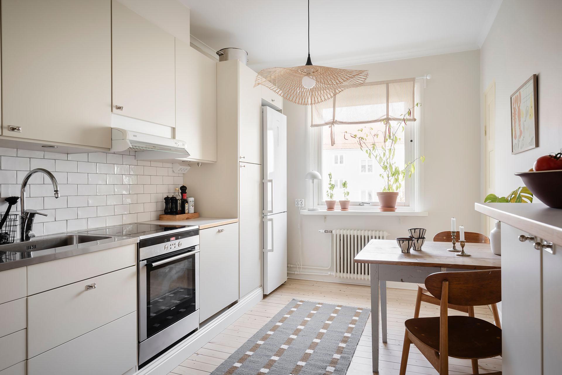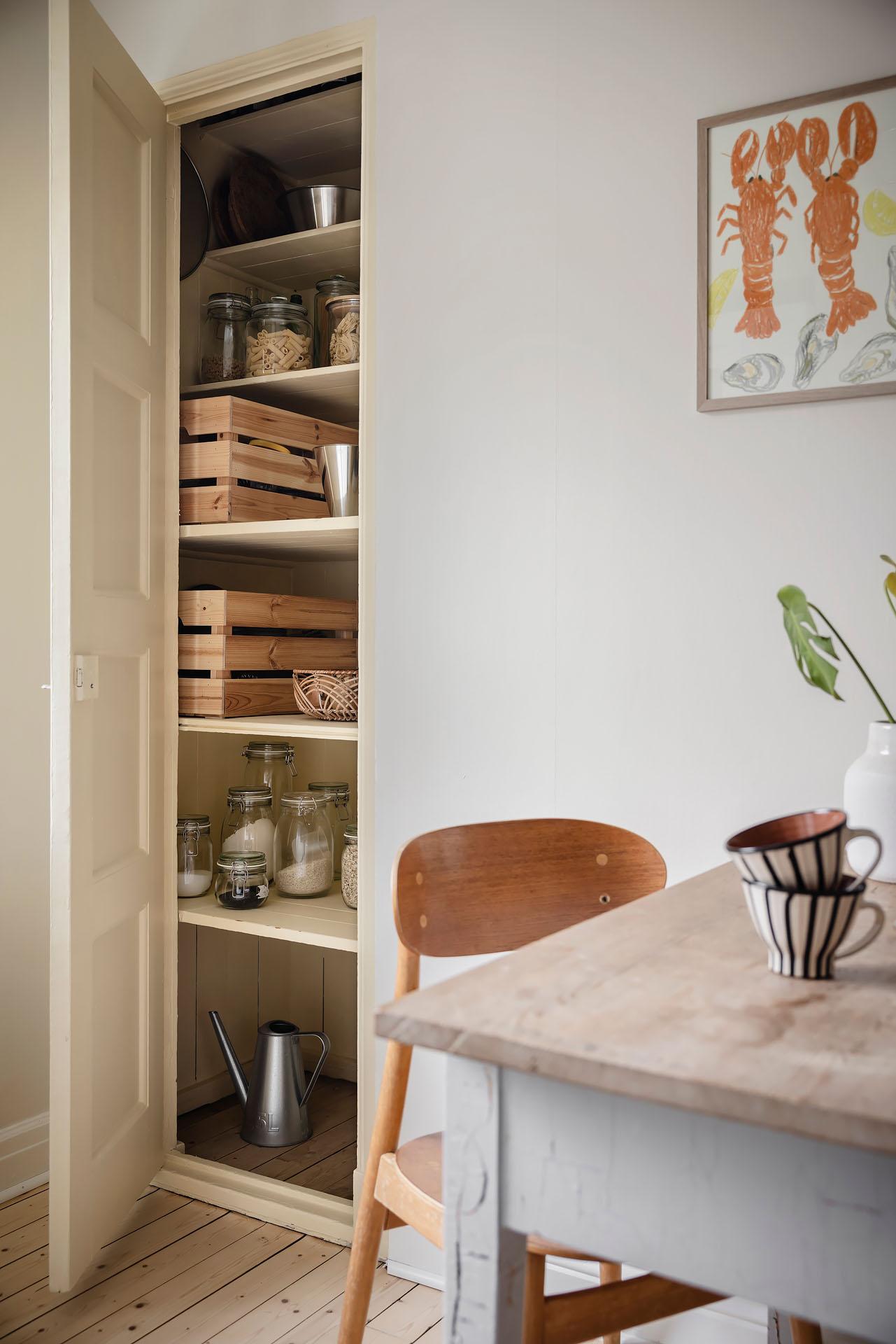 Köket kommer från Epoc och installerades 2019, då även diskmaskin (Asko), kyl/frys (Samsung), induktionshäll (Siemens) och ugn (siemens) byttes. Under 2025 gjordes en varsam uppdatering där väggarna målades i Jotuns Sans och luckorna i kulören Soft. Den klassiska Perstorpsskivan Virrvarr binder fint samman det nya och det tidstypiska. Det bevarade skafferiet är inte bara ett charmigt inslag, utan ger även utmärkt förvaring.