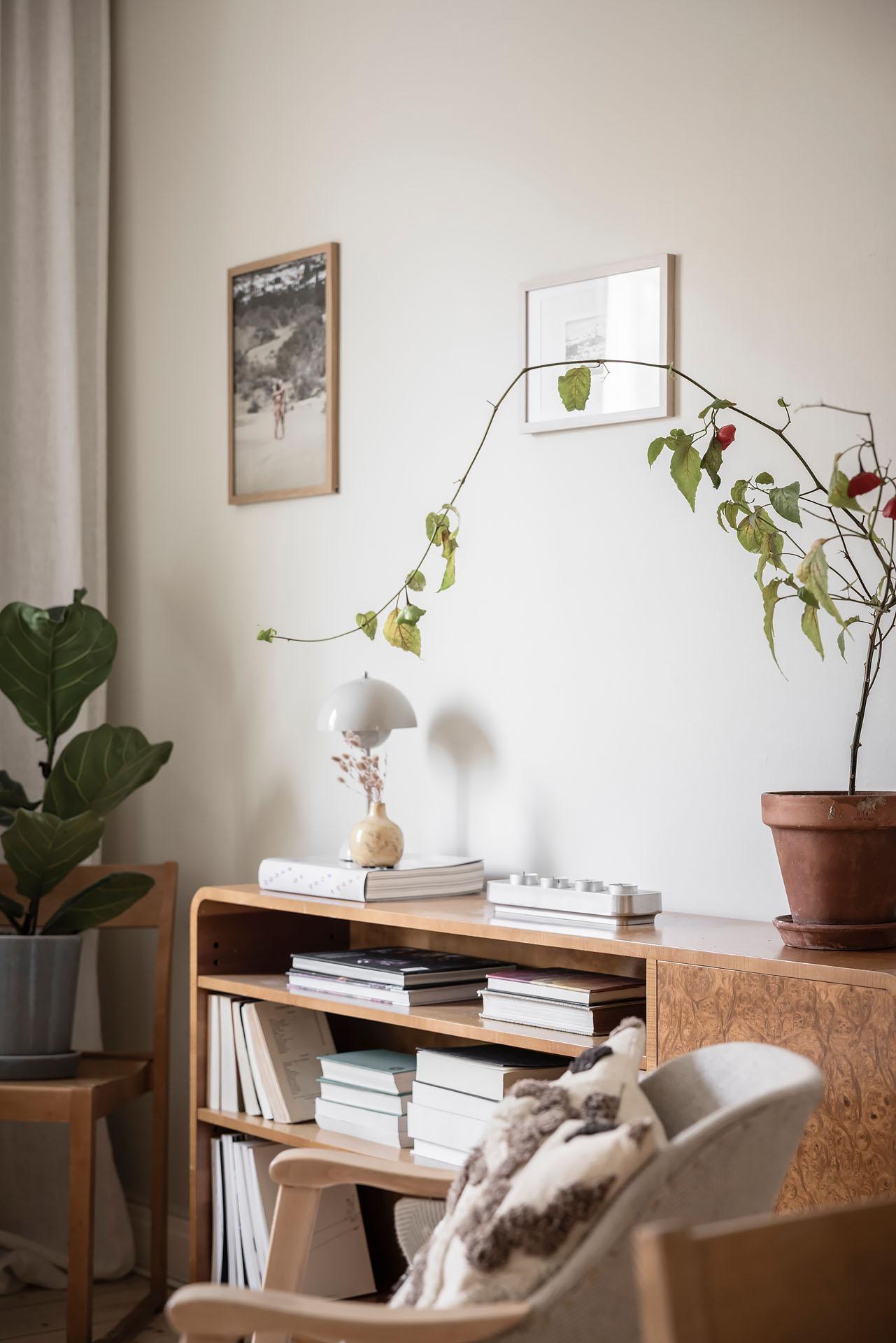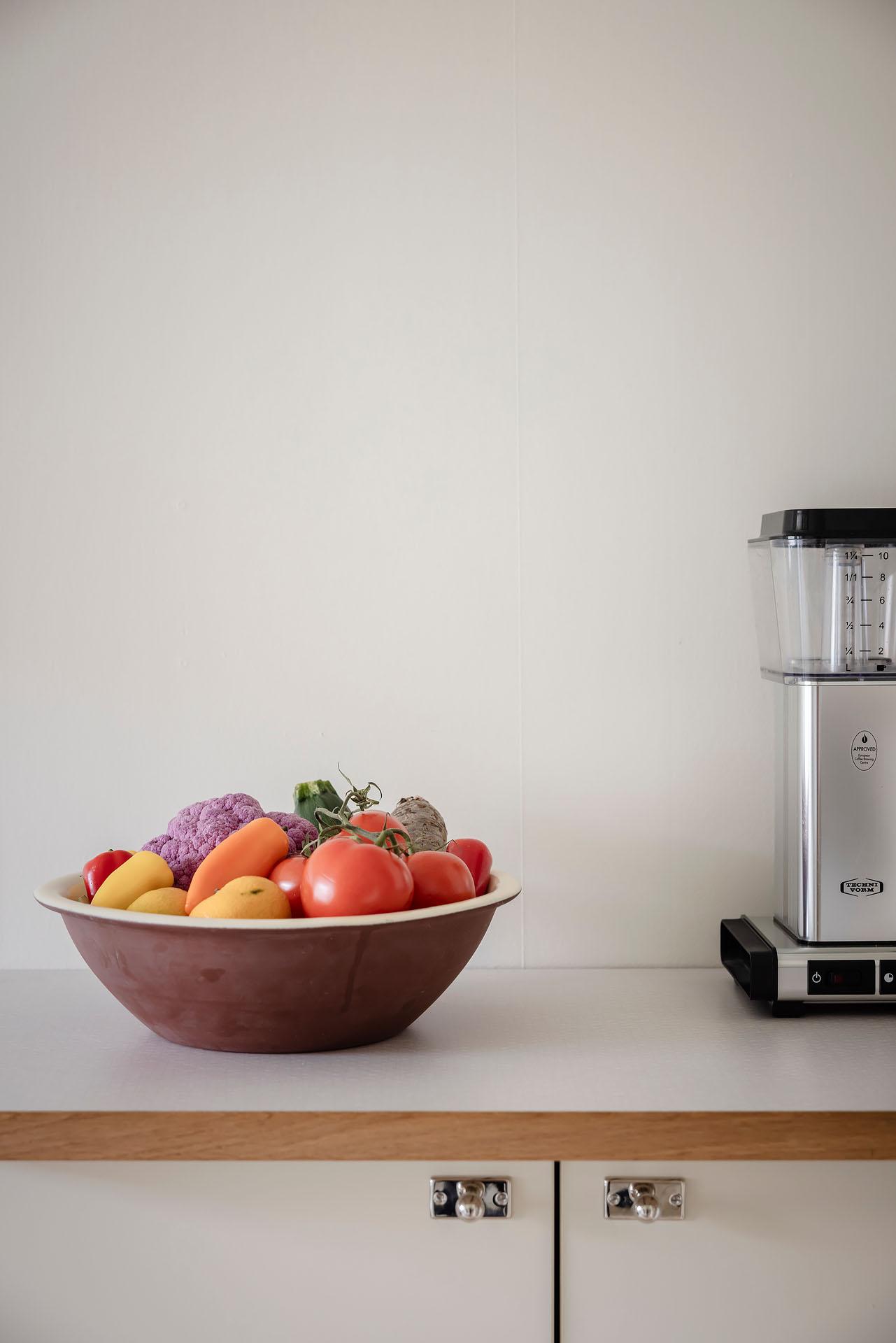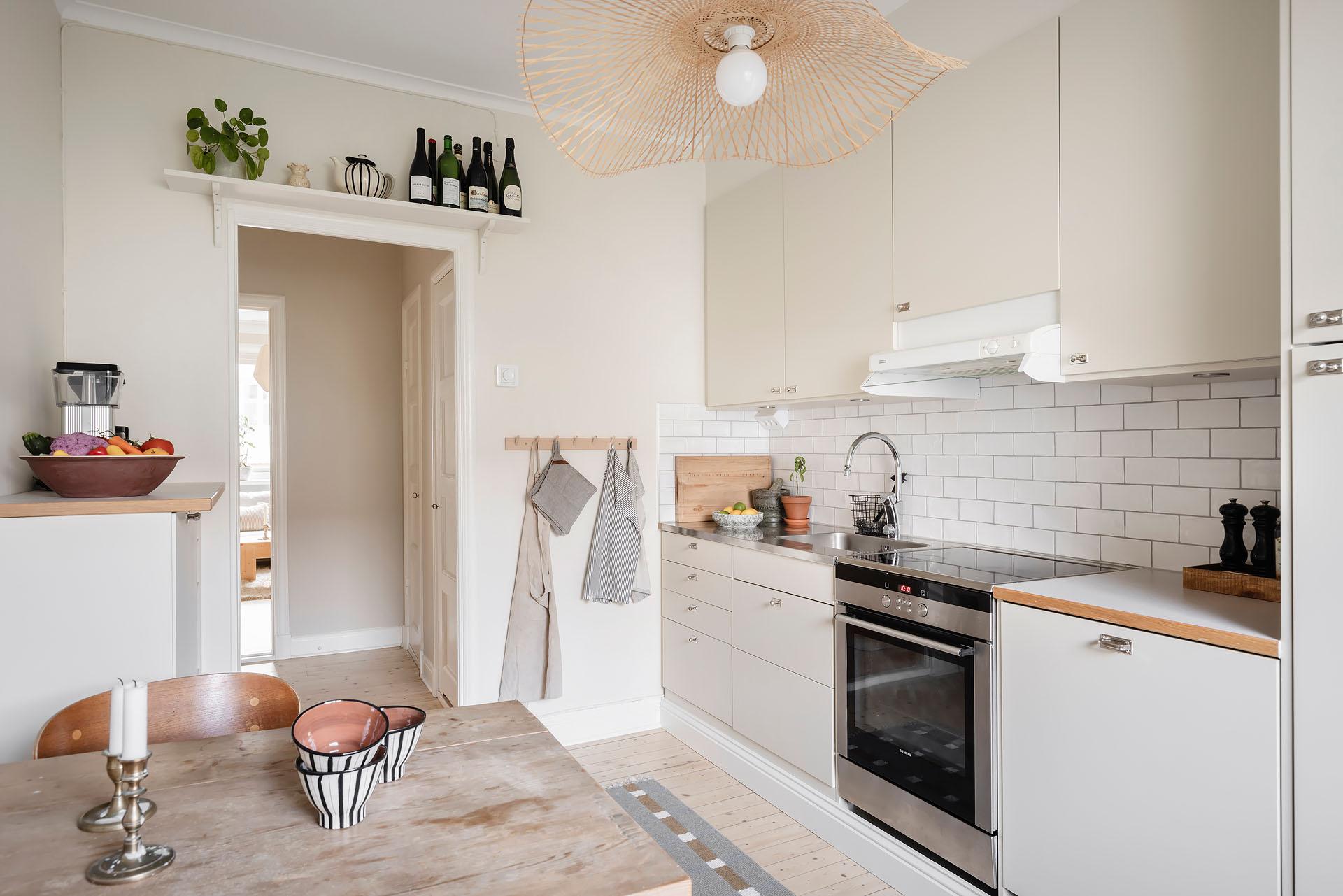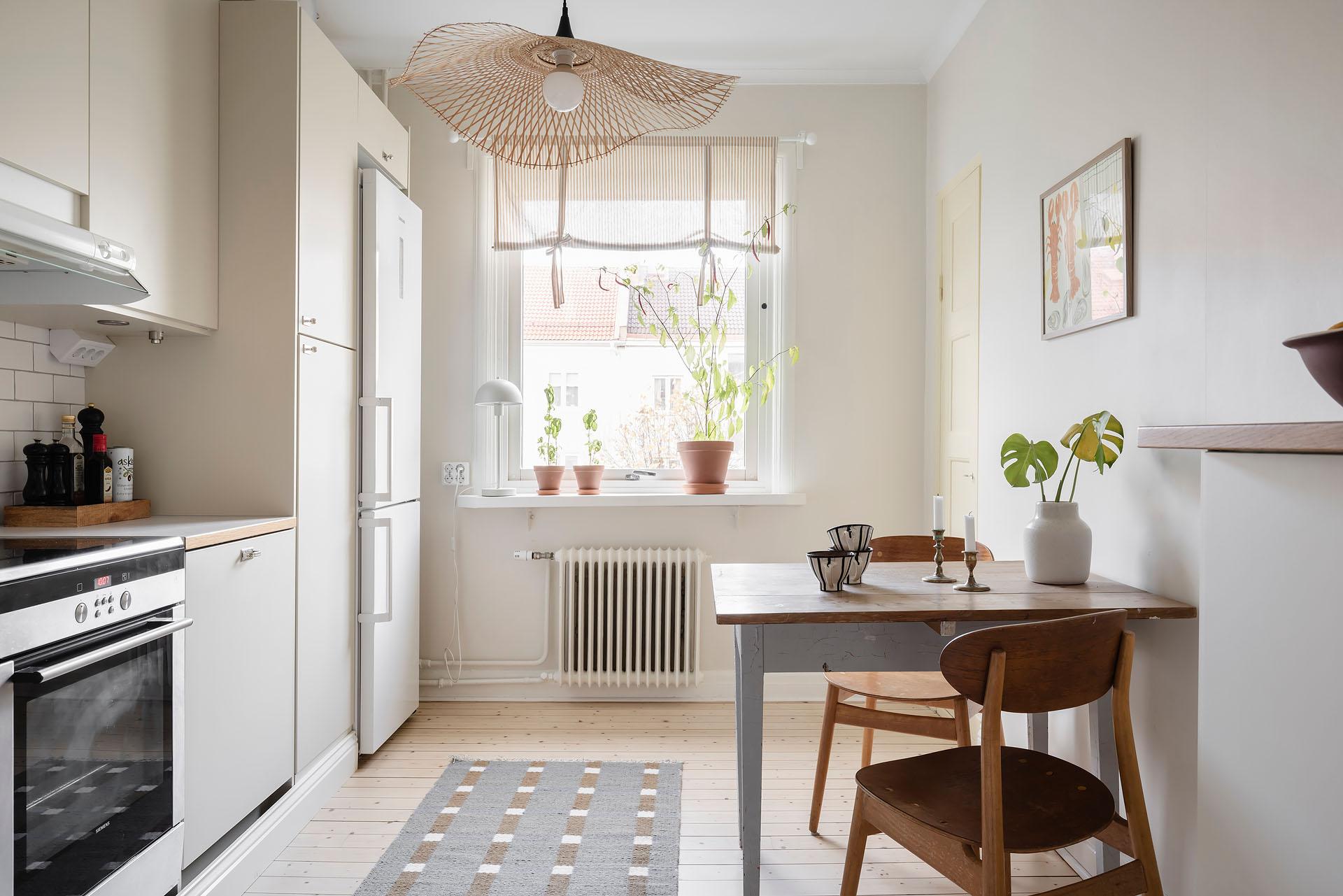 Köket kommer från Epoc och installerades 2019, då även diskmaskin (Asko), kyl/frys (Samsung), induktionshäll (Siemens) och ugn (siemens) byttes. Under 2025 gjordes en varsam uppdatering där väggarna målades i Jotuns Sans och luckorna i kulören Soft. Den klassiska Perstorpsskivan Virrvarr binder fint samman det nya och det tidstypiska. Det bevarade skafferiet är inte bara ett charmigt inslag, utan ger även utmärkt förvaring.