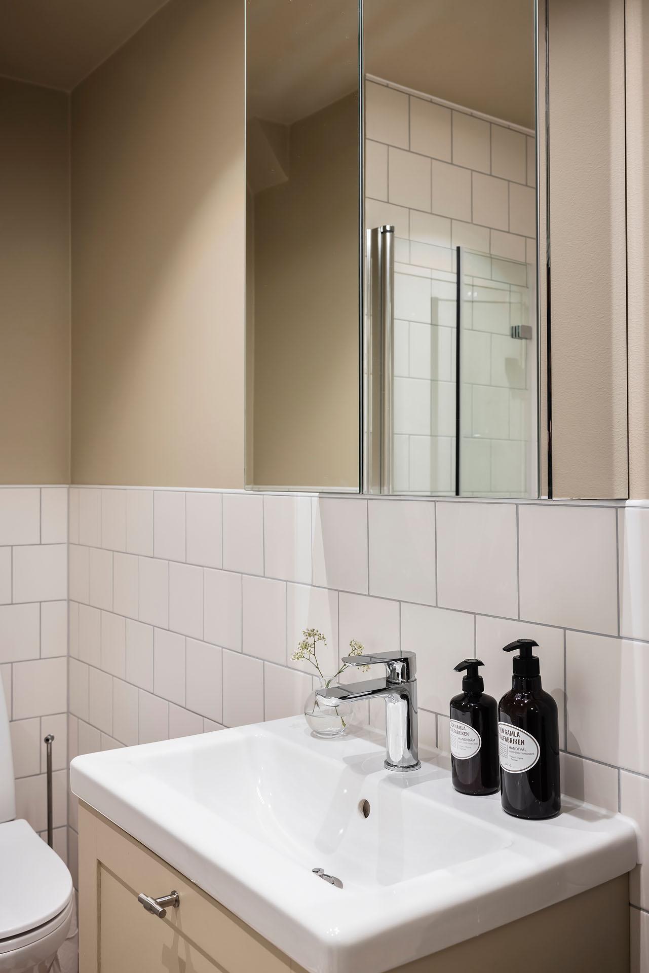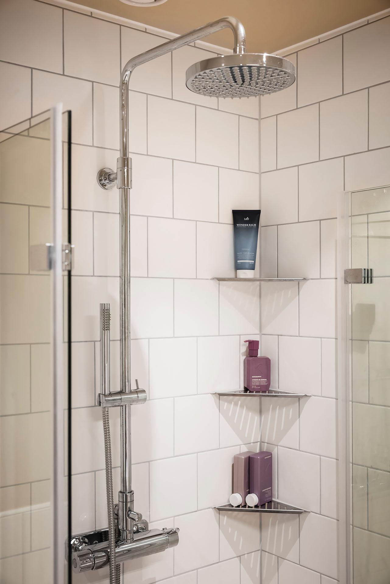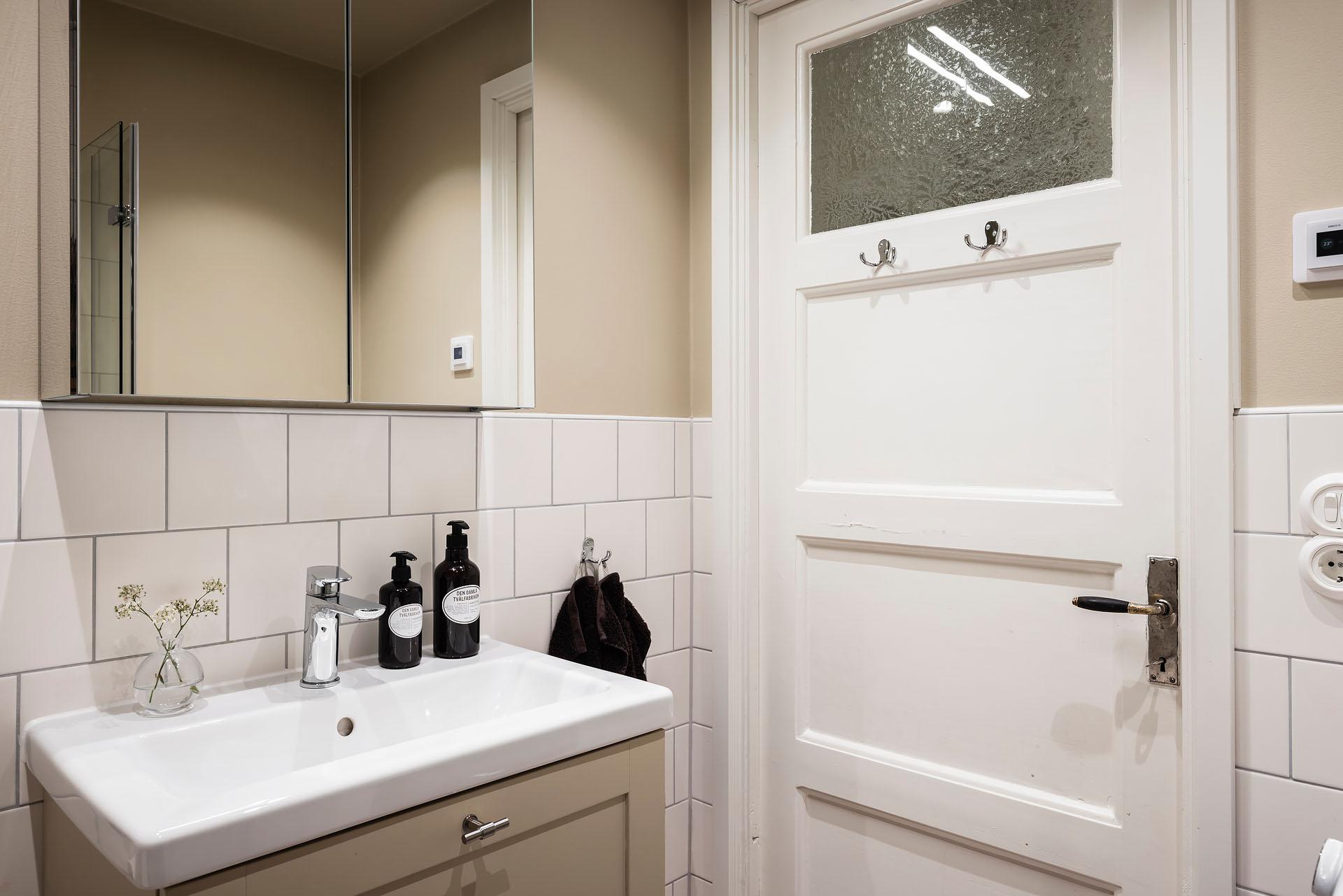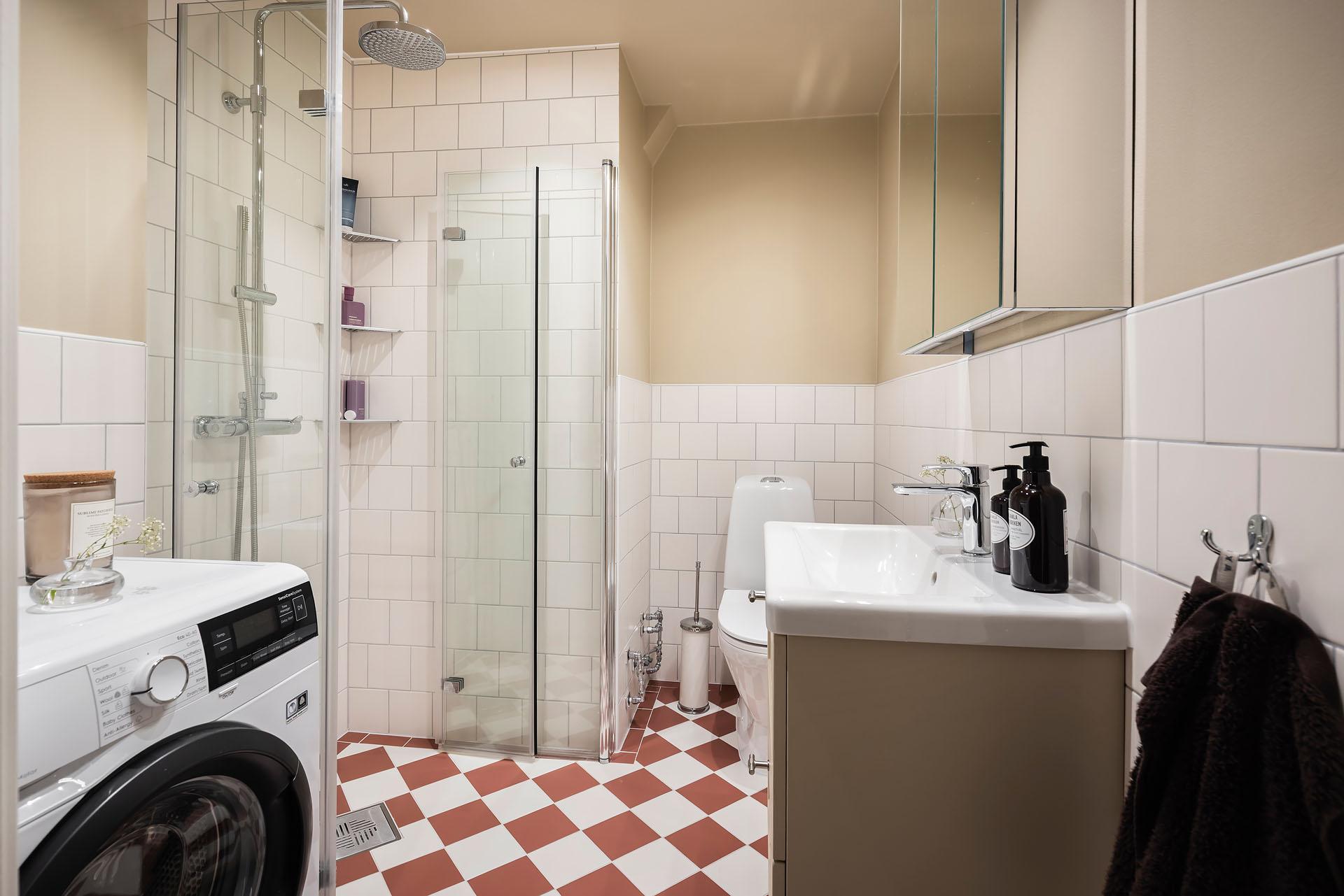 Badrummet helrenoverades av fackman 2025 och byggdes då även ut. Golvet är kaklat i klassiskt schackrutigt, och väggarna är delvis klädda med vitt kakel, delvis målade i Jotuns Humble Yellow. Duschen är helkaklad och kommoden är målad i samma kulör som väggarna för en sammanhållen känsla. Golvvärme ger extra komfort. Tvättmaskin från Electrolux installerades 2025. Samtliga kvitton och garantier finns.