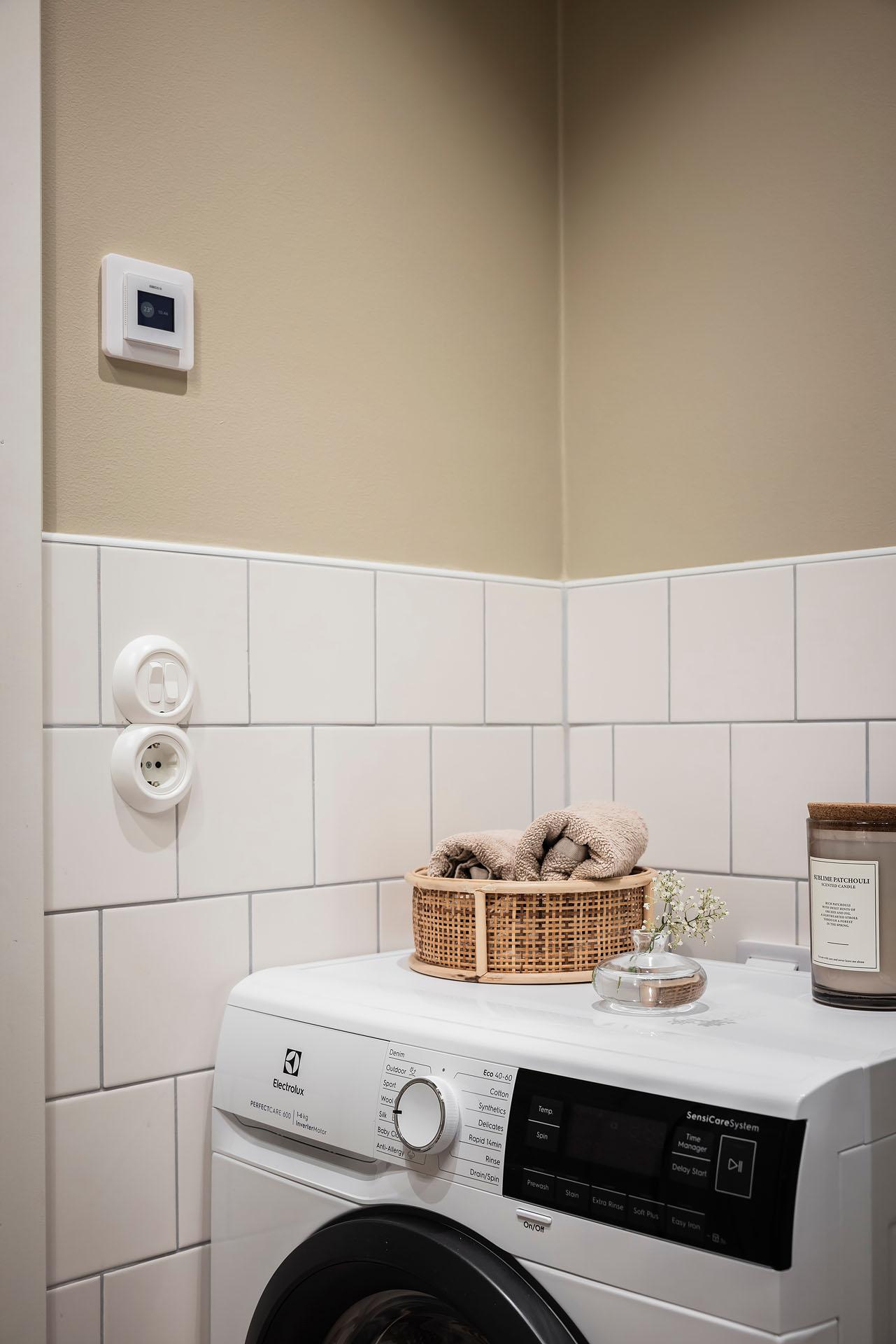 Gemensam tvättstuga med torkrum finns i källaren.