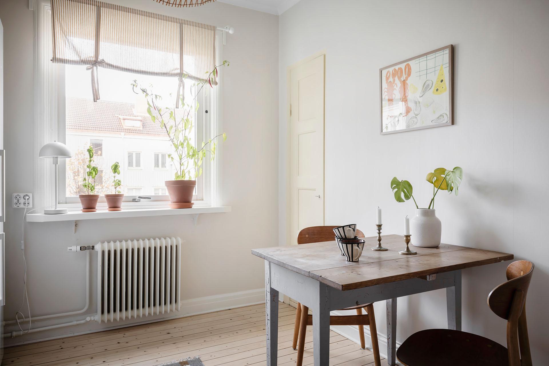 Ett ljust och luftigt rum där originalbrädgolv, bevarade snickerier och väggar målade i Vitt Te från Jotun ger en varm och tidlös atmosfär. Dubbeldörrarna mot sovrummet förstärker rymden och skapar en vacker kontakt mellan rummen. Rummet vetter mot återvändsgata och det lagom höga läget på våning två gör att man får ett vackert ljusinsläpp med direkt sol under dagens första del. Den som är sugen på ett projekt och gillar stora kök kastar med fördel ett öga på den alternativa planlösningen. Kontakta ansvarig mäklare för mer information.