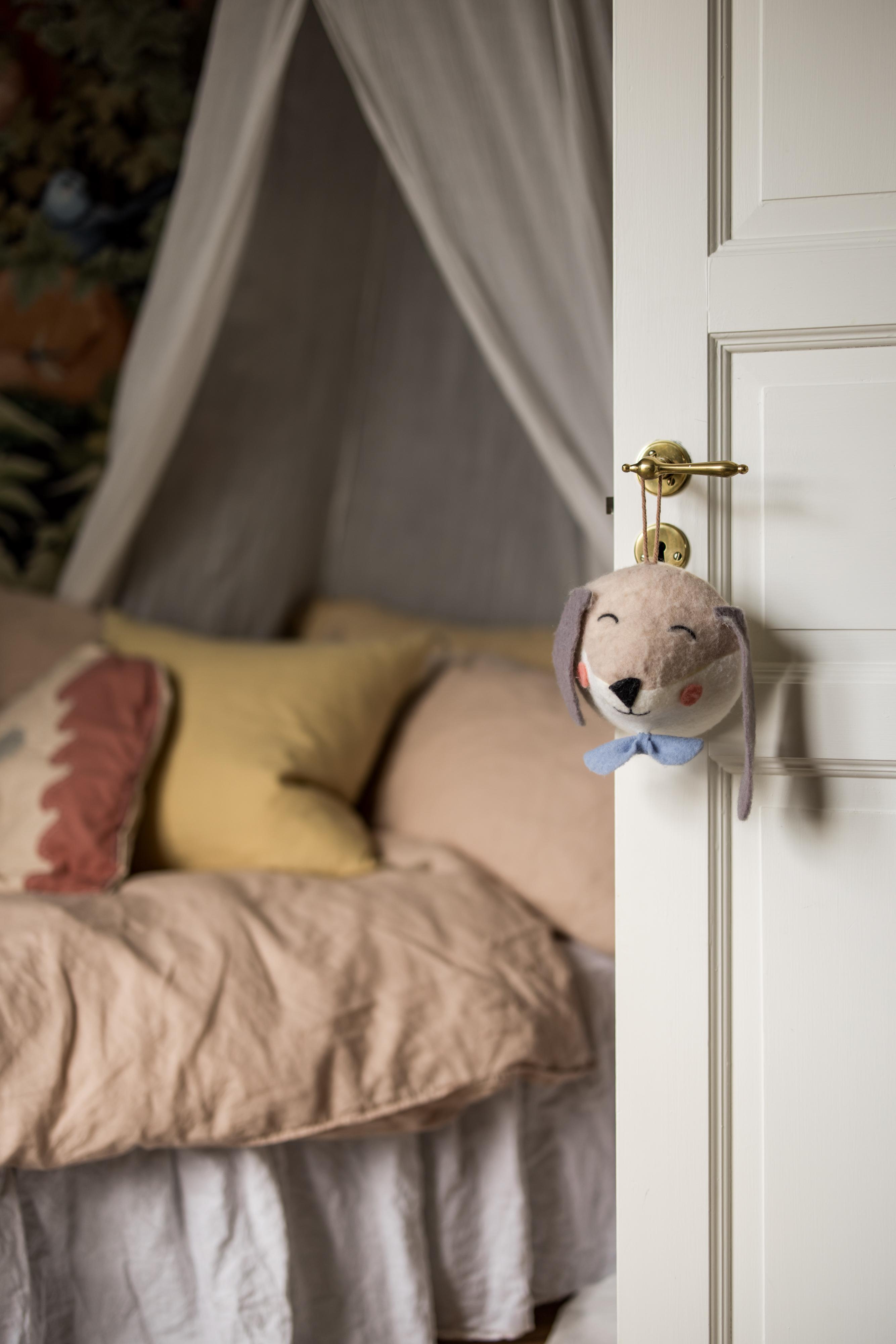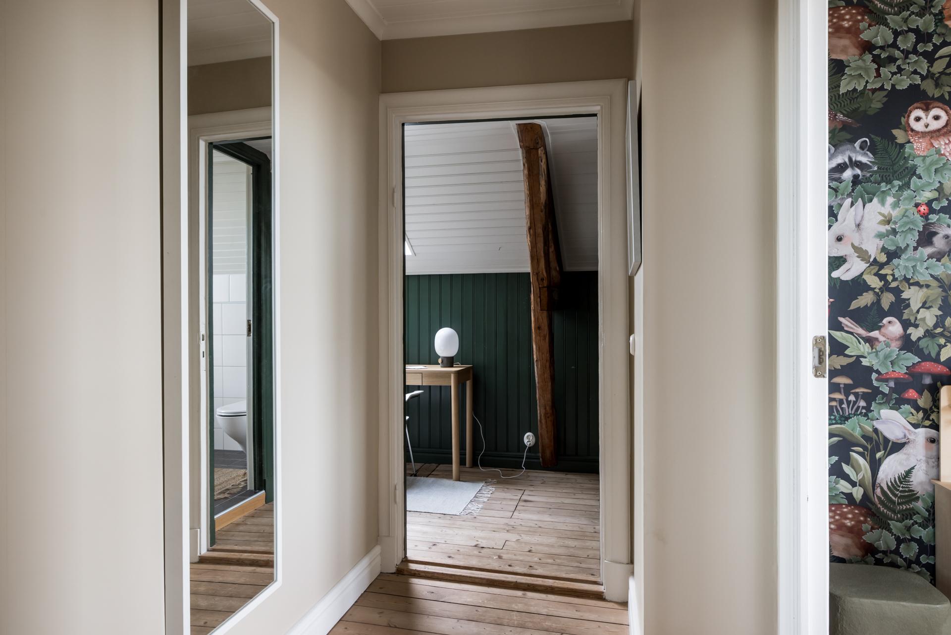 En passage binder samman den övre hallen med två sovrum och en klädkammare. Brädgolven är framtagna och i det större rummet, med fantastisk utsikt över Sävedalen, pryds väggarna av William Morris tapet ”Blackthorn”. Det mindre är tapetserat med Fleur Harris charmiga barntapet ”In the Woods”.