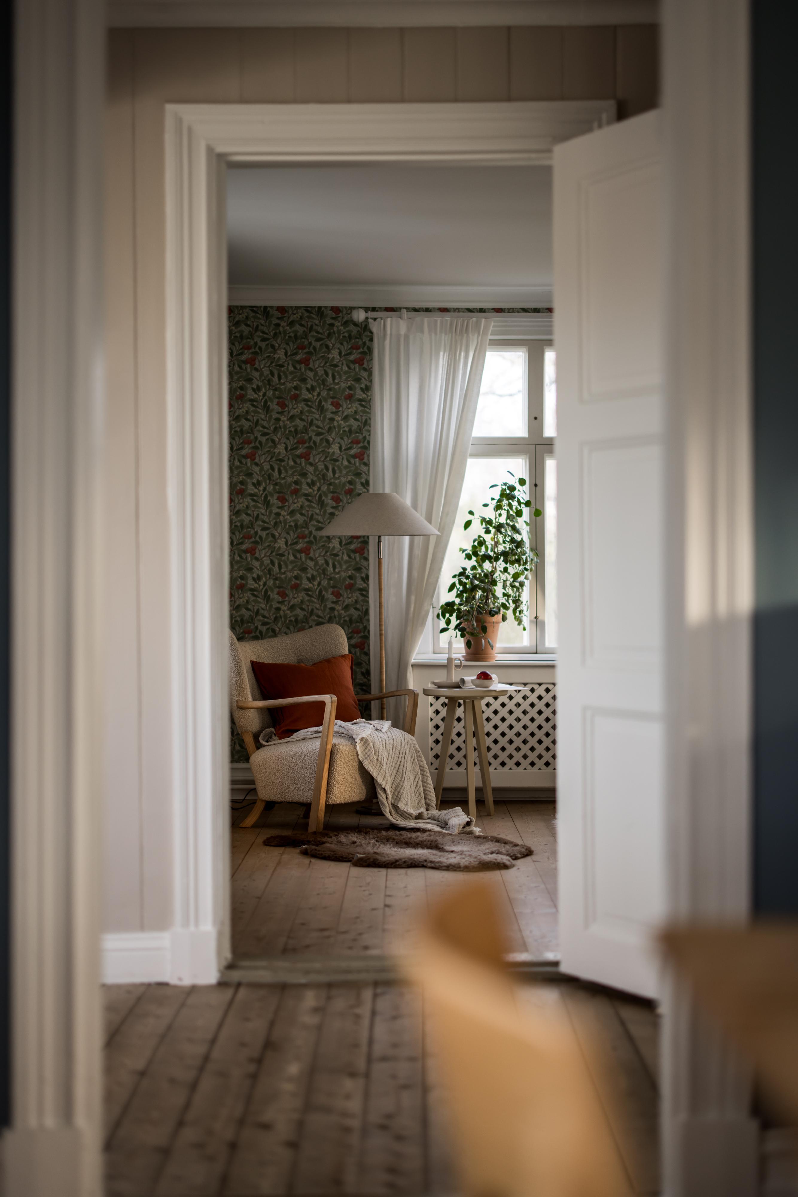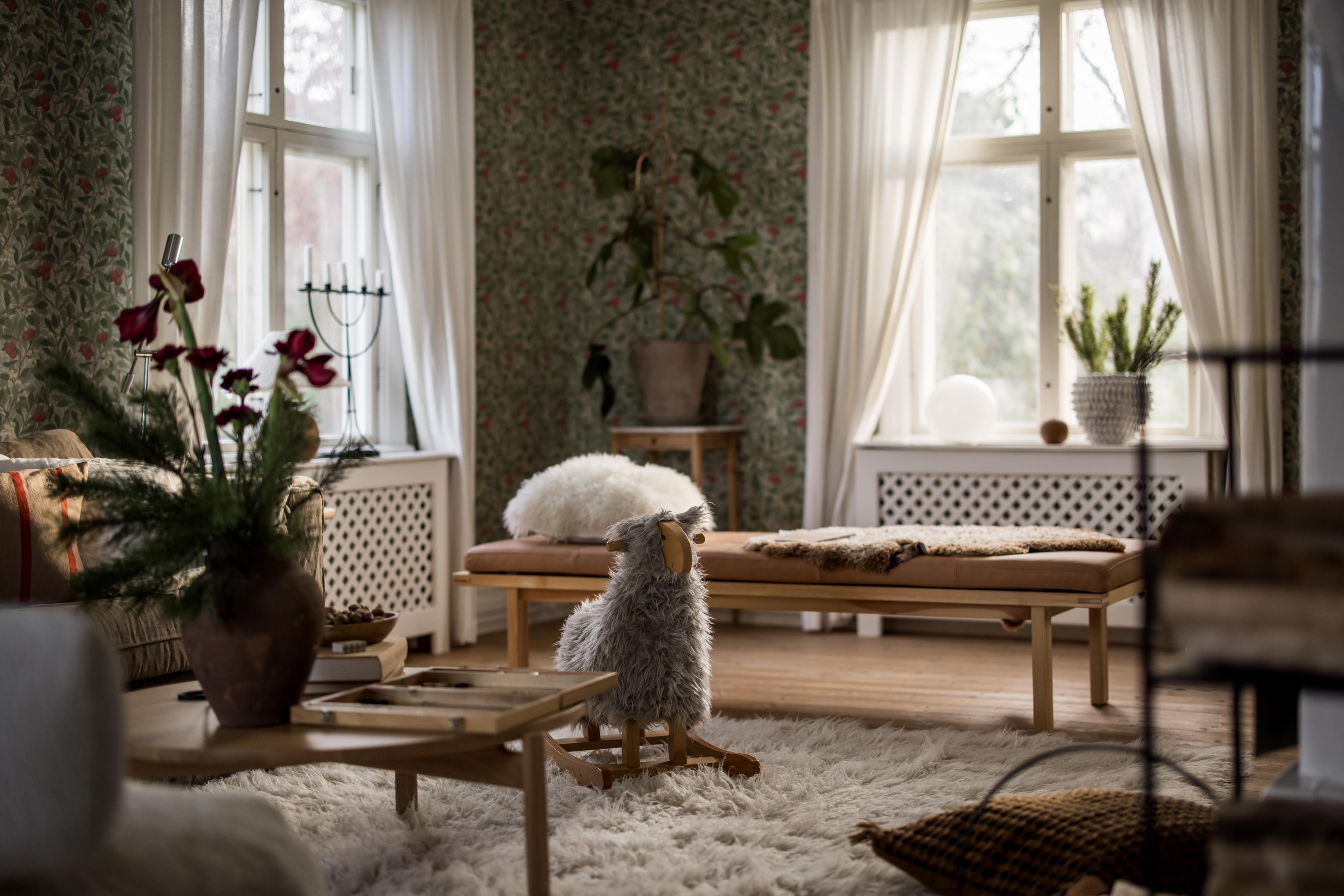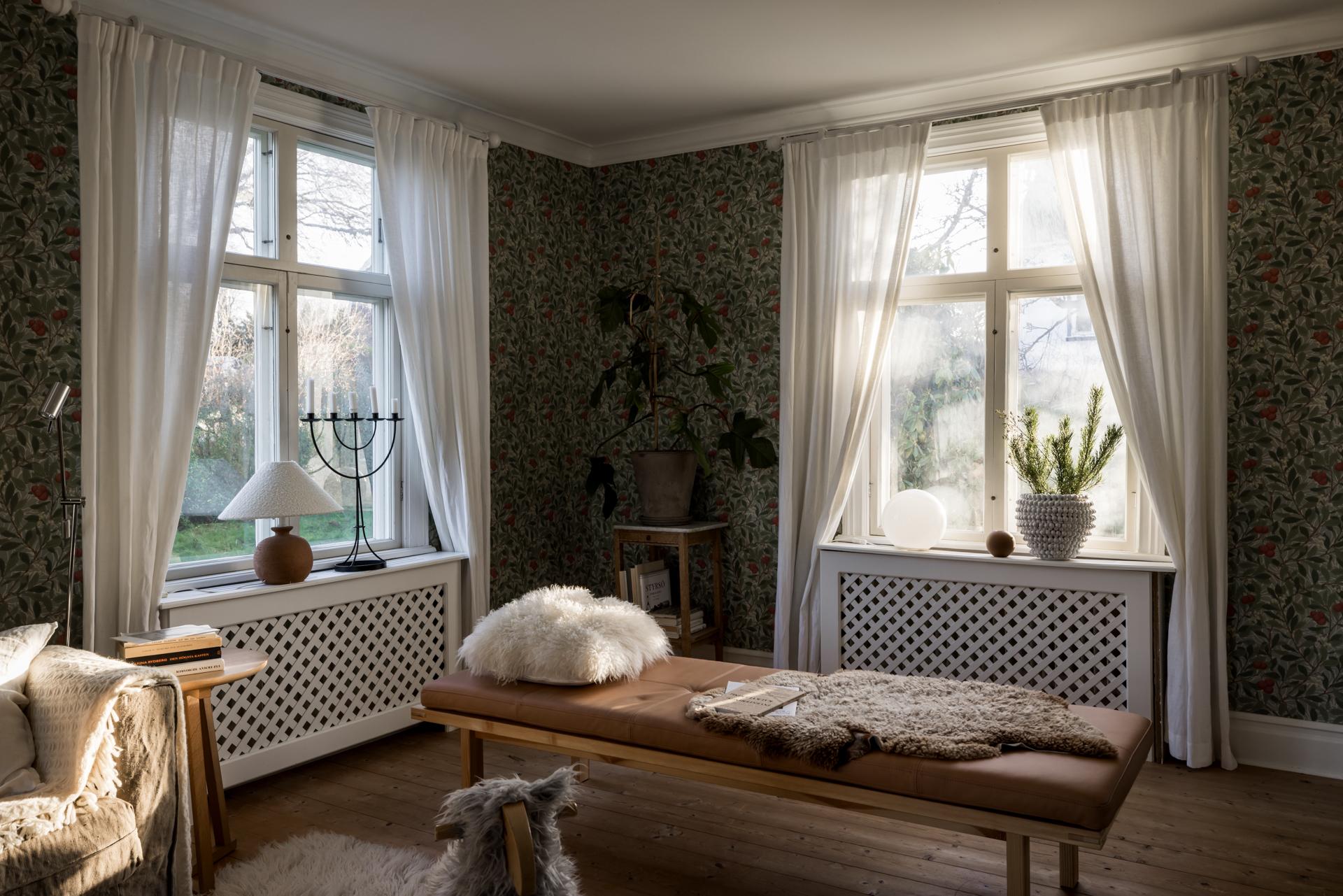 Fyra fönster i tre olika väderstreck fyller husets stora vardagsrum med ljus. Efter kvällsmörkrets inbrott är det mysigt att elda i den vackra kakelugnen som är centralt placerad i rummet. Brädgolvet är framtaget och väggarna tapetserade med William Morris tapet ”Arbutus”.