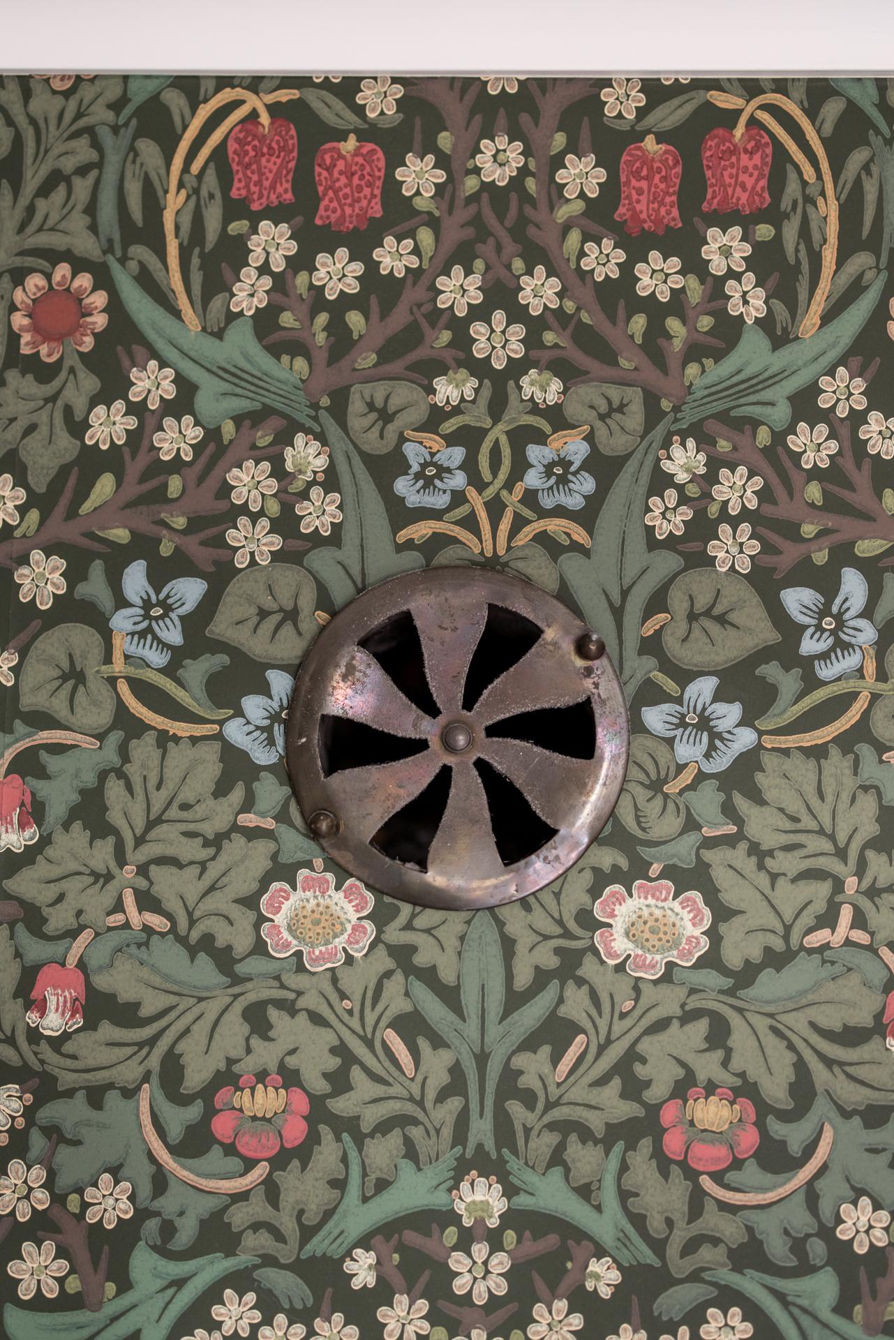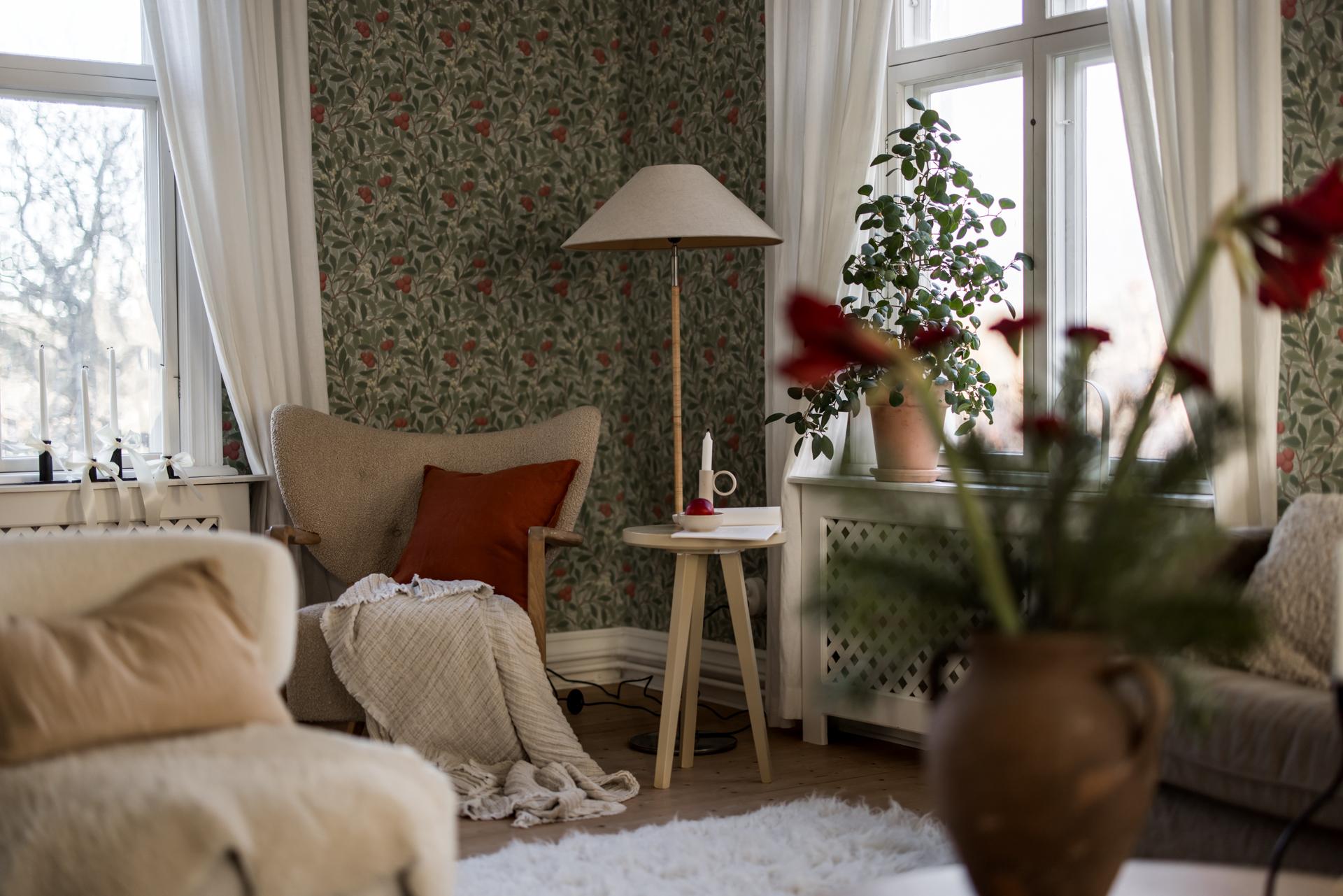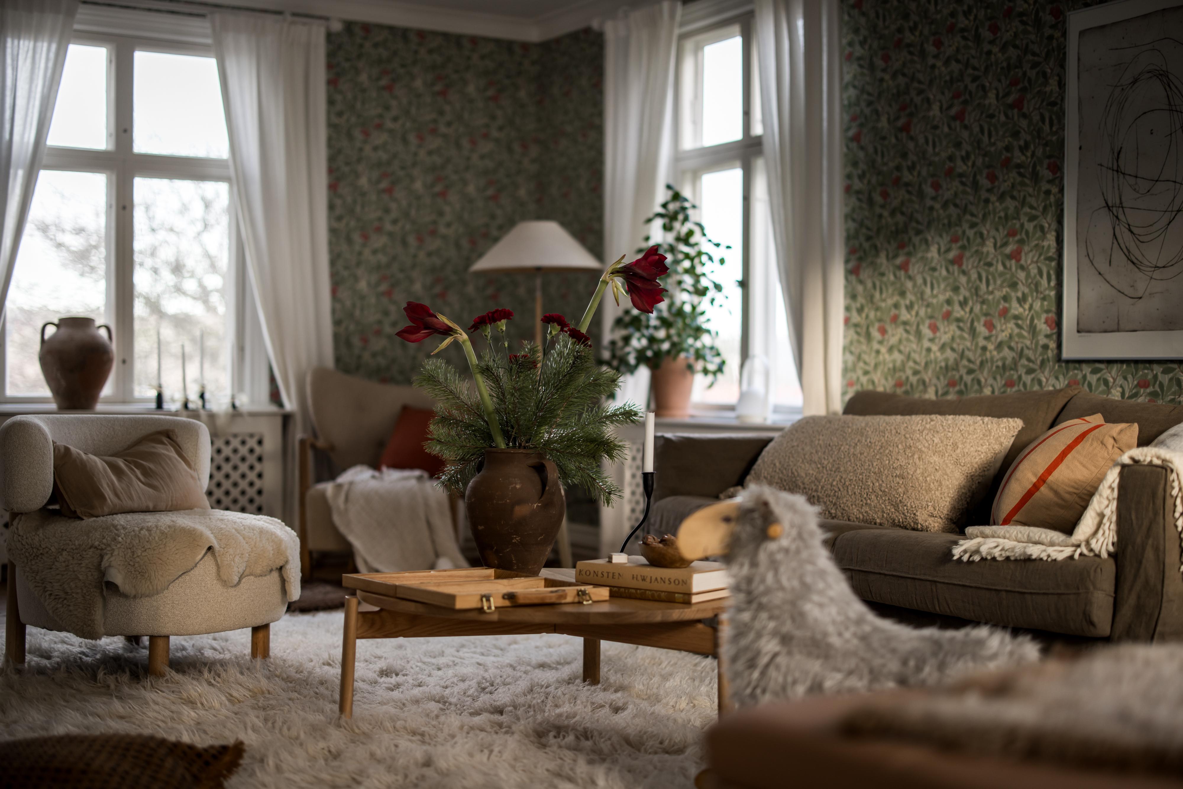 Fyra fönster i tre olika väderstreck fyller husets stora vardagsrum med ljus. Efter kvällsmörkrets inbrott är det mysigt att elda i den vackra kakelugnen som är centralt placerad i rummet. Brädgolvet är framtaget och väggarna tapetserade med William Morris tapet ”Arbutus”.
