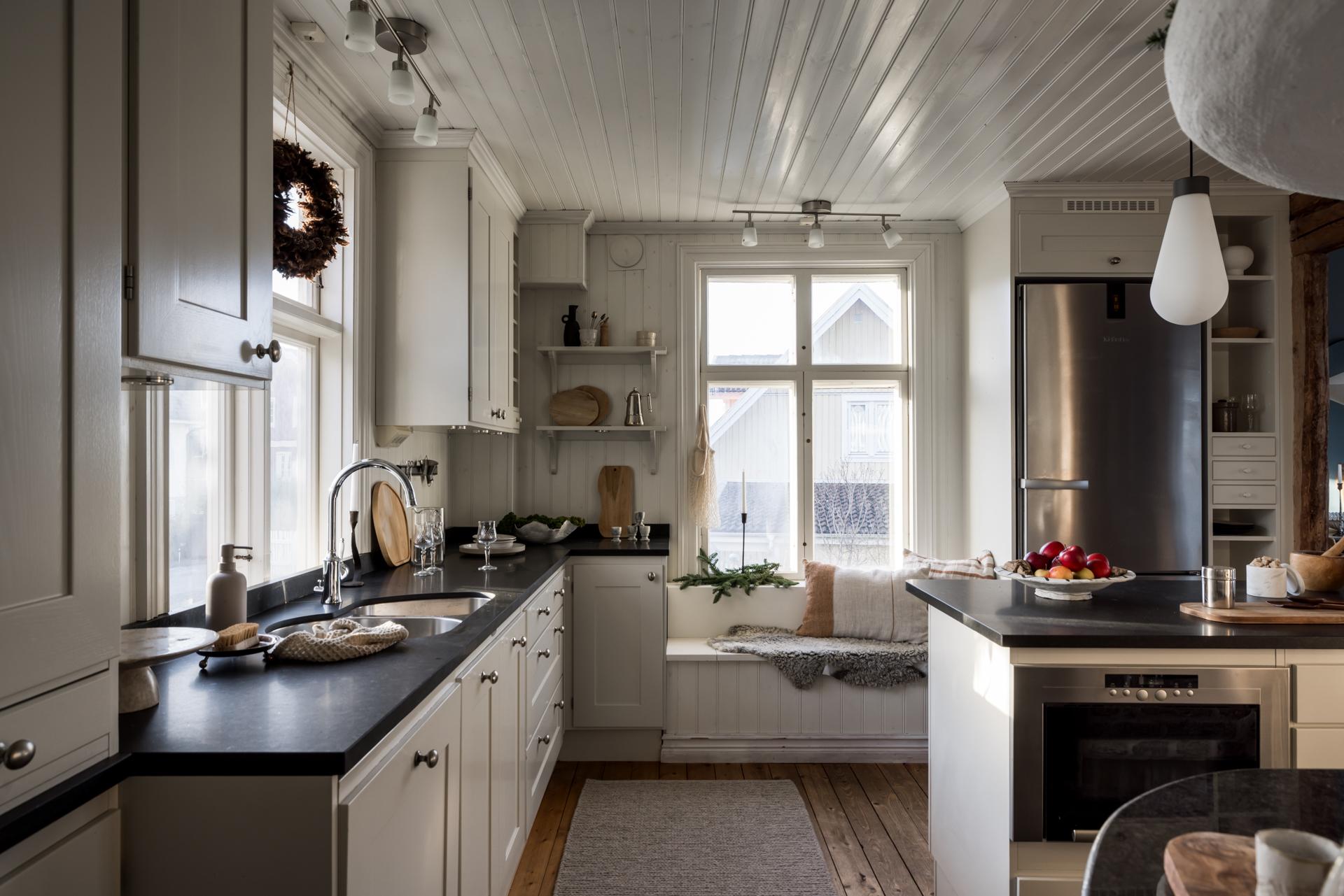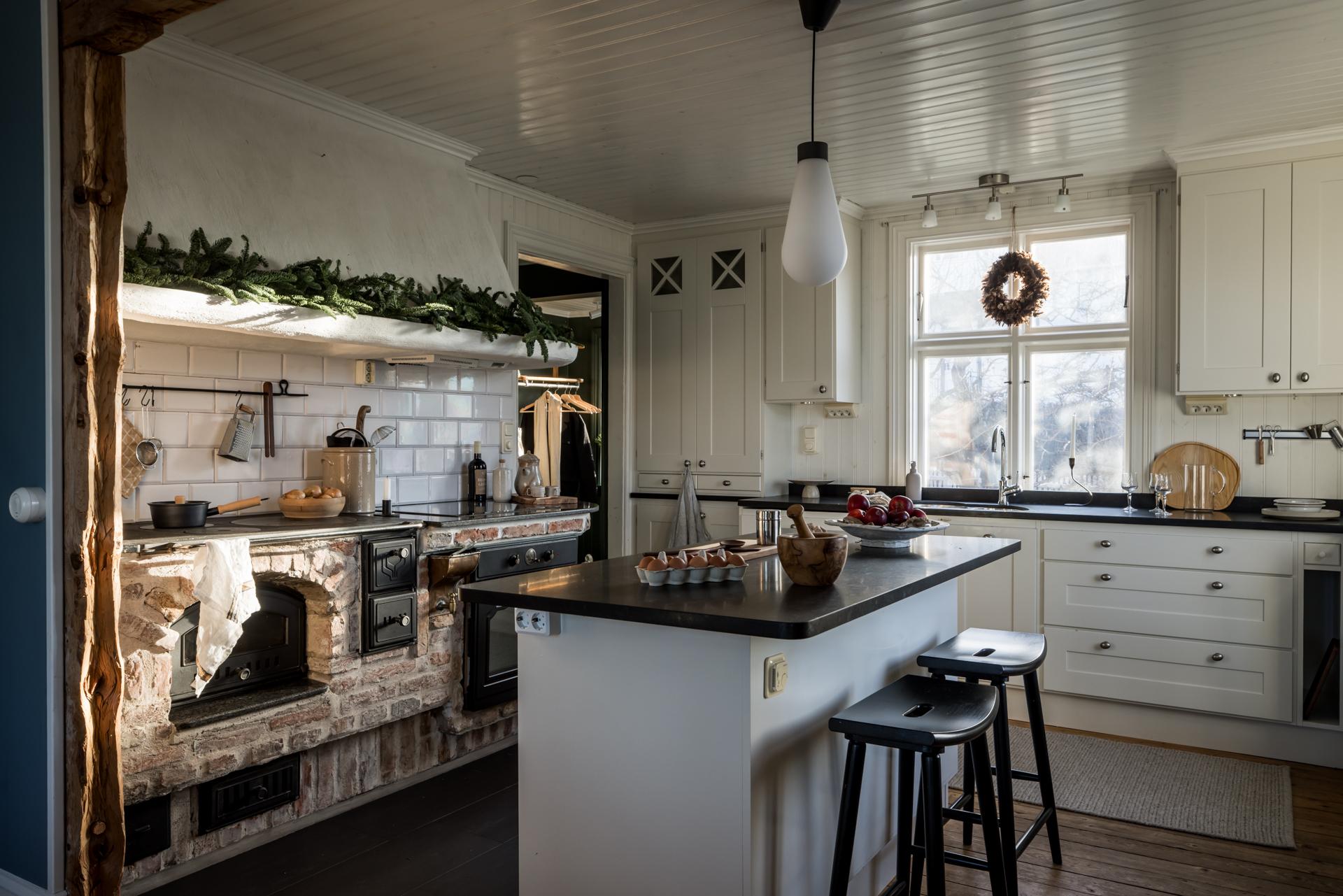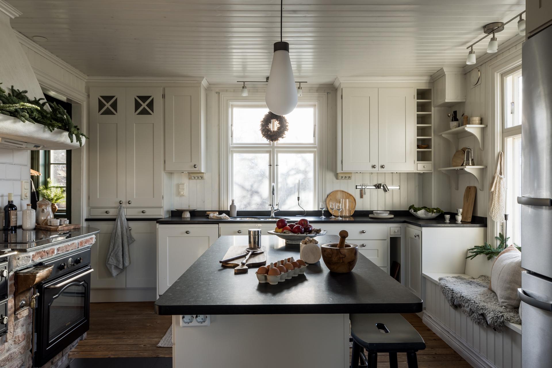 Köket har en lantlig känsla, inte minst tack vare den eldningsbara vedspisen. Även den moderna ugnen i gammaldags stil är inbyggd i spismuren som täcks av en stor och vacker spiskåpa med fläkt ovanför den infällda spishällen. Det är väl tilltaget med både förvaring och arbetsyta, och runt köksön kan familj och vänner samlas och laga mat tillsammans. Den passar också bra som serveringsbänk under de stora middagsbjudningarna. Det finns utrymme för ett par barstolar, och köket har även en platsbyggd sittbänk där gäster kan slå sig ner med ett glas vin medan hemmakockarna rör om i grytorna. Bänkskivorna är i svart sten och de gedigna skåpen från Kvänum har vita spegelluckor och lådor. Kylen/frysen och mikron är i rostfri design medan diskmaskinen, som installerades 2022, är integrerad i inredningen. Brädgolvet är framtaget och i själva arbetsdelen har man lagt in grafitgrå klinker. Väggarna är klädda med vitmålad pärlspont.