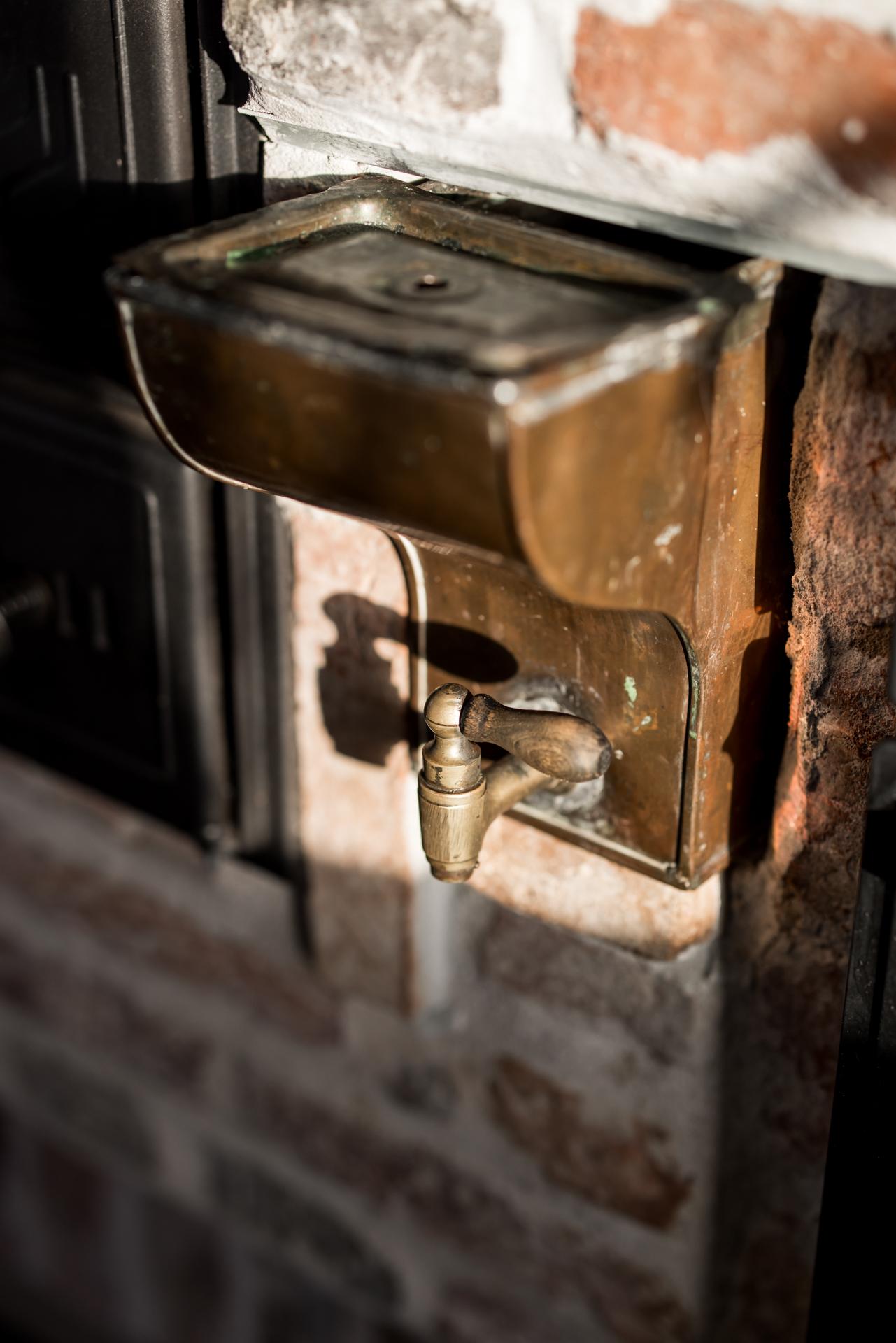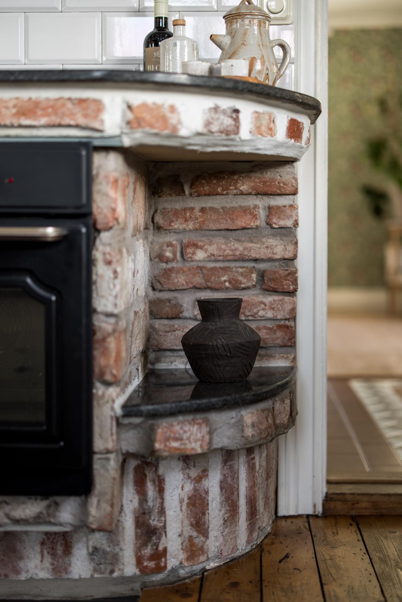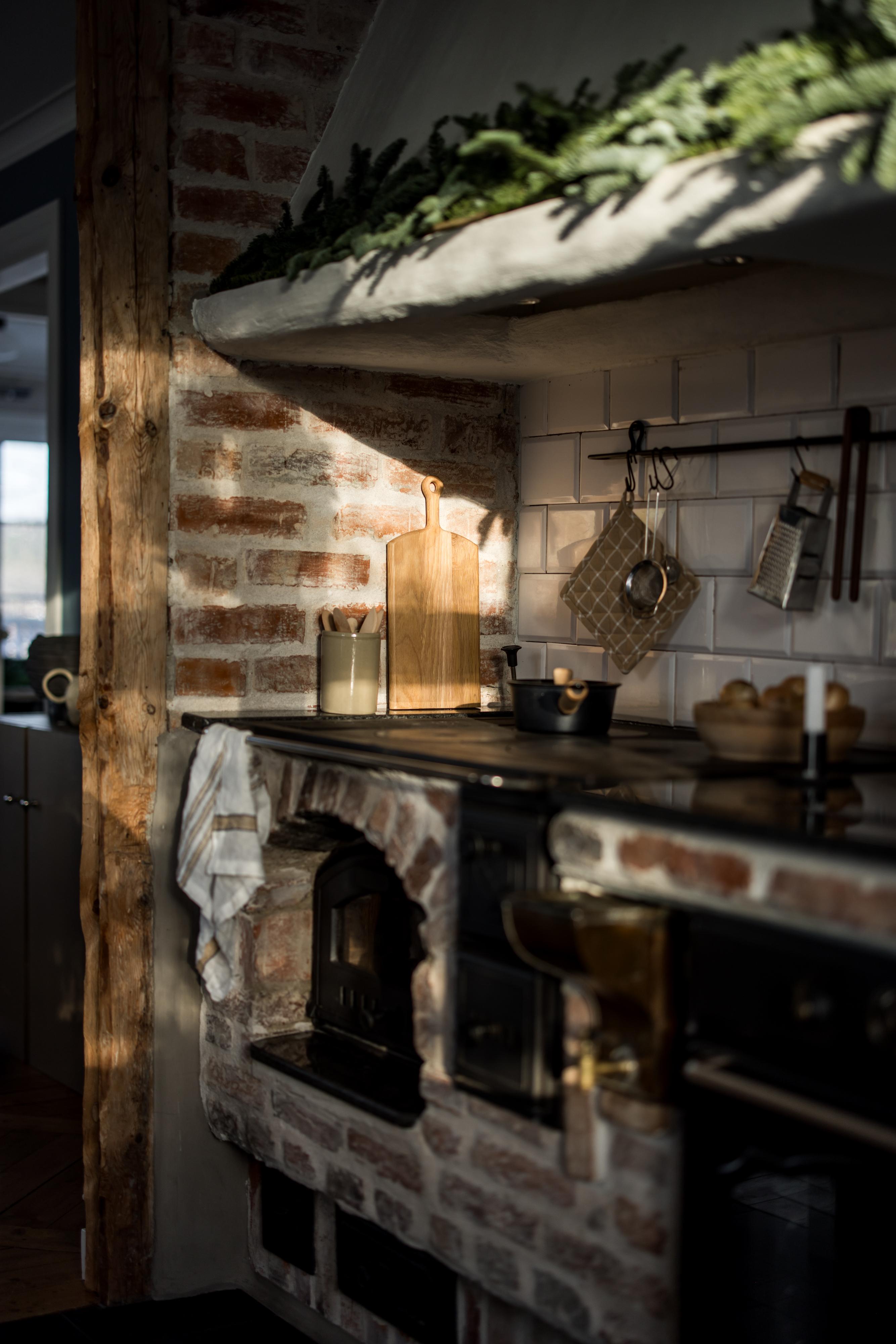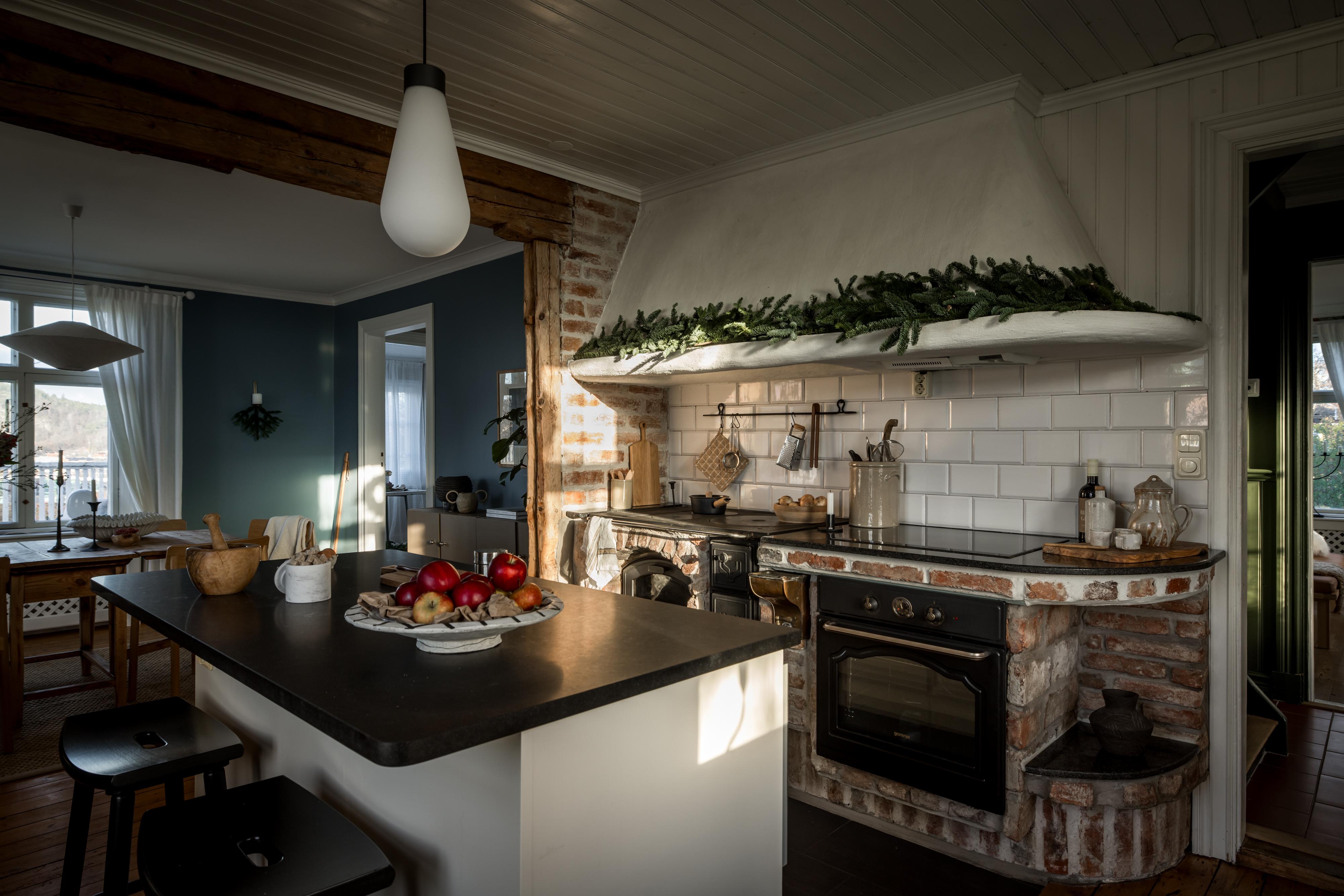 Köket har en lantlig känsla, inte minst tack vare den eldningsbara vedspisen. Även den moderna ugnen i gammaldags stil är inbyggd i spismuren som täcks av en stor och vacker spiskåpa med fläkt ovanför den infällda spishällen. Det är väl tilltaget med både förvaring och arbetsyta, och runt köksön kan familj och vänner samlas och laga mat tillsammans. Den passar också bra som serveringsbänk under de stora middagsbjudningarna. Det finns utrymme för ett par barstolar, och köket har även en platsbyggd sittbänk där gäster kan slå sig ner med ett glas vin medan hemmakockarna rör om i grytorna. Bänkskivorna är i svart sten och de gedigna skåpen från Kvänum har vita spegelluckor och lådor. Kylen/frysen och mikron är i rostfri design medan diskmaskinen, som installerades 2022, är integrerad i inredningen. Brädgolvet är framtaget och i själva arbetsdelen har man lagt in grafitgrå klinker. Väggarna är klädda med vitmålad pärlspont.