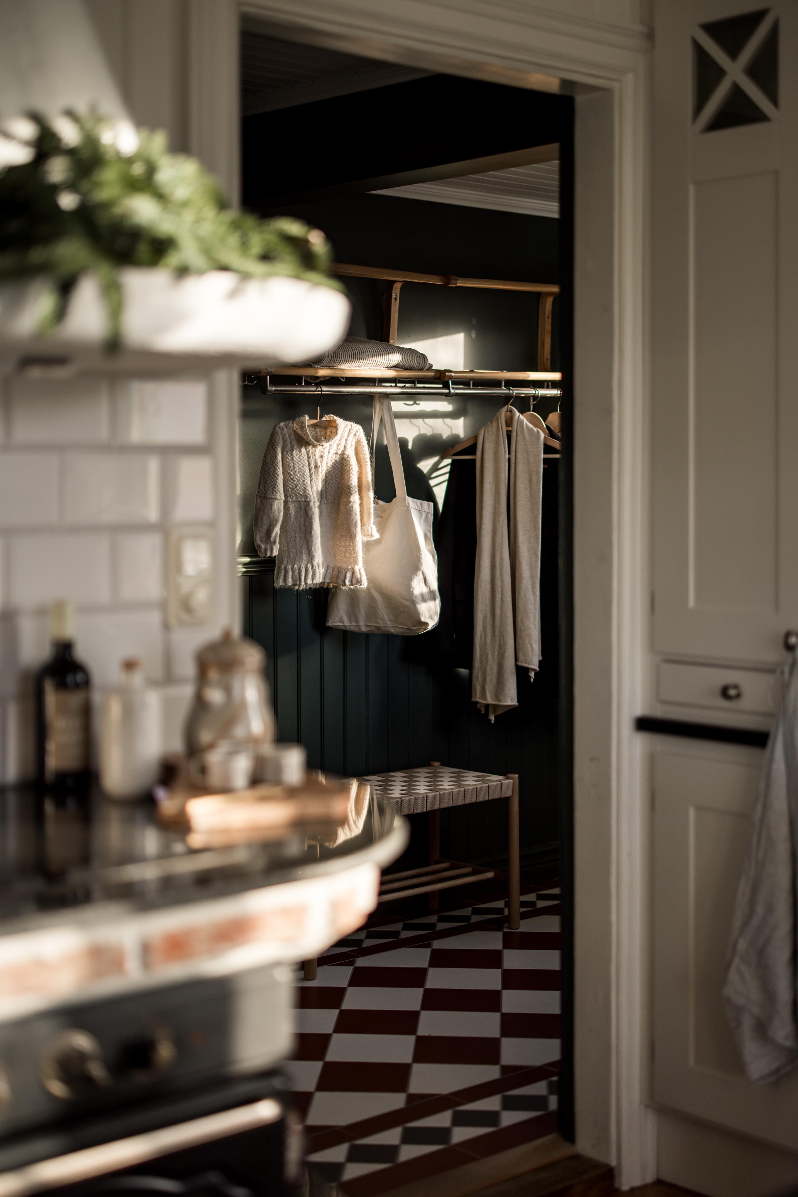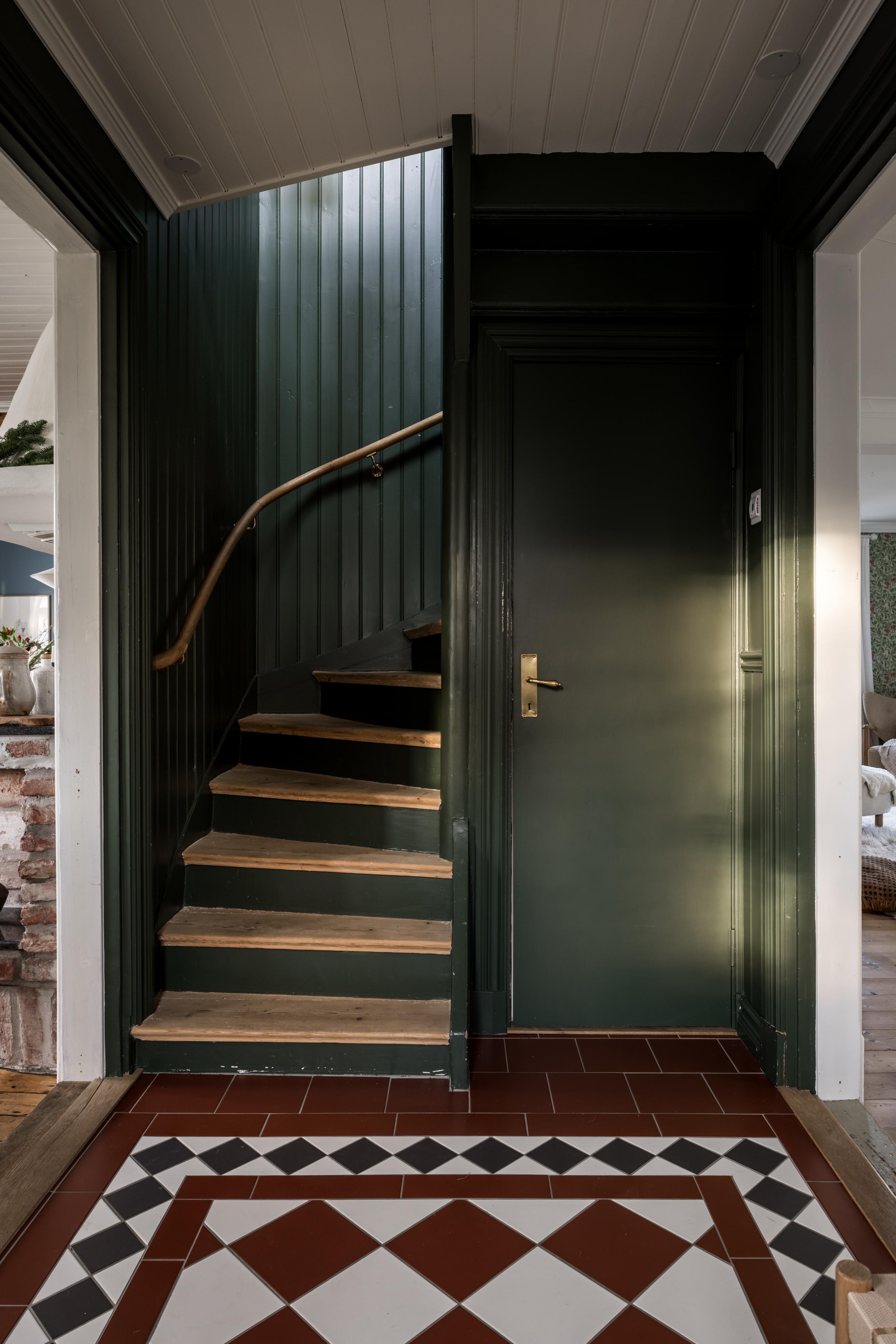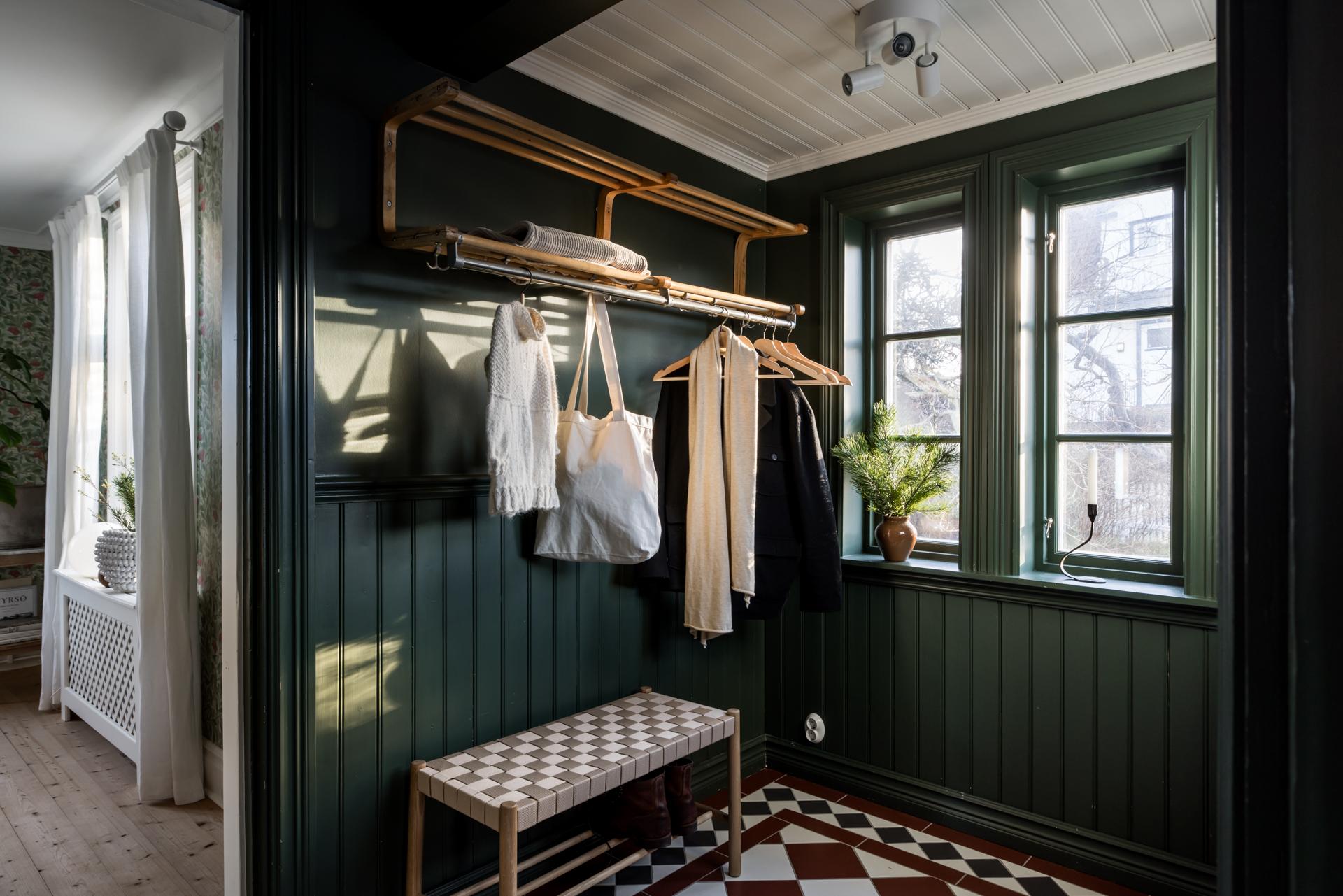Huset har en ljus och välkomnande entré med gott om plats för jackavhängning och skor. Golvet är belagt med röd och vit klinker i viktoriansk stil, och golvvärmen gör att blöta skor och snöiga overaller torkar snabbt. Väggarna, inklusive listerna och den fina bröstpanelen i pärlspont, är målade i en djupgrön kulör.