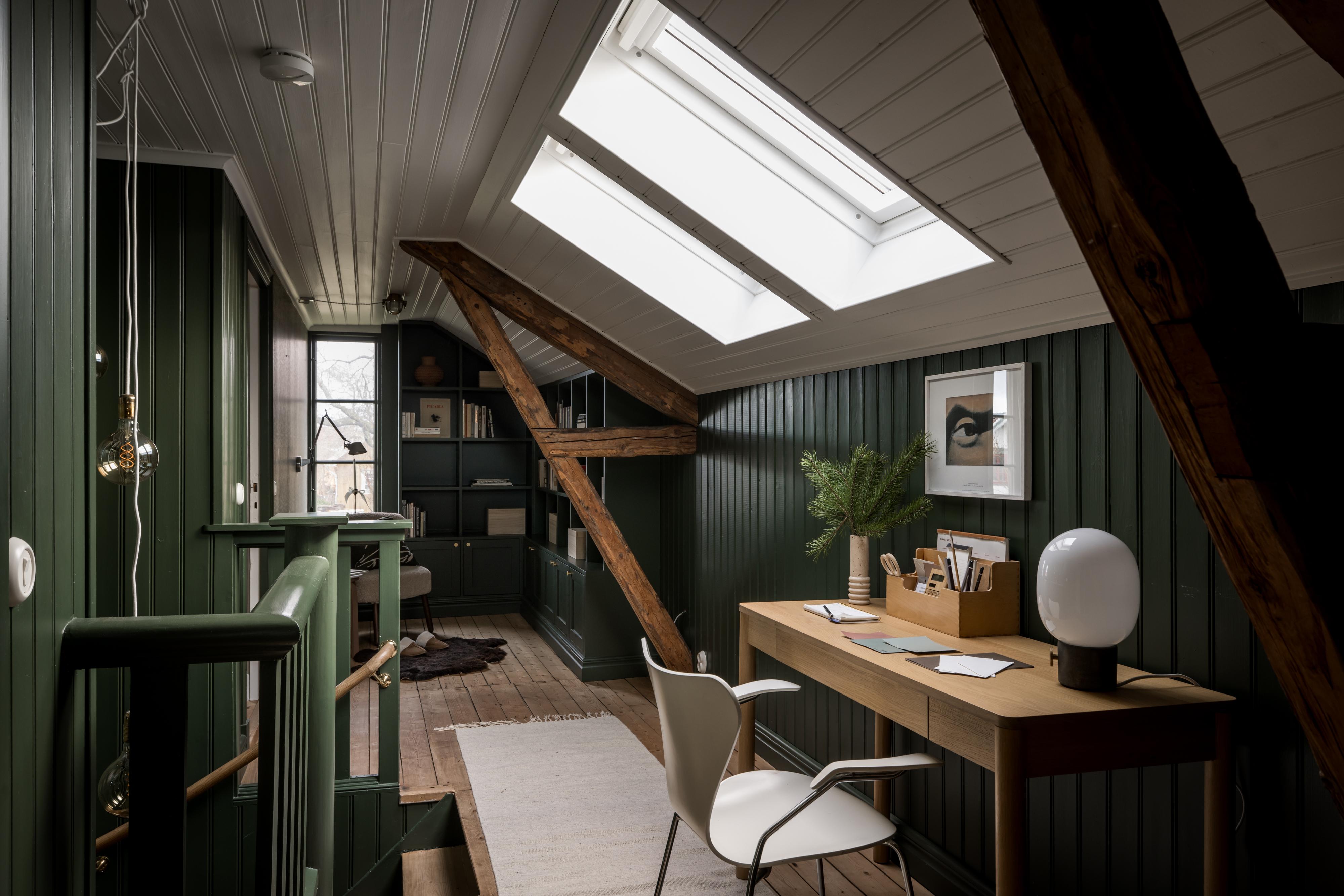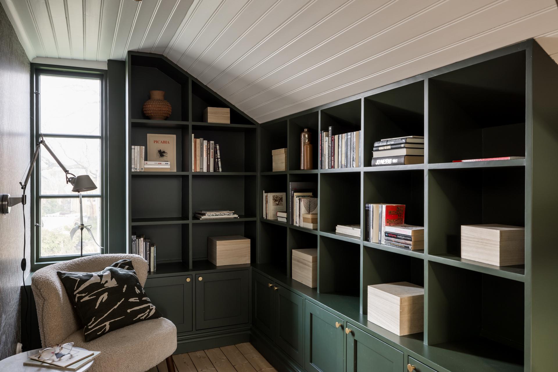 Husets övervåning binds samman av en övre hall som idag används som arbetsrum och bibliotek. Längst in finns platsbyggda bokhyllor som målats i samma djupgröna kulör som väggarnas pärlspontspanel. Brädgolvet är framtaget och liksom på övriga våningen är taket klätt med vit pärlspont. Två takfönster i söder fyller hallen med dagsljus.