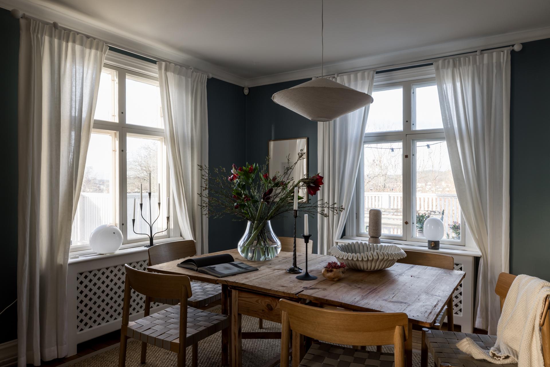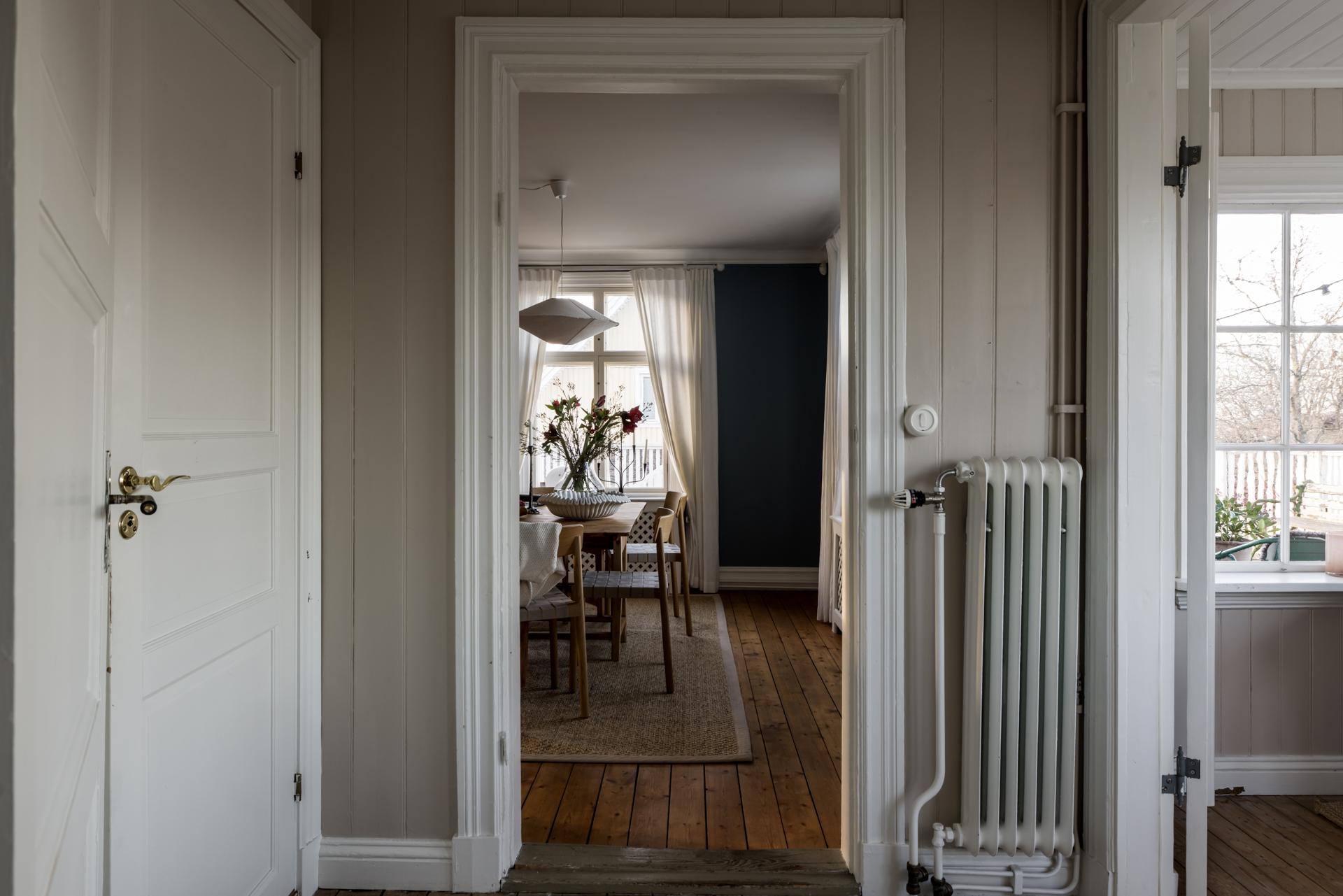Huset har gott om sällskapsyta, och i matsalen finns det plats för att duka upp till stora middagar. Brädgolvet är framtaget och öppningen mot köket ramas in av frilagda träbjälkar. I övrigt är väggarna tapetserade med en mörkblå tapet.