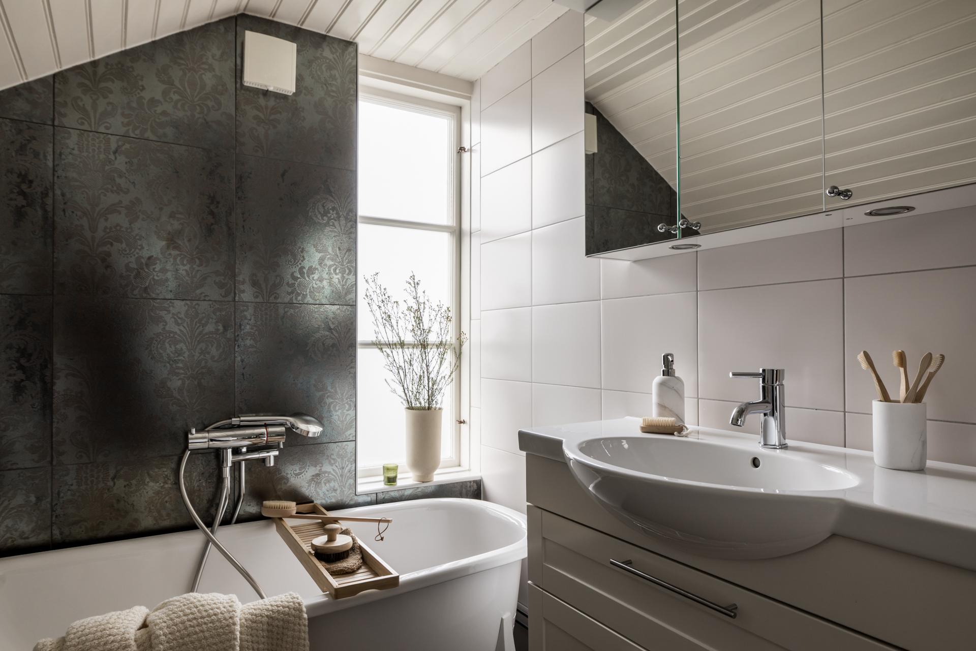 På övervåningen finns även ett badrum med badkar, handdukshängare, tvättkommod, spegelskåp och vägghängd toalett. Väggarna är klädda med vitt och bronsfärgat kakel, och golvet belagt med bronsfärgad klinker med golvvärme. Ett fönster i väster släpper in dagsljus och frisk luft.