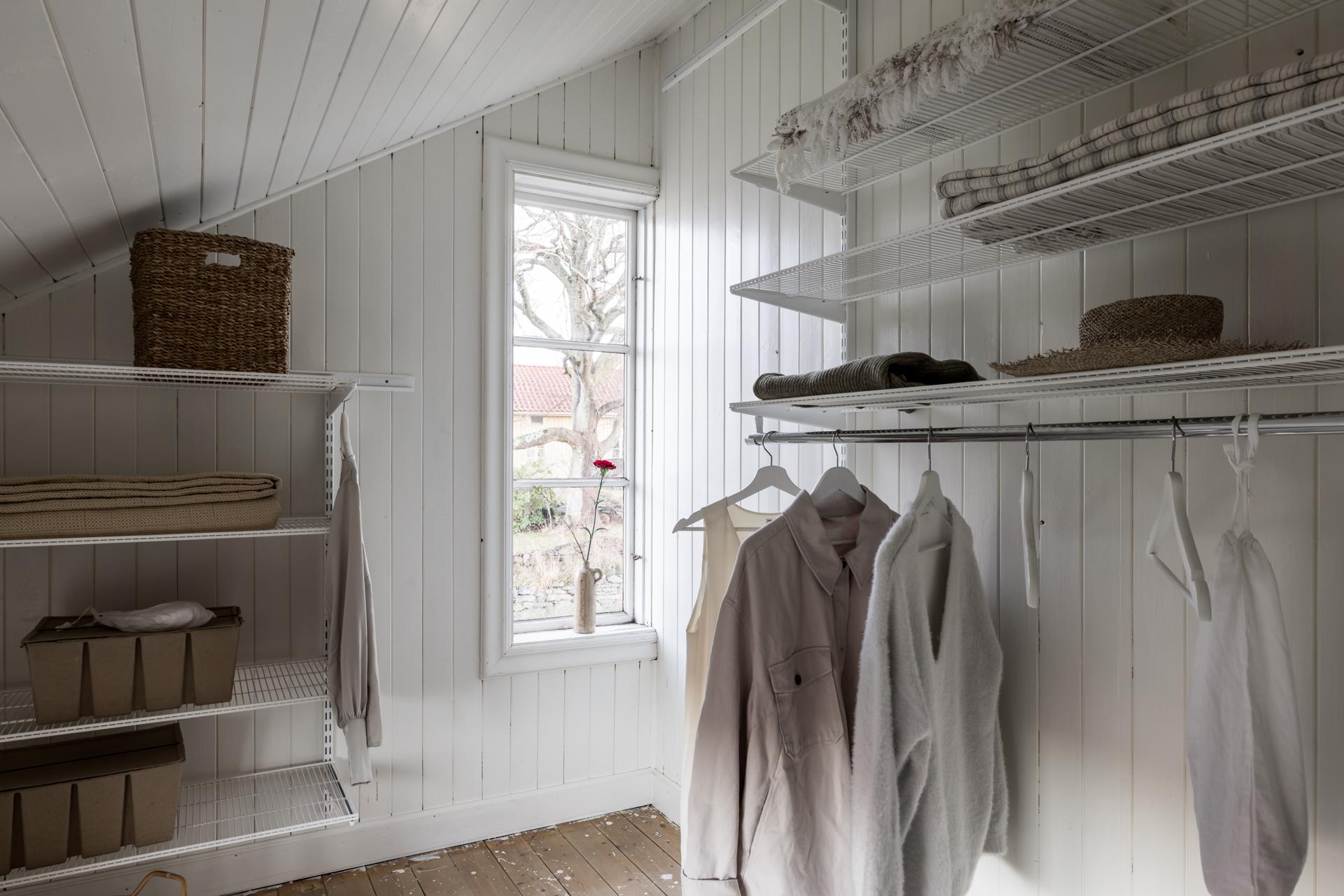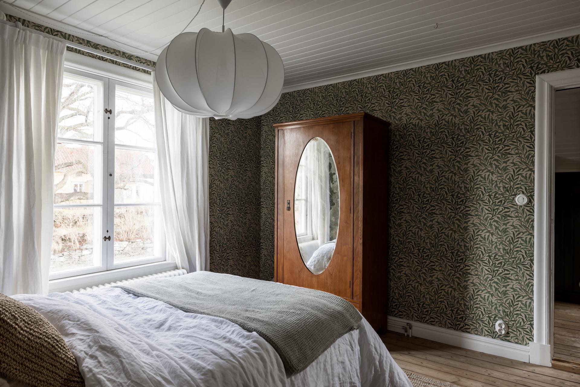 Direkt till vänster om trappan finns ett rymligt sovrum med gott om plats för en dubbelsäng. Brädgolvet är framtaget och väggarna tapetserade med William Morris tapet ”Willow Bough”. I den stora intilliggande klädkammaren, med ljusinsläpp från fönster i två väderstreck, är väggarna klädda med vitmålad spont.