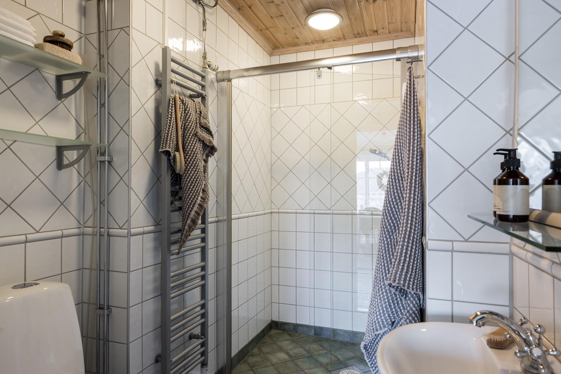 I anslutning till den inre hallen finns även ett badrum med duschhörna, handdukstork, handfat och toalett. Den rymliga duschhörnan skärmas av med en dörr i glas. Väggarna är klädda med vitt kakel och golvet belagt med grönmelerad klinker med golvvärme.