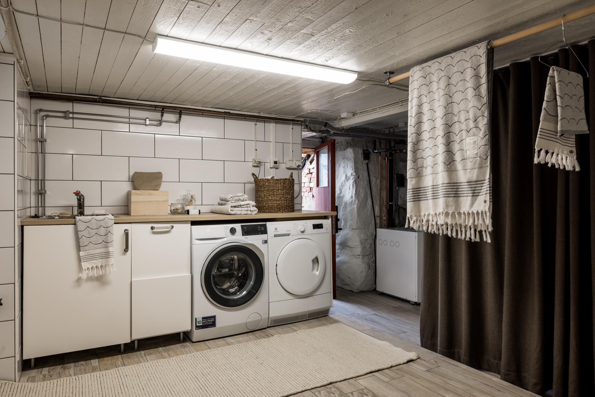 Husets källare har delvis fräschats upp med klinker. Ytterväggarna är i vitputsad natursten och i den öppna tvättstugan – med både tvättmaskin, torktumlare, vask, arbetsbänk och förvaring – är väggarna klädda med vitt kakel. En dörr direkt ut till trädgården gör det smidigt att hänga tvätten utomhus och fungerar även som groventré.