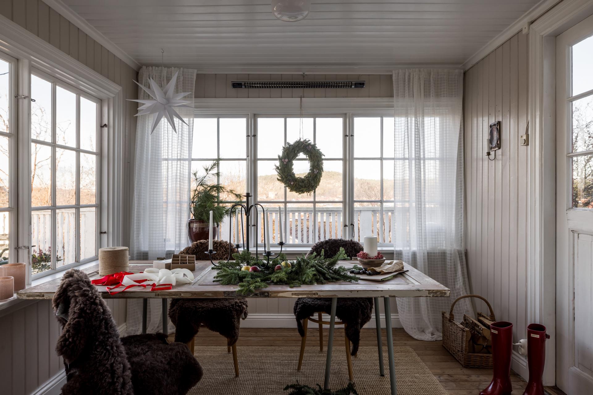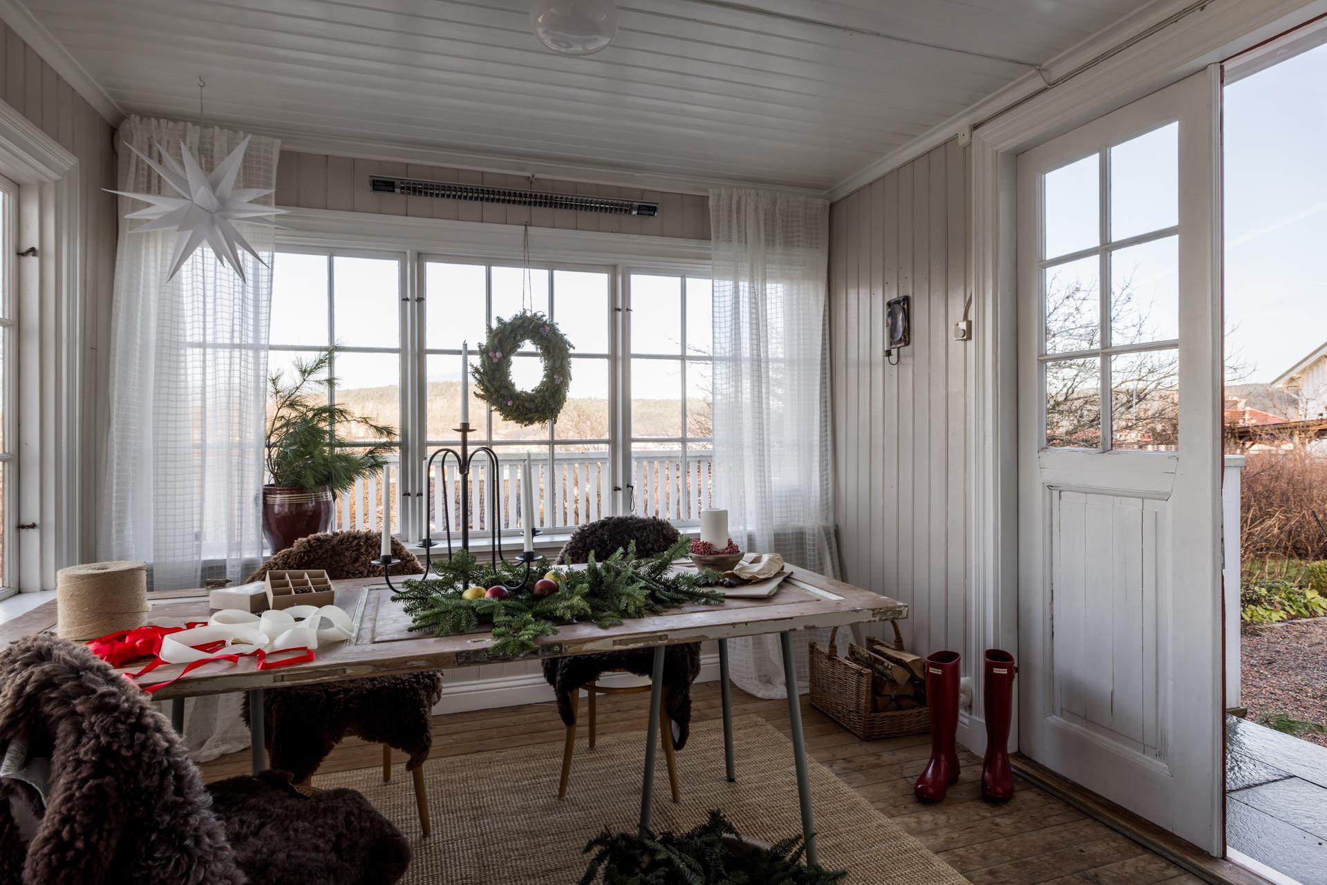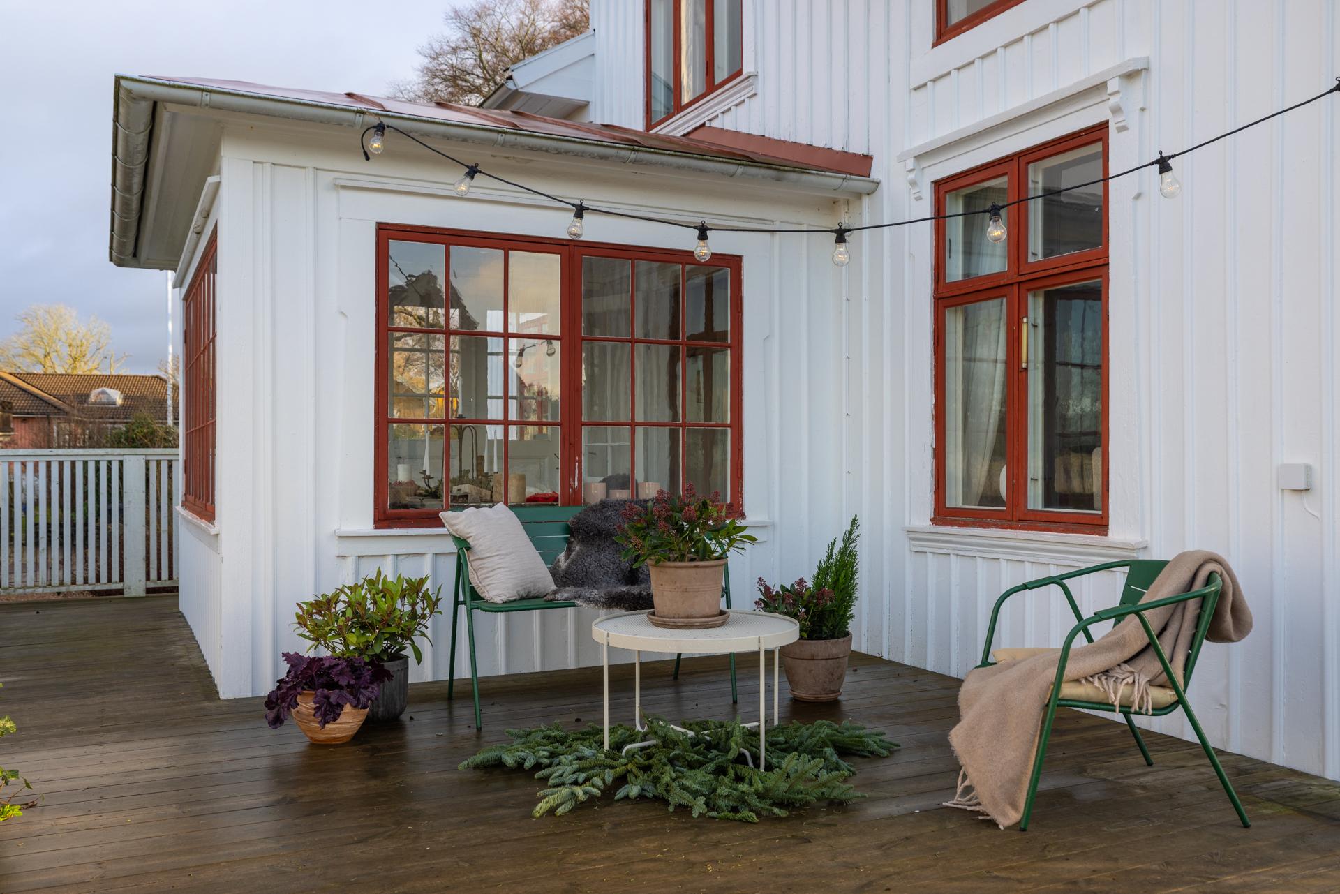 Den inre hallen som binder samman vardagsrummet och matsalen öppnar sig mot en glasveranda som badar i sol. Här kan man sommartid sitta och äta, umgås eller bara koppla av, och på vårvintern är det den perfekta platsen för uppdrivning av pelargonier och andra säsongsväxter. Pardörrar leder ut till husets stora altan med gott om plats för både matgrupp, loungemöbler och solstolar. Altanen har sol hela dagen, och kvällssolen är verkligen underbar. Utsikten över Sävedalen är hänförande.