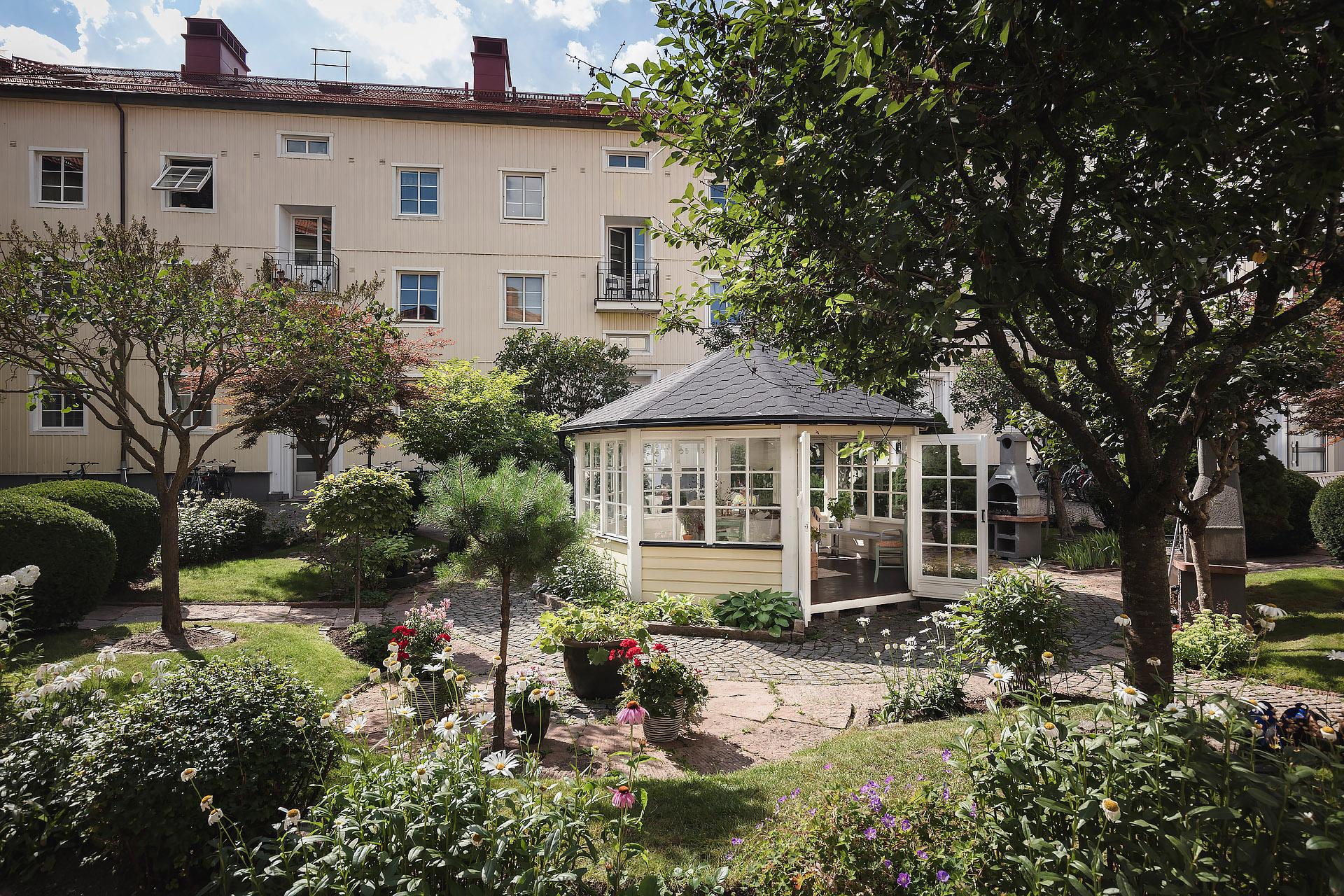 Bedårande etta med det bästa och mest ostörda läget i föreningen. Lägenheten är full av charmiga originaldetaljer såsom spegeldörrar, serveringsskåp, kallskafferi, gjutjärnsradiatorer, takrosett, och framtaget brädgolv. Några snabba trappsteg ner från lägenheten ligger föreningens otroliga innergård, komplett med ett lusthus, så här behöver du aldrig sakna balkong. Mycket fint badrum med golv av kolmårdsmarmor. Ypperlig förvaring tack vare två enorma förråd belägna i källaren strax under lägenheten. Välskött och ekonomiskt mycket stark förening med en belåning om endast ca 614 kr/kvm efter att nyligen ha extraamorterat 1 000 000 kr på lånen. För 2022 är den indirekta nettoskuldsättningen noll kronor.