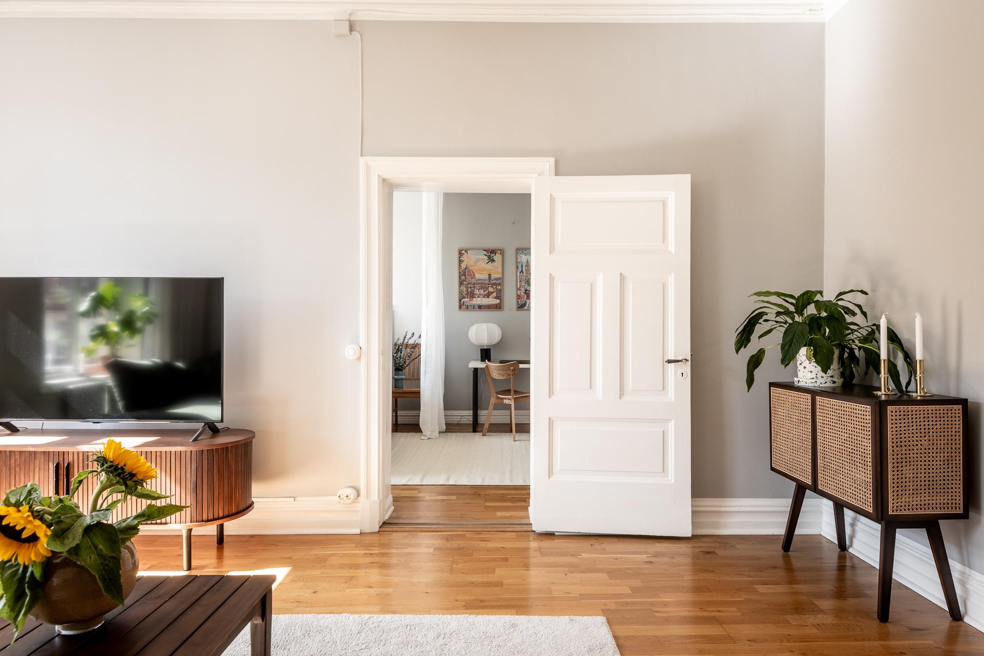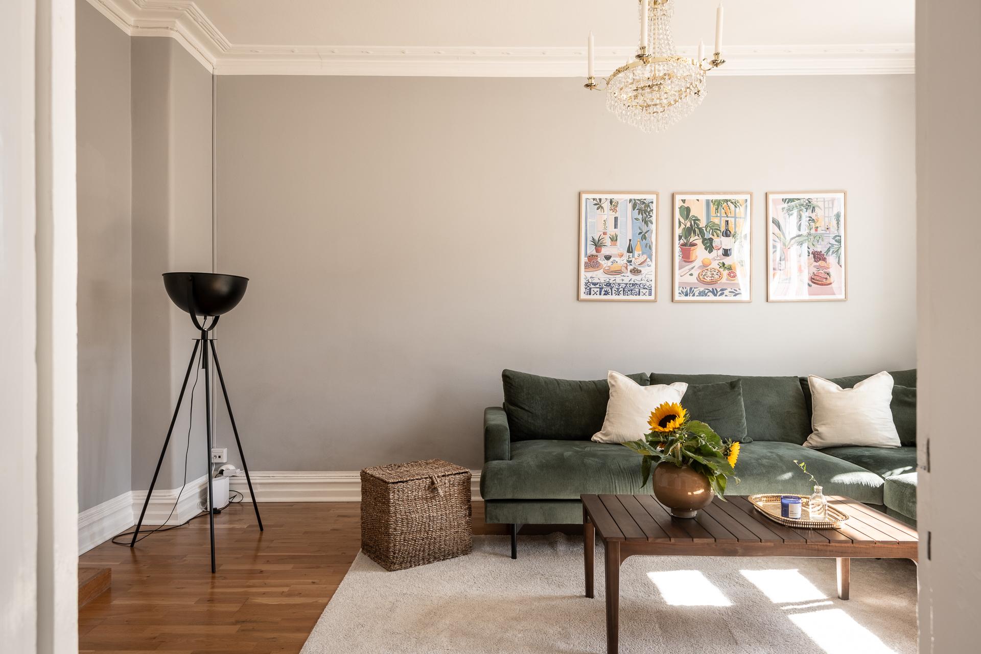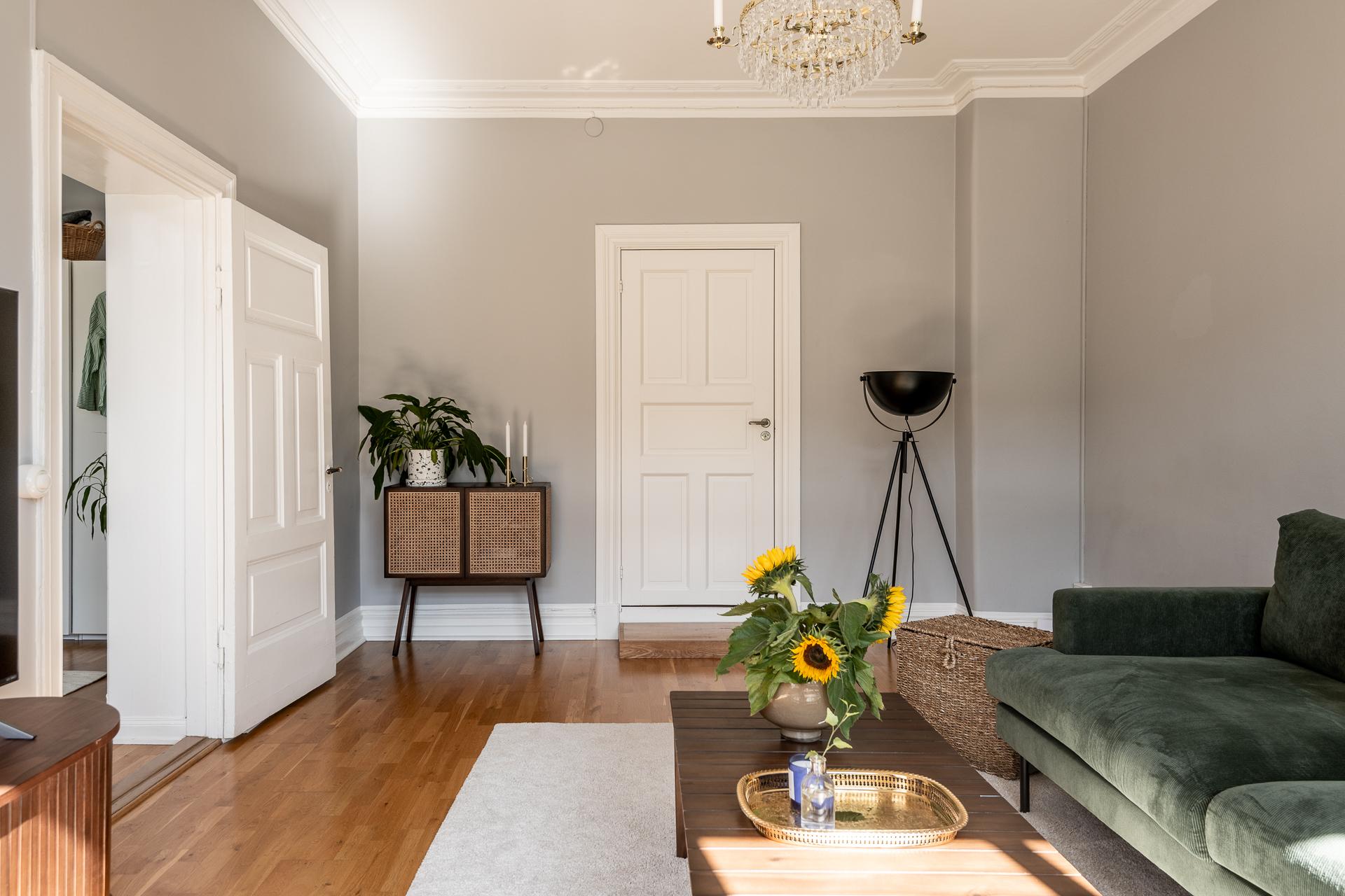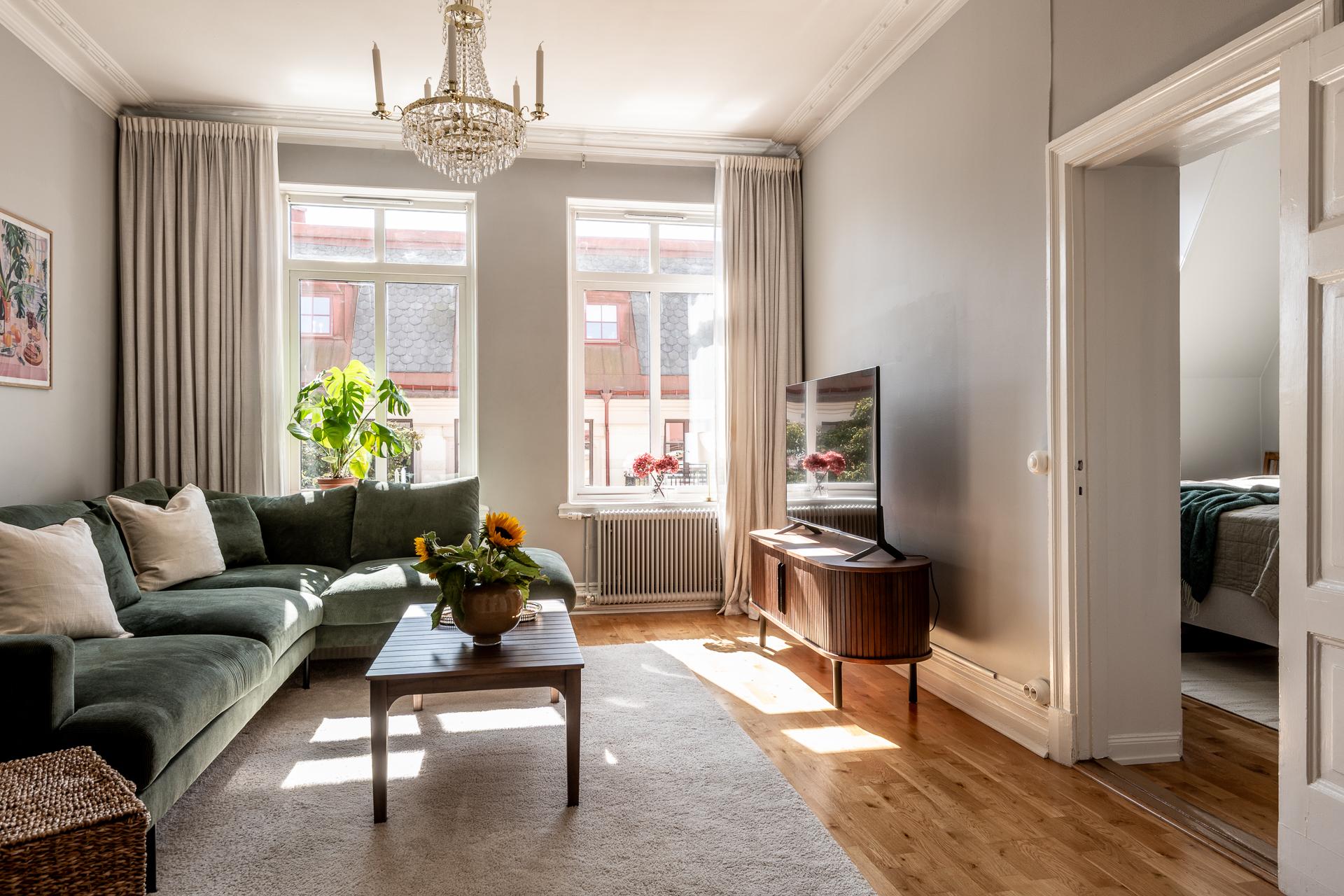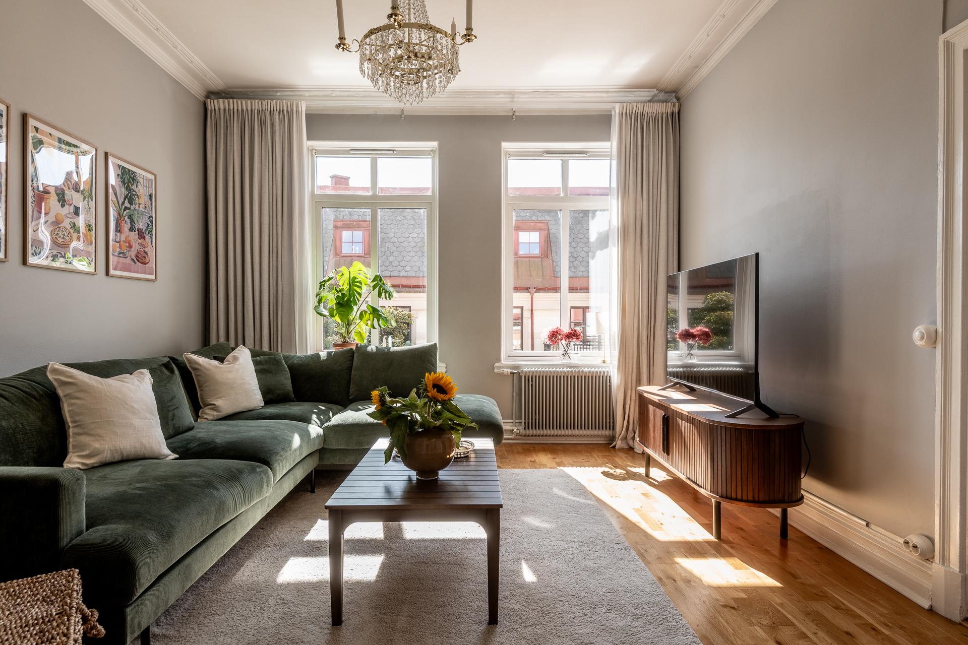 Pampigt vardagsrum med två generösa fönsterpartier med överljus. Här finns en tydlig identitet och ett starkt ha-begär med allt man eftersträvar i en gammal och pampig fastighet. Gjutjärnsradiatorer och fina listverk såsom gedigen stuckatur och takrosett - allting 120 år gammalt i år och fortfarande lika vackert att titta på än idag. Södersolen ger solkatter som tränger långt in i rummet och vyn härifrån är riktigt vacker med ståtliga sekelskifteshus längs med hela gatan. Fritt och fint läge både öster- och västerut. Här ryms en större soffgrupp, tv-möbel och läshörna och rummets 23 kvadrat gör det enkelt att ha folk över på mingel utan att det blir trångt.