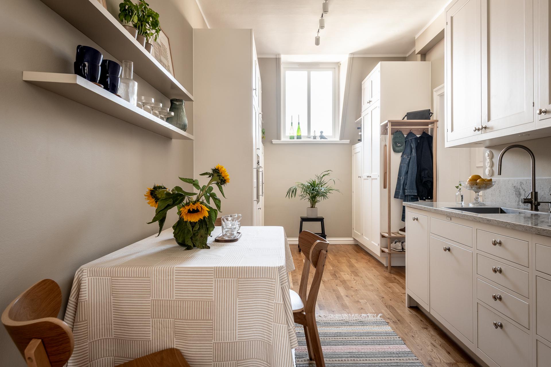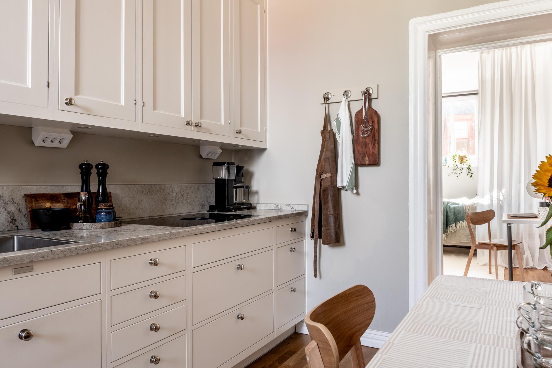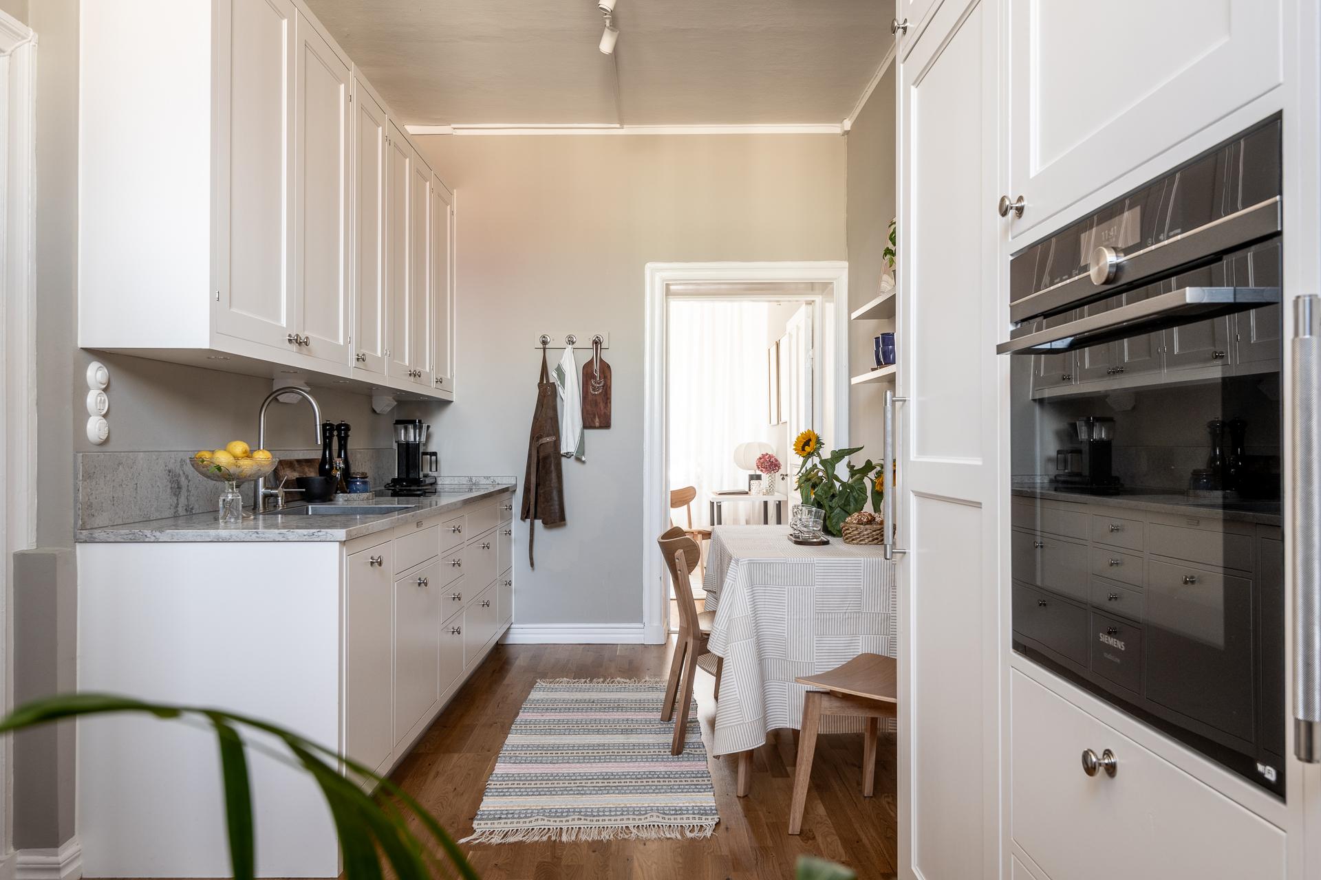 Bänkskivan är av kvartskomposit med gerade kanter vilket blir betydligt mer tåligt och motståndskraftigt än många marmor och kalkstens-skivor. Vitvarorna håller hög kvalité med kombinerad ugn/ångugn/mikro från Siemens, fint integrerad i skådsinredningen. Kyl och frys liksom diskmaskin är också integrerade och signerade Siemens medan spishällen, vackert nedsänkt i bänkskivan, och fläkten är från Bora. Längs ena långsidan finns en naturlig matplats där man gärna samlas för goa middagar och stora samtal. Fönstret vetter mot innergården och tack vare det höga läget i huset blir det ett bra ljusinsläpp.