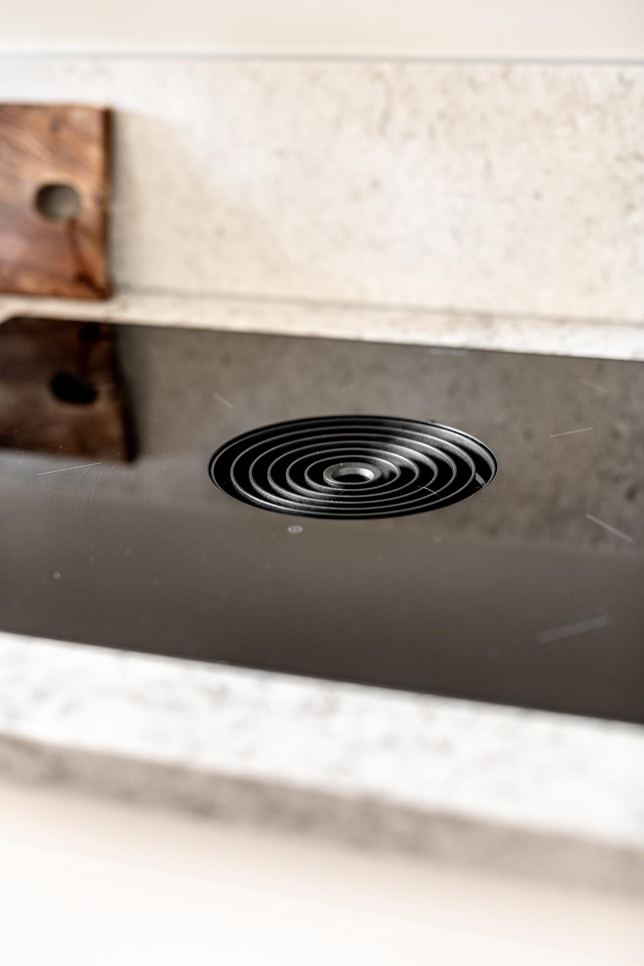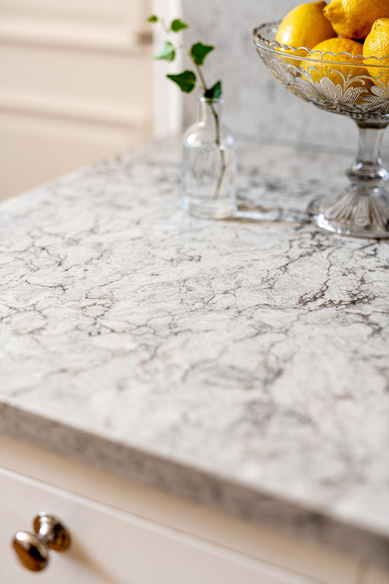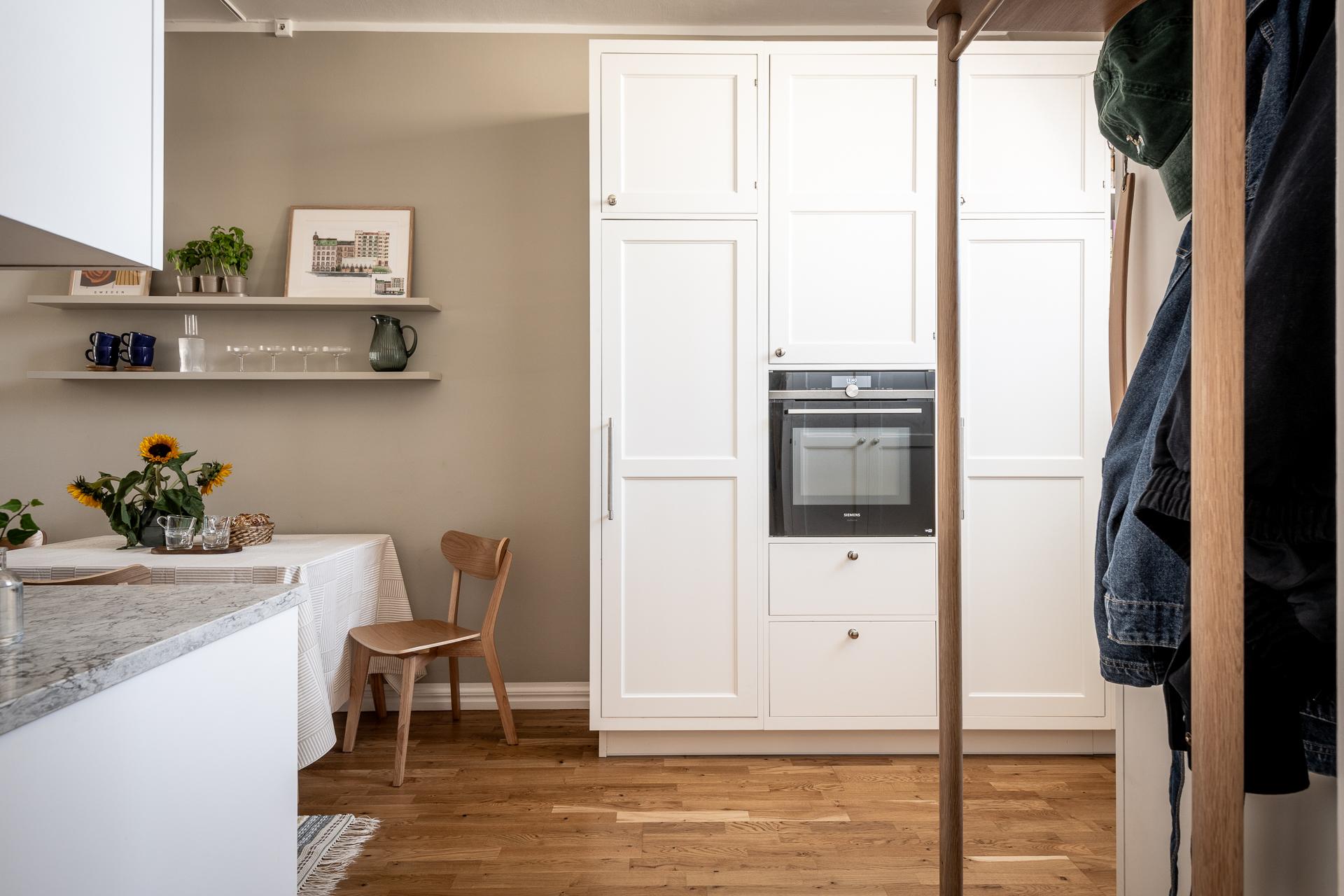 Bänkskivan är av kvartskomposit med gerade kanter vilket blir betydligt mer tåligt och motståndskraftigt än många marmor och kalkstens-skivor. Vitvarorna håller hög kvalité med kombinerad ugn/ångugn/mikro från Siemens, fint integrerad i skådsinredningen. Kyl och frys liksom diskmaskin är också integrerade och signerade Siemens medan spishällen, vackert nedsänkt i bänkskivan, och fläkten är från Bora. Längs ena långsidan finns en naturlig matplats där man gärna samlas för goa middagar och stora samtal. Fönstret vetter mot innergården och tack vare det höga läget i huset blir det ett bra ljusinsläpp.