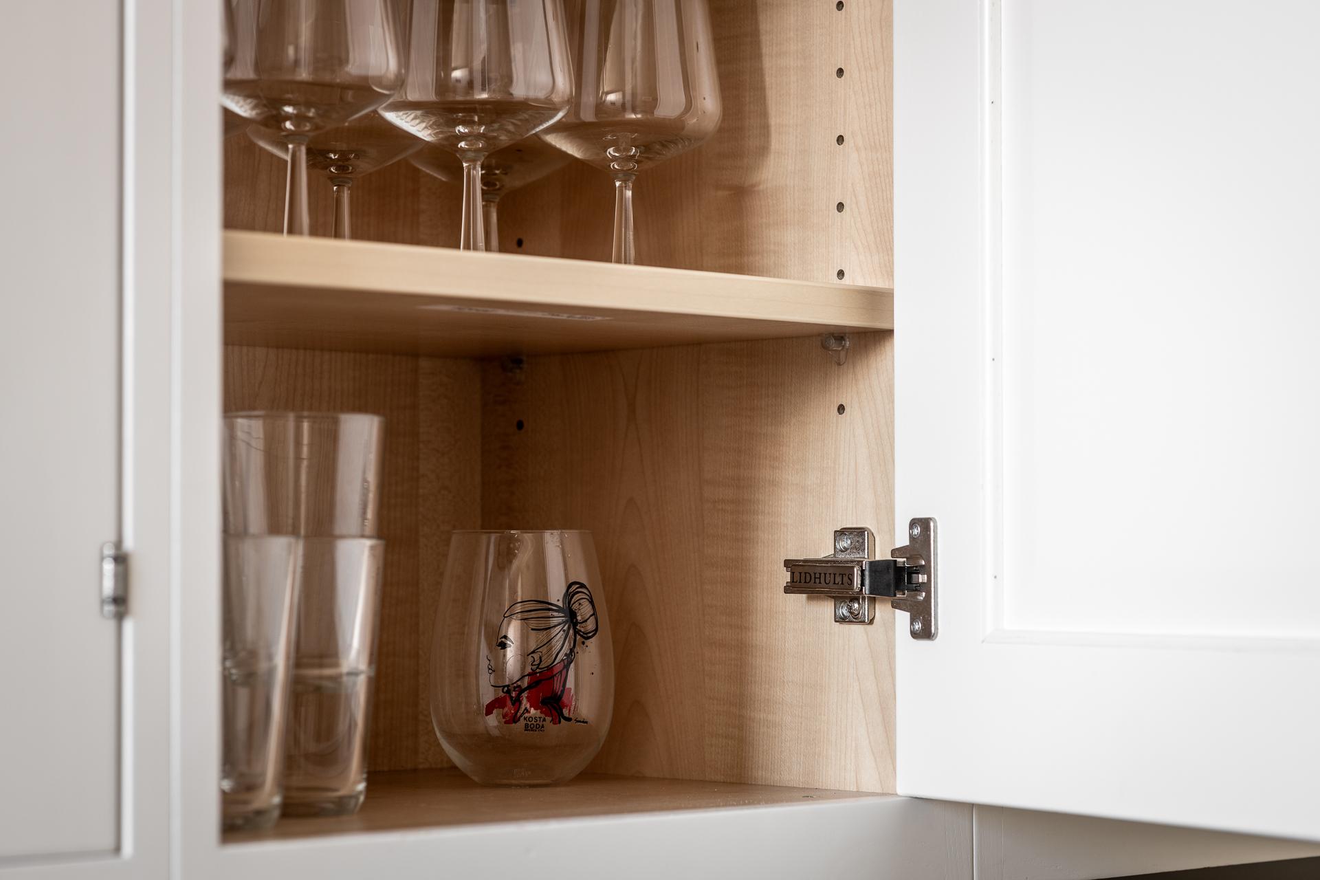 När beslutet togs om att renovera köket var en viktig aspekt att utnyttja ytorna på bästa sätt utan att göra avkall på estetik. Här ville man bygga ett kök som ska stå länge och som är omöjligt att tröttna på och varje val är noga genomtänkt. För er som byggt kök tidigare så vet ni hur krävande det är bara med alla beslut och vad kostsamt det är om man önskar kvalité. Valet föll på ett platsbyggt kök ifrån Lidhults som en köksarkitekt har ritat upp för hand, och resultatet blev minst sagt lyckat. Köket är byggt i massiv ask, både luckor och stommar, och är av klassisk modell för att liva med husets hjärta och själ. Varje detalj är omsorgsfullt planerad och man kan känna vilket hantverk det är i varje aspekt. Köksinteriören är gjord i björkmelamin liksom de öppna hyllplanen ovan köksbordet. Väggarna är målade i Soothing beige från Lady Jotun och samspelar fint med de vita skåpsluckorna.