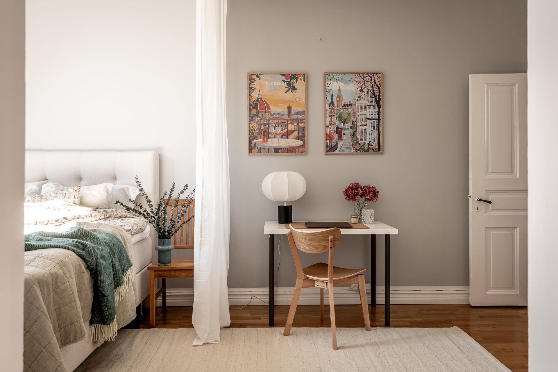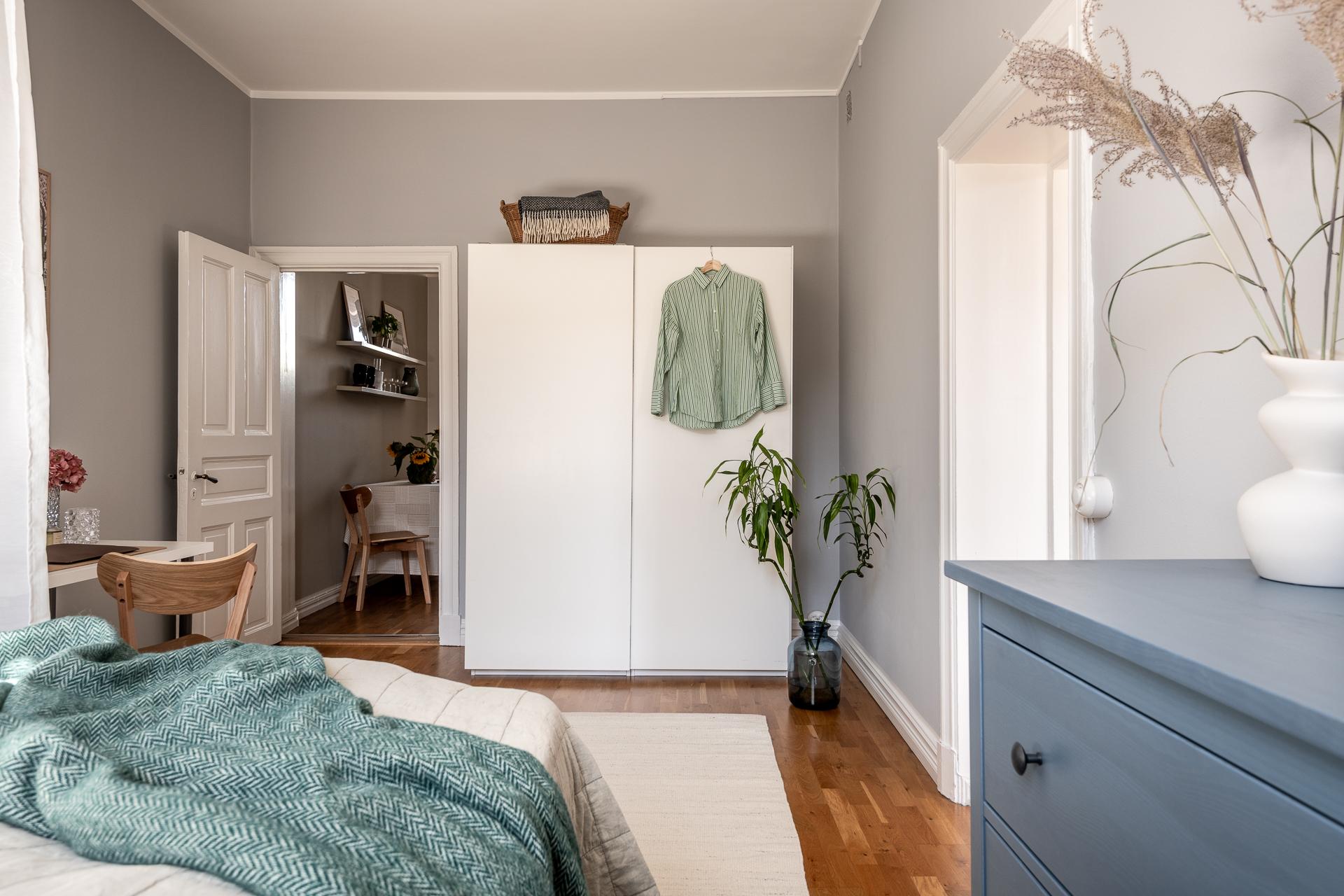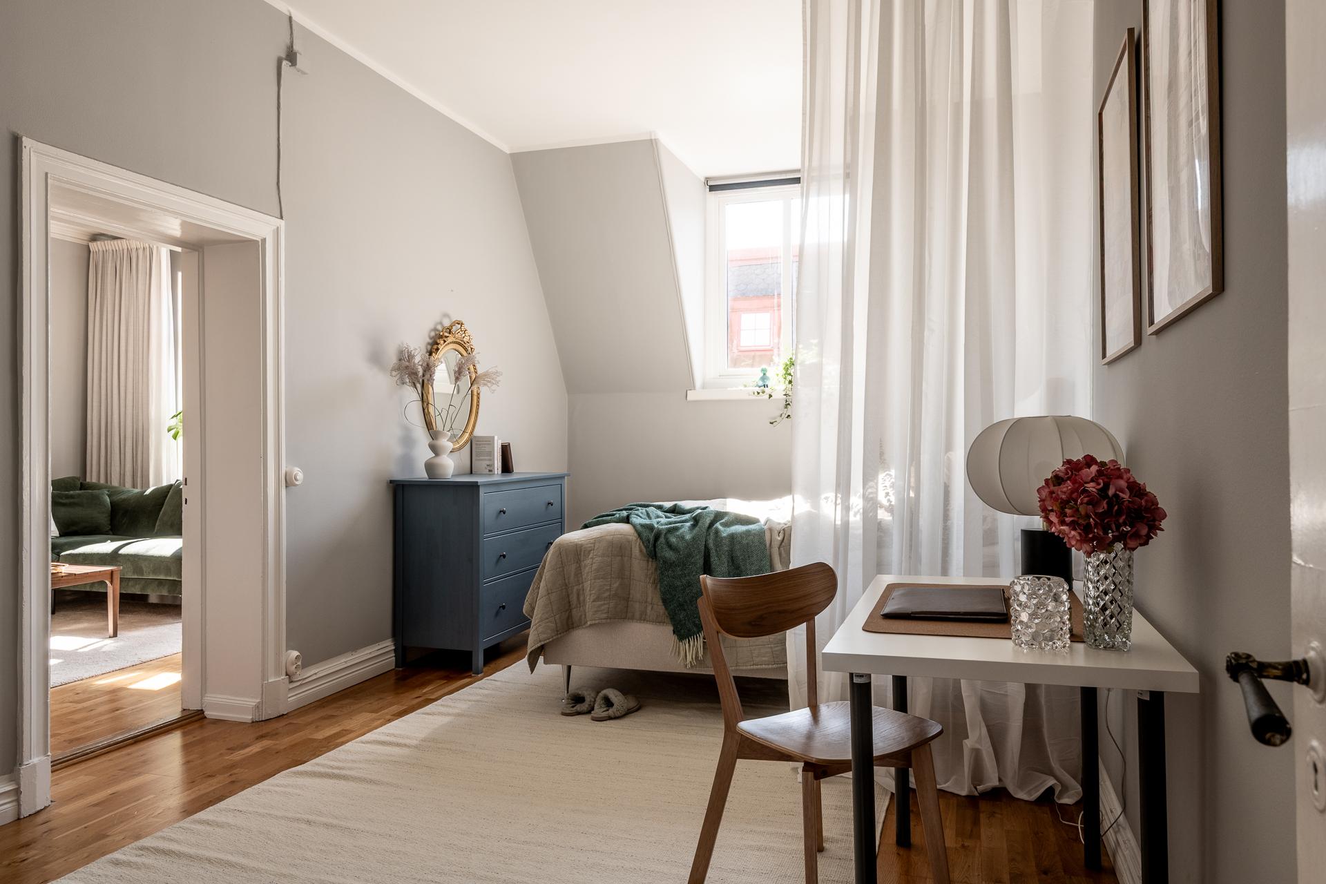 Intill det ljuvliga köket, bakom en smäcker spegeldörr, ligger sovrummet. Helt insynsskyddat från stadens sus och brus med fönster i bästa söderläge. Drygt 16 kvadrat stort finns möjligheter till dubbelsäng, nattduksbord, utmärkt förvaring och även skrivbord för den som önskar jobba hemifrån. Lugnet här på femte våningen är påtagligt, från gatan nedanför hör man inte ett knyst så det är svårt att tro att man befinner sig i en av Göteborgs mest centrala delar. Tack vare söderläget får man ett fint ljusinsläpp året runt vilket annars är svårt att hitta. Under 2021 renoverades ytskikt då både tak och väggar fick sig en omgång. Perfekt bredspacklat efter att ha rivit ner bakomliggande lager och målade i en grå ton som skapar ett lugnt och harmoniskt intryck i rummet.