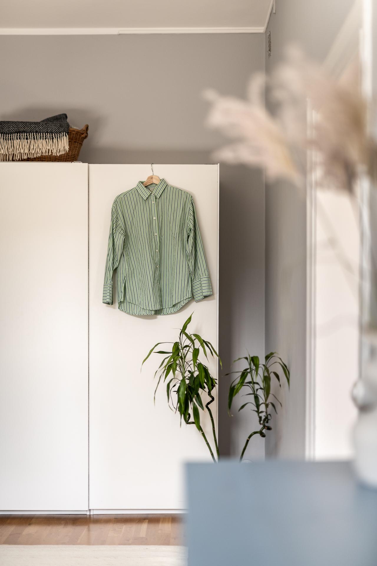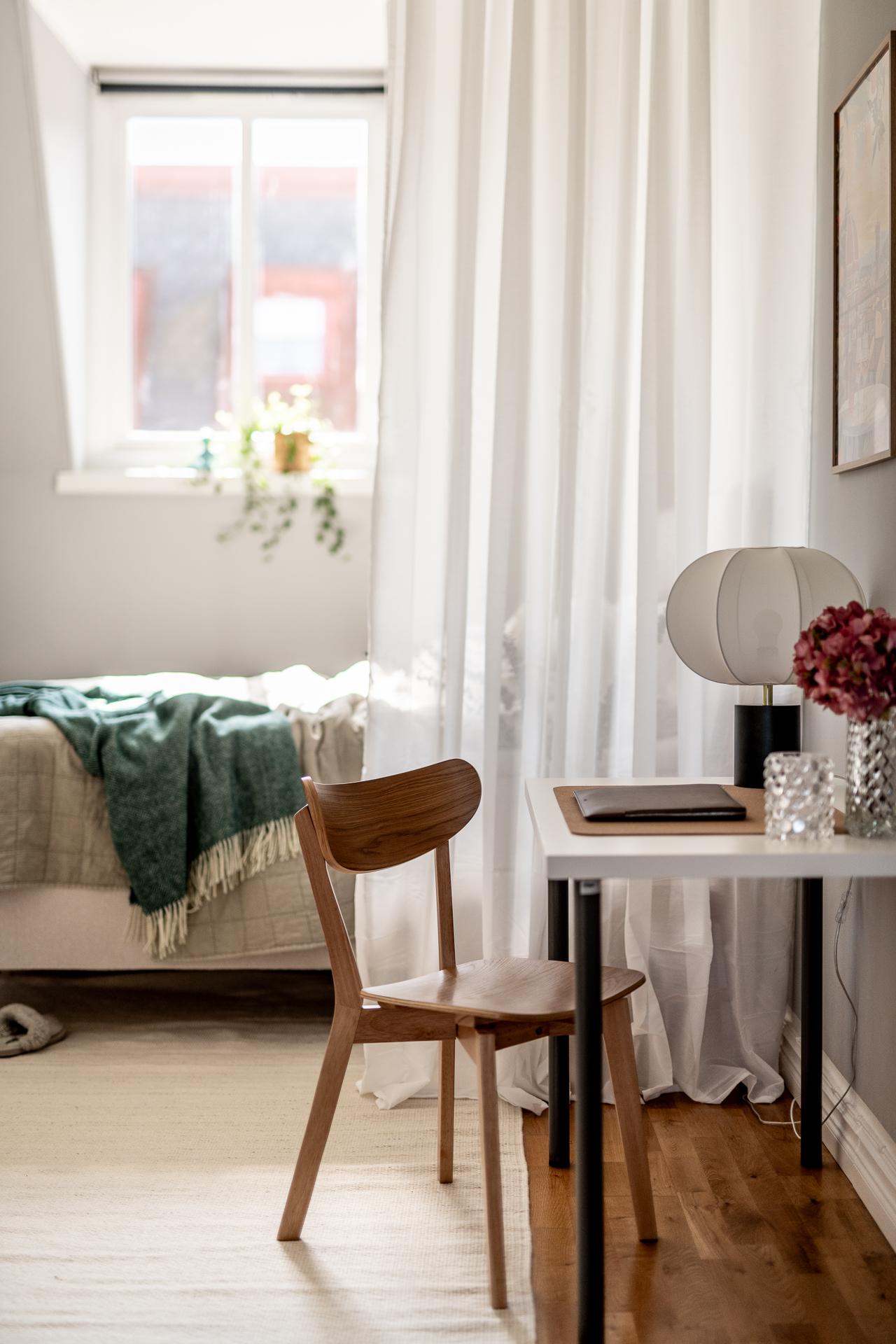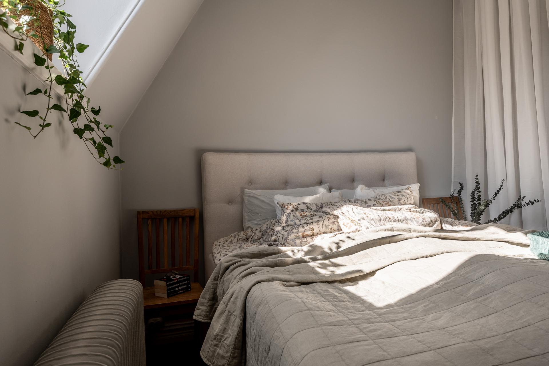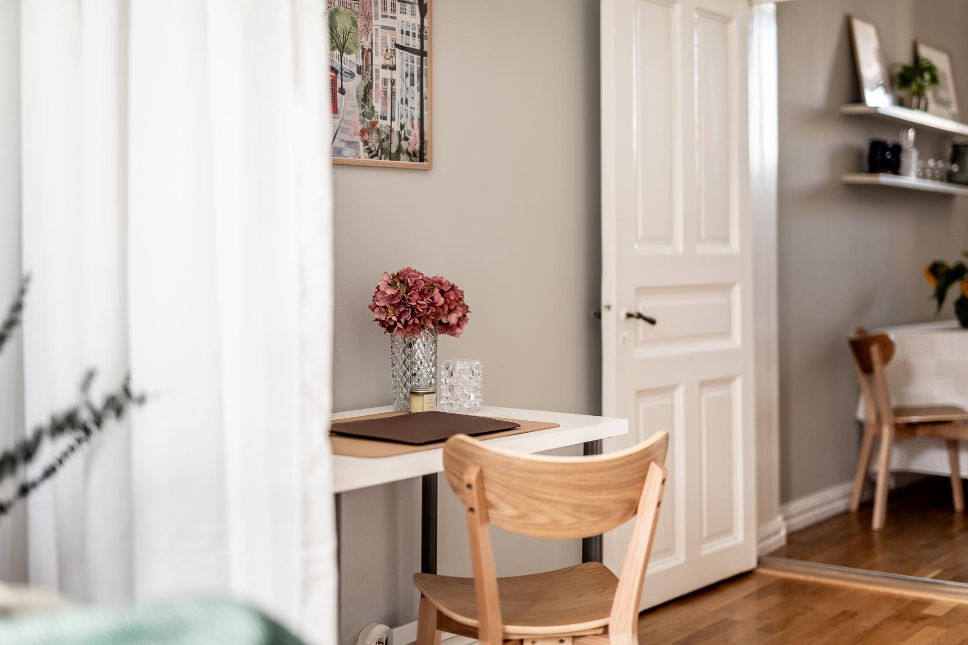 Intill det ljuvliga köket, bakom en smäcker spegeldörr, ligger sovrummet. Helt insynsskyddat från stadens sus och brus med fönster i bästa söderläge. Drygt 16 kvadrat stort finns möjligheter till dubbelsäng, nattduksbord, utmärkt förvaring och även skrivbord för den som önskar jobba hemifrån. Lugnet här på femte våningen är påtagligt, från gatan nedanför hör man inte ett knyst så det är svårt att tro att man befinner sig i en av Göteborgs mest centrala delar. Tack vare söderläget får man ett fint ljusinsläpp året runt vilket annars är svårt att hitta. Under 2021 renoverades ytskikt då både tak och väggar fick sig en omgång. Perfekt bredspacklat efter att ha rivit ner bakomliggande lager och målade i en grå ton som skapar ett lugnt och harmoniskt intryck i rummet.