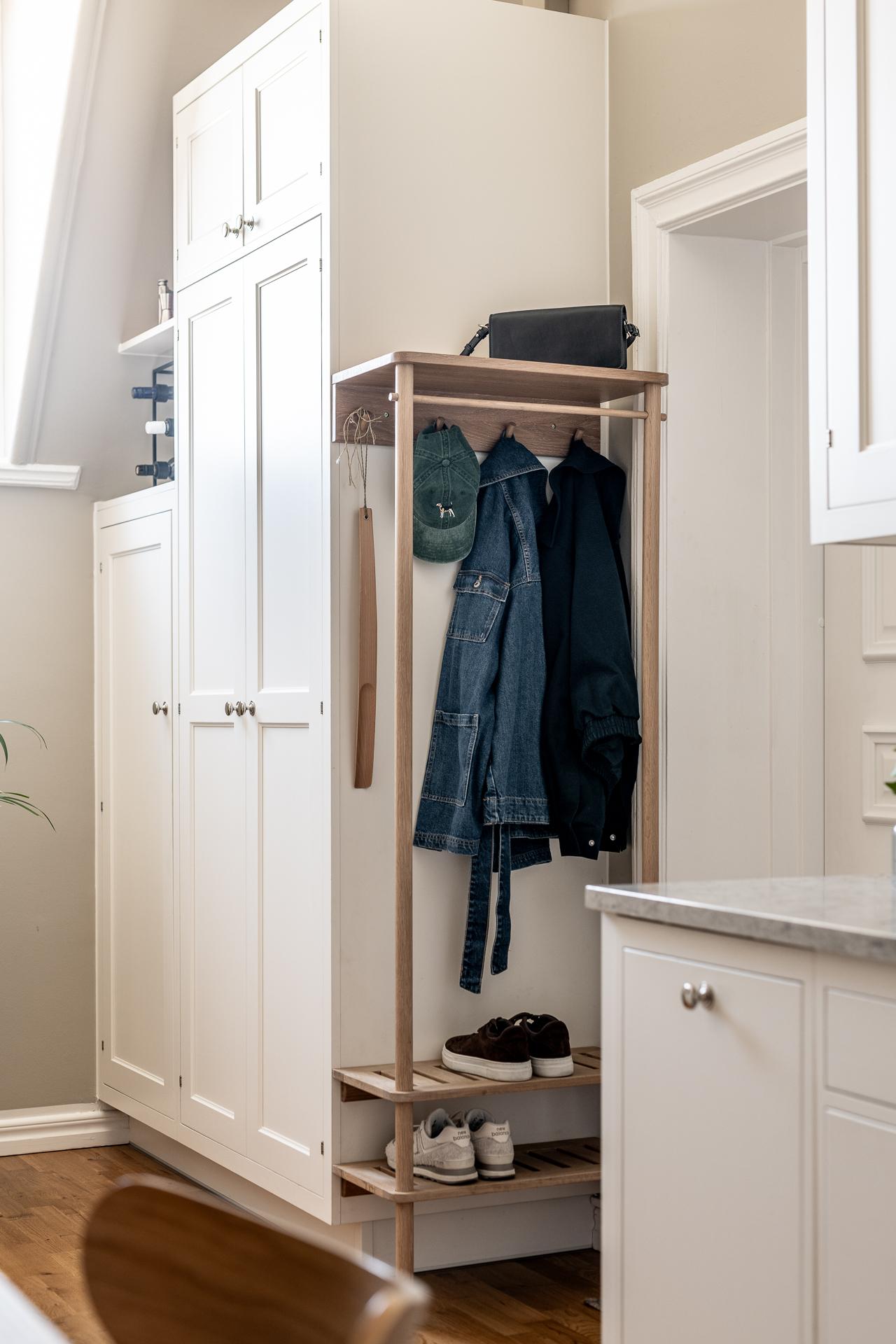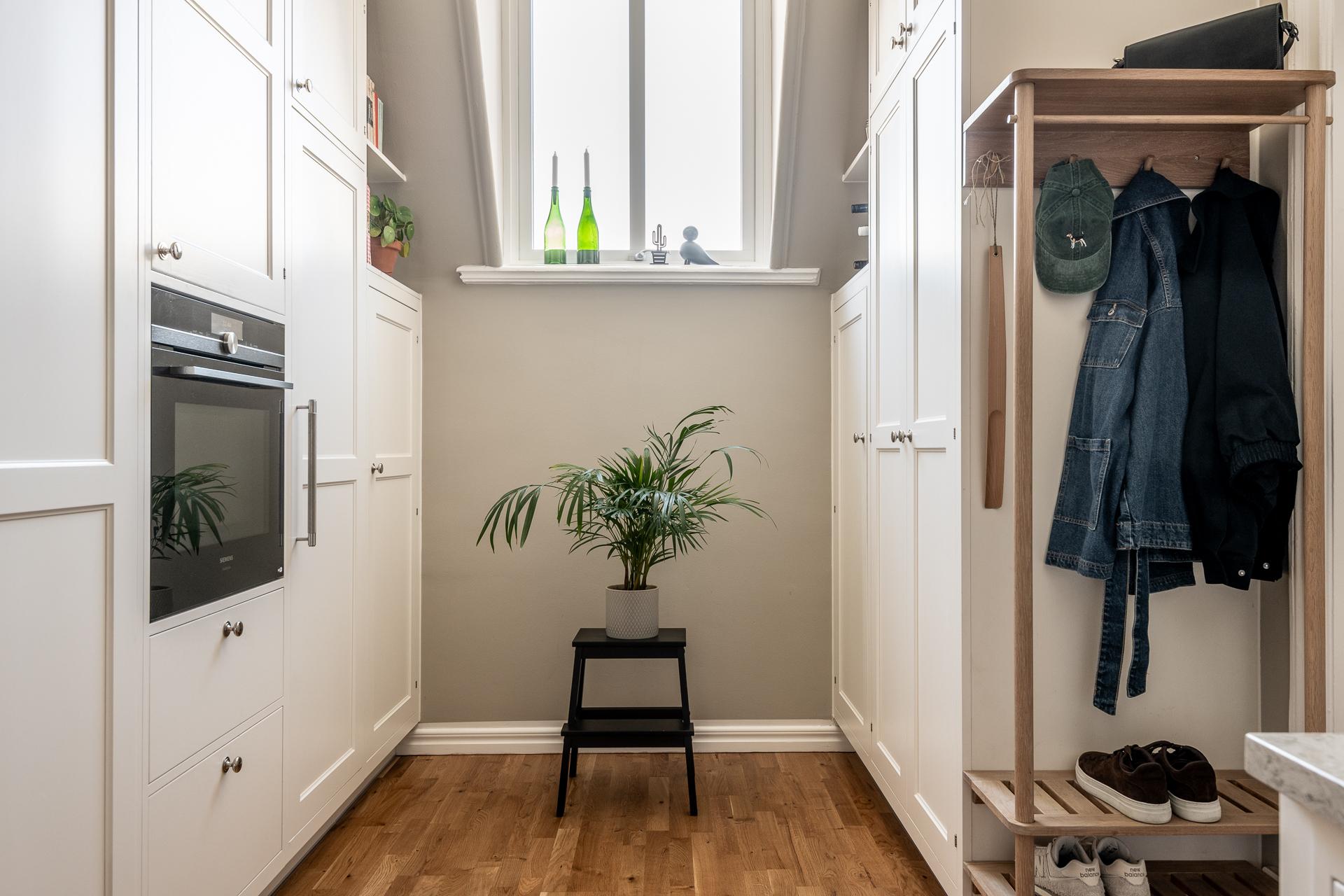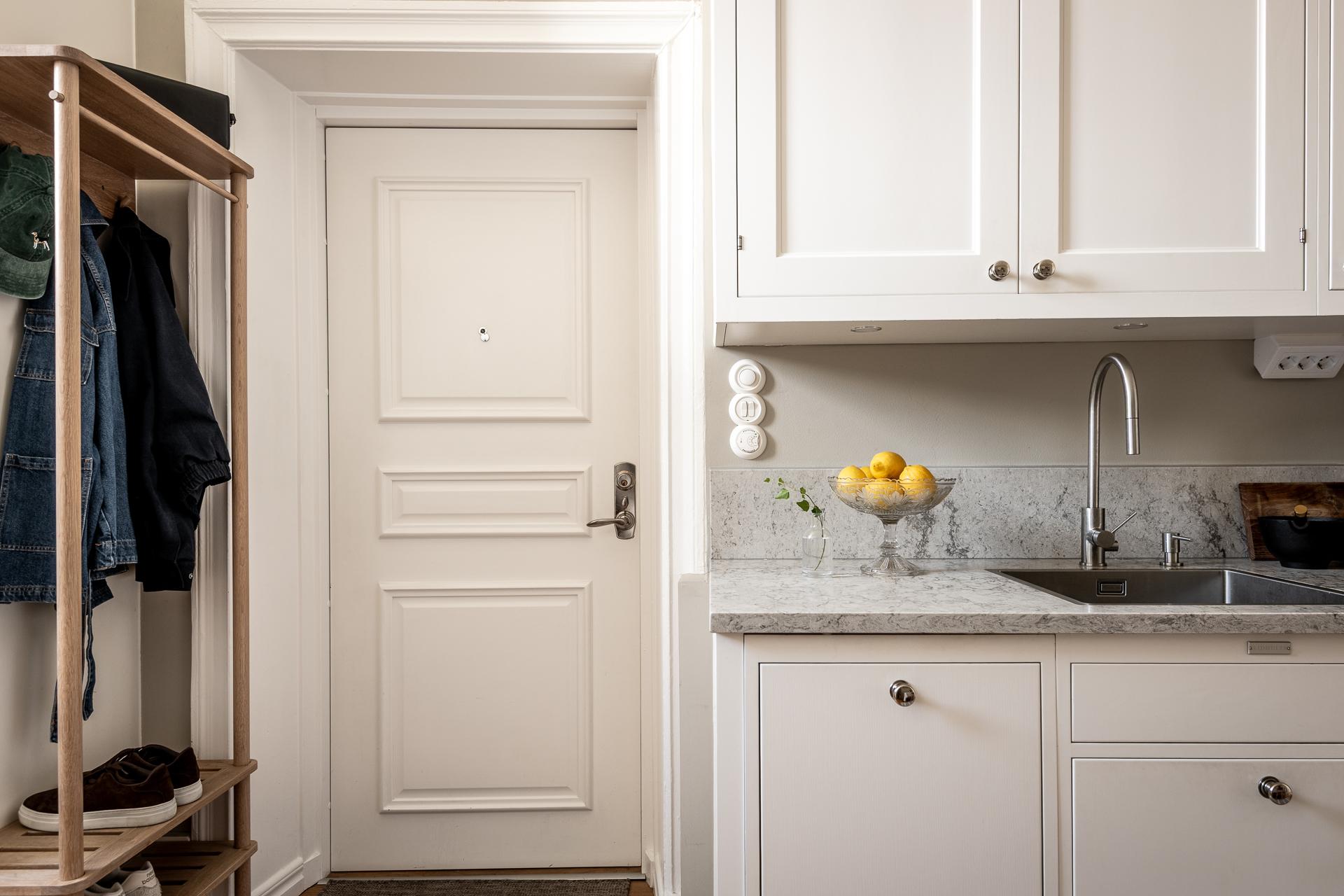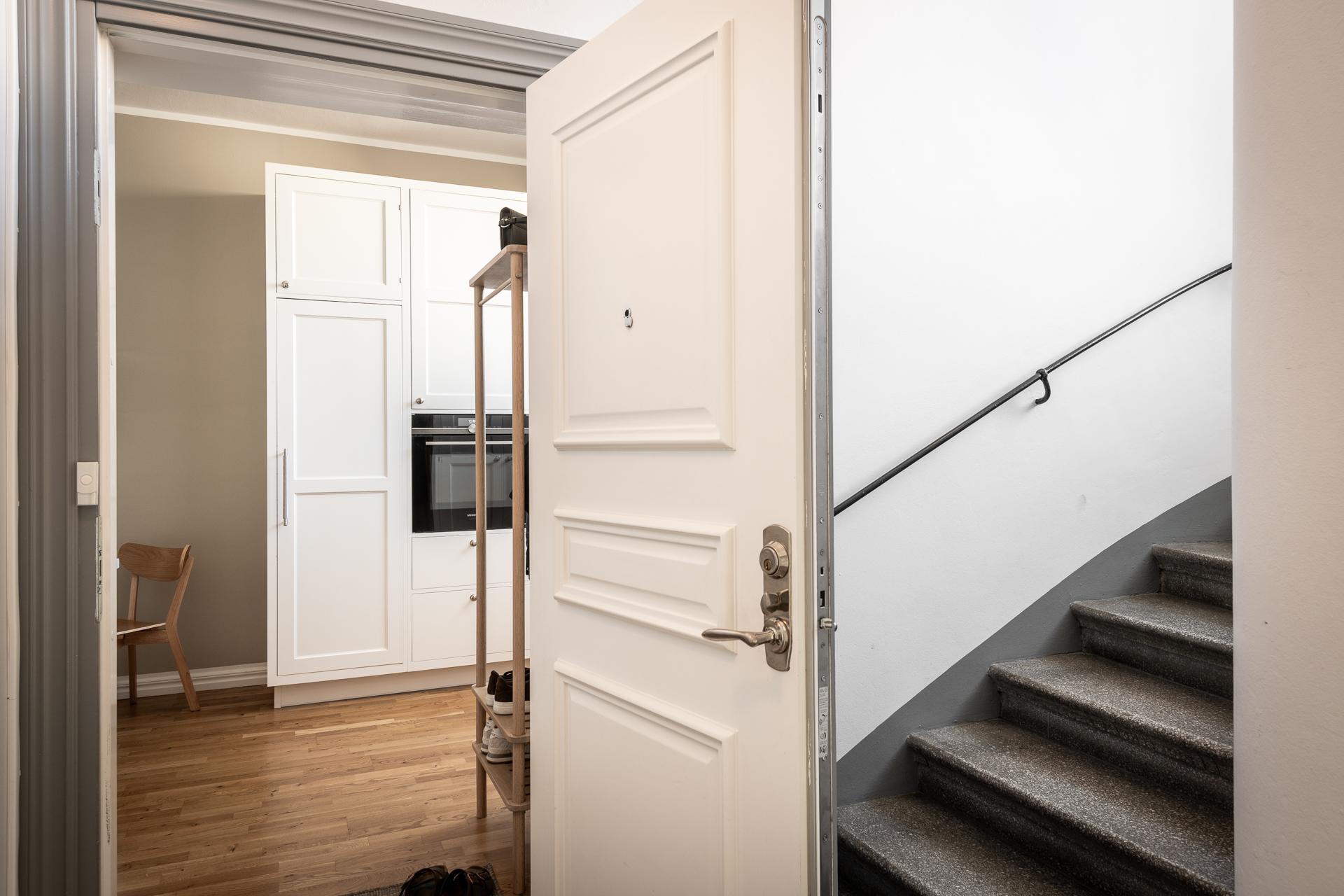Vill man ha gratis vardagsmotion så kan man ta trapporna annars är hissen upp till sjätte våningen ett bra alternativ och sen gå en halvtrappa ner. När man väl öppnar upp säkerhetsdörren i spegelutförande är det lätt att tappa hakan. Det skulle krävas många mäklarfloskler för att beskriva första intrycket så låt oss bara konstatera det givna; här är det förälskelse vid första ögonblicket som gäller. Man kastas rätt in och det är svårt att inte bli berörd. Direkt till höger finns en naturlig avhängning för kappor och skor och skåpen bakom är dedikerade för ytterligare förvaring av ytterkläder.
