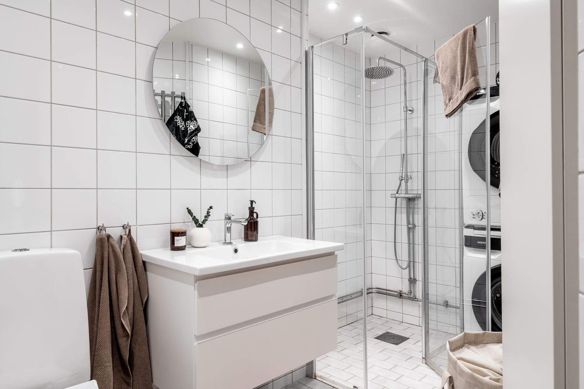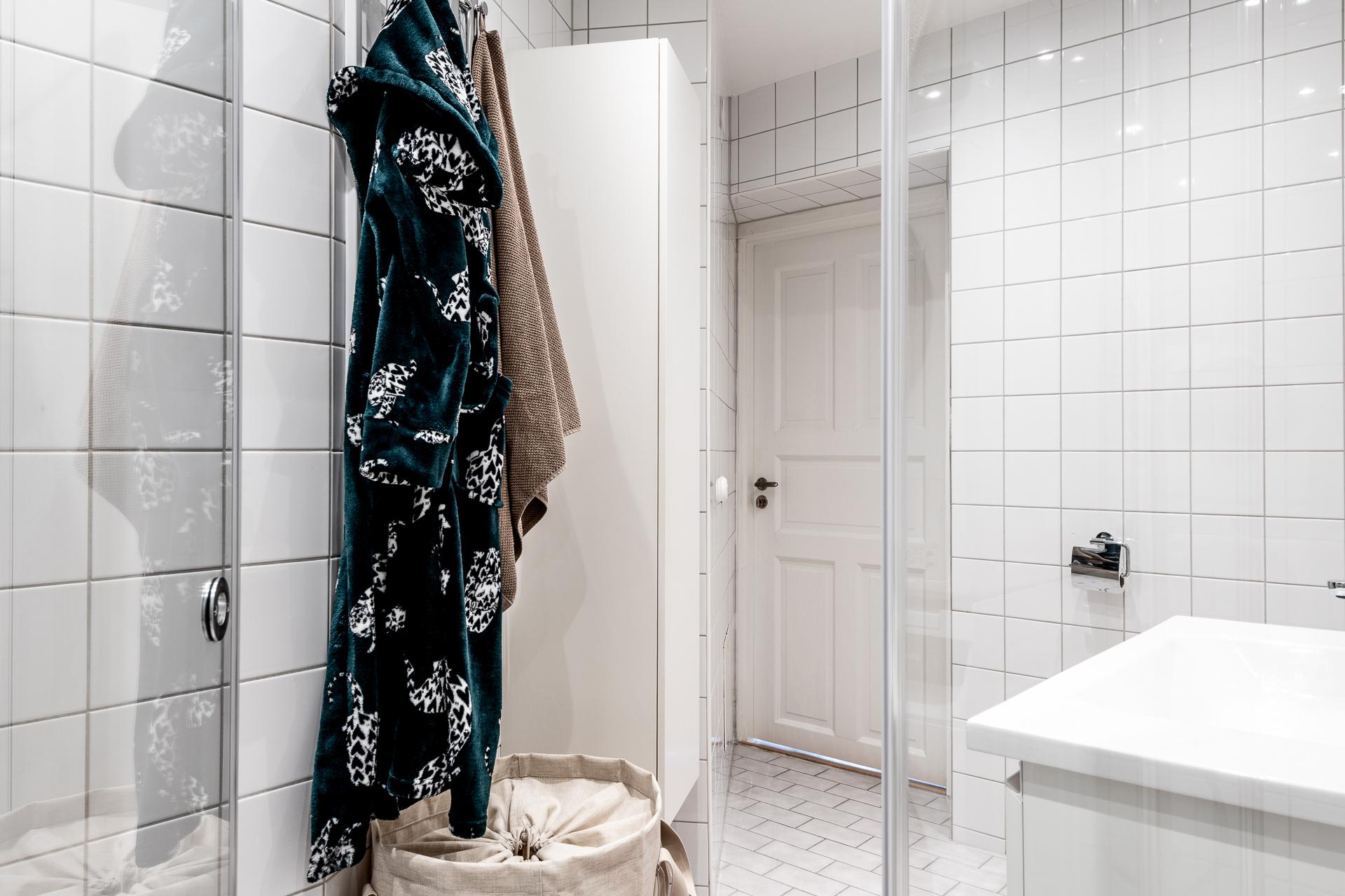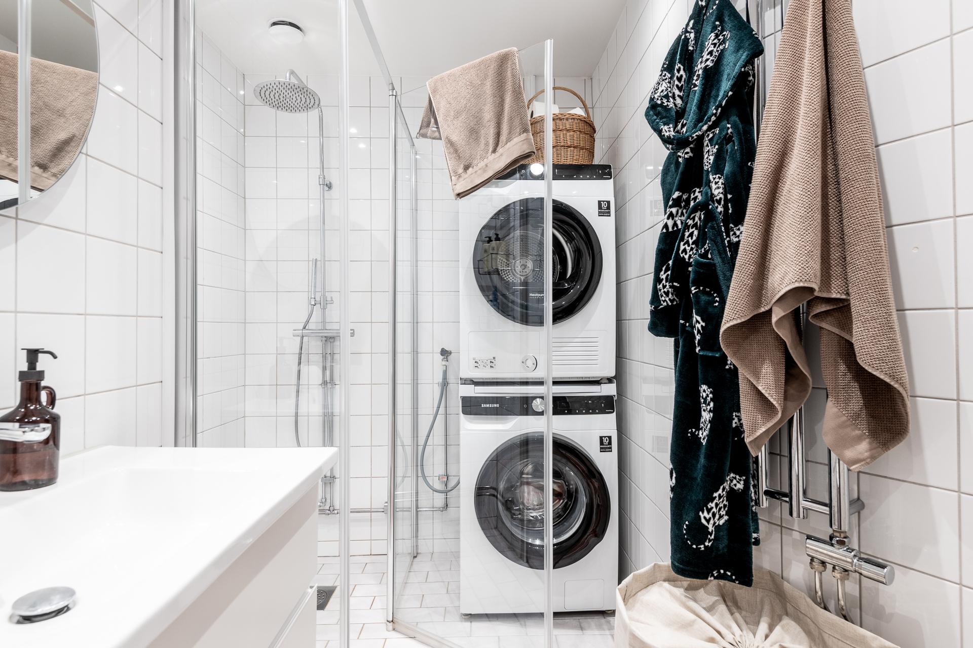 Ett stort badrum i sekelskiftesfastighet, går det verkligen? Yes, på Hvitfeldtsgatan 14A är detta ett faktum, dessutom fullt utrustat med båda handdukstork och egen tvättpelare från Samsung som installerades 2021. Samtidigt byttes också glasväggarna till duschen (Linc) liksom dusch som är från INR. En extra bred kommod från INR installerades liksom den fina spegeln från samma märke. Högskåpet är från Svedbergs toalettstolen från Duravit.