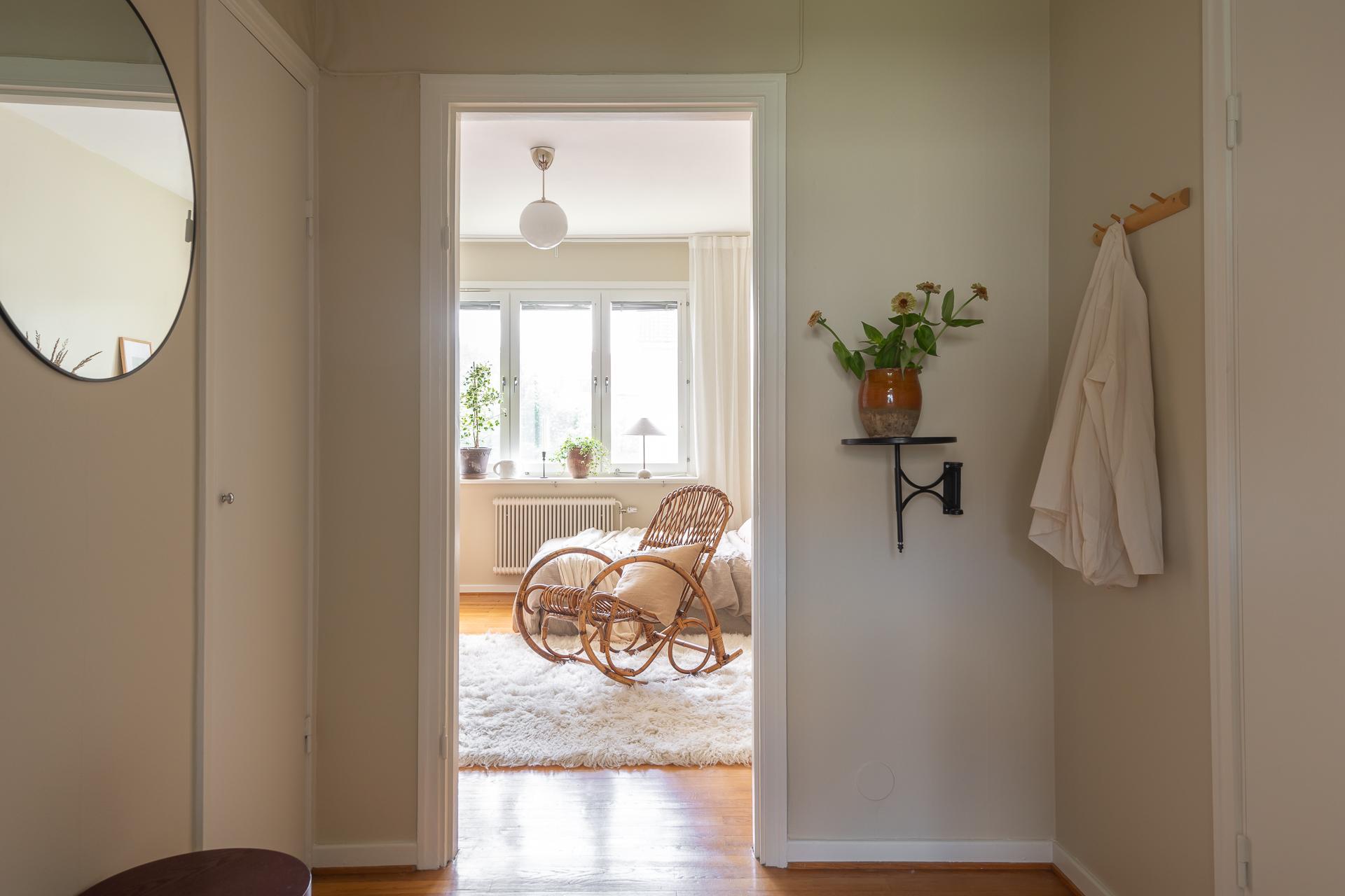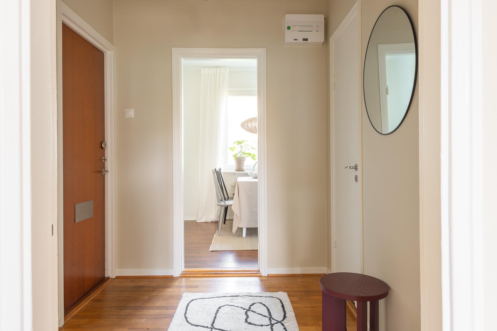 Rymligt etta som badar i ljus hela dagen. Fina 1940-talsdetaljer finns bevarade i form av stavparkett, listverk, och inbyggda garderober. Ytan är välplanerad, med lättmöblerat rum och stort kök. Några snabba trappsteg ner från bostaden finns en soldränkt trädgård. Läget är mycket lättillgängligt, med spårvagn runt hörnet och bra cykelvägar. Delsjönaturen är en kort promenad bort.