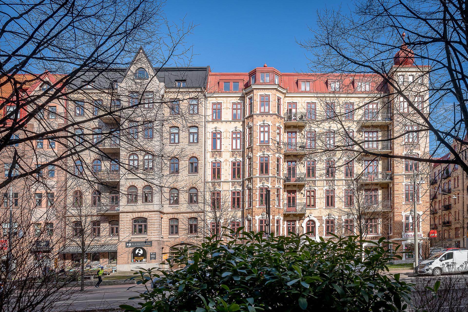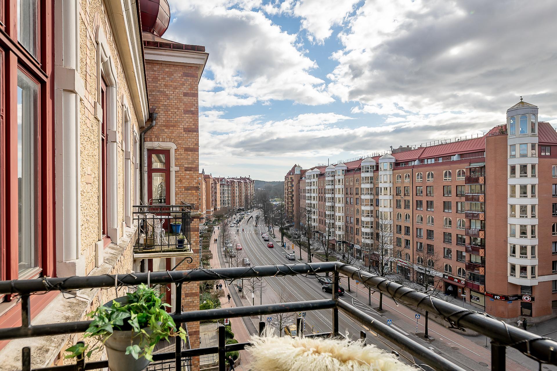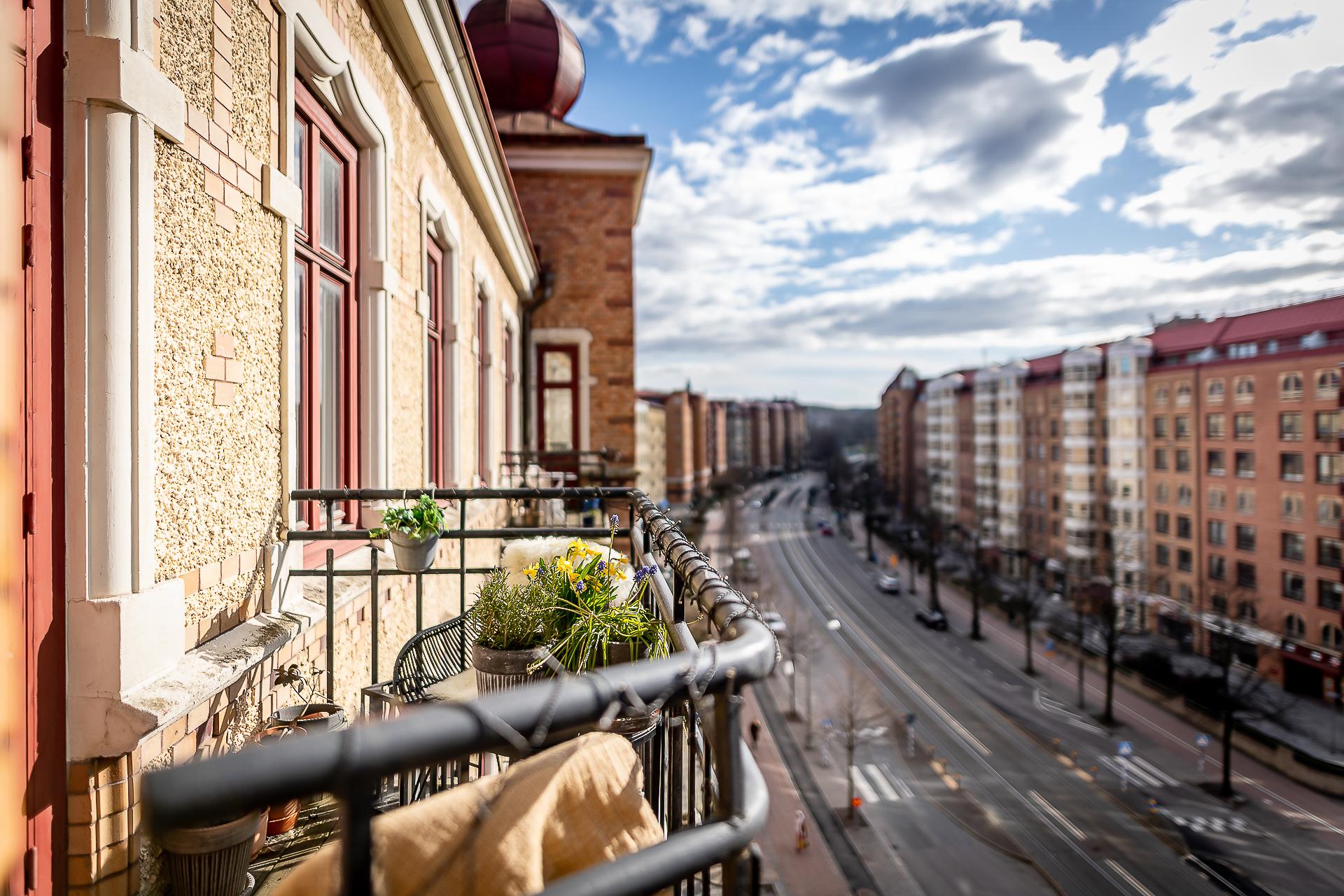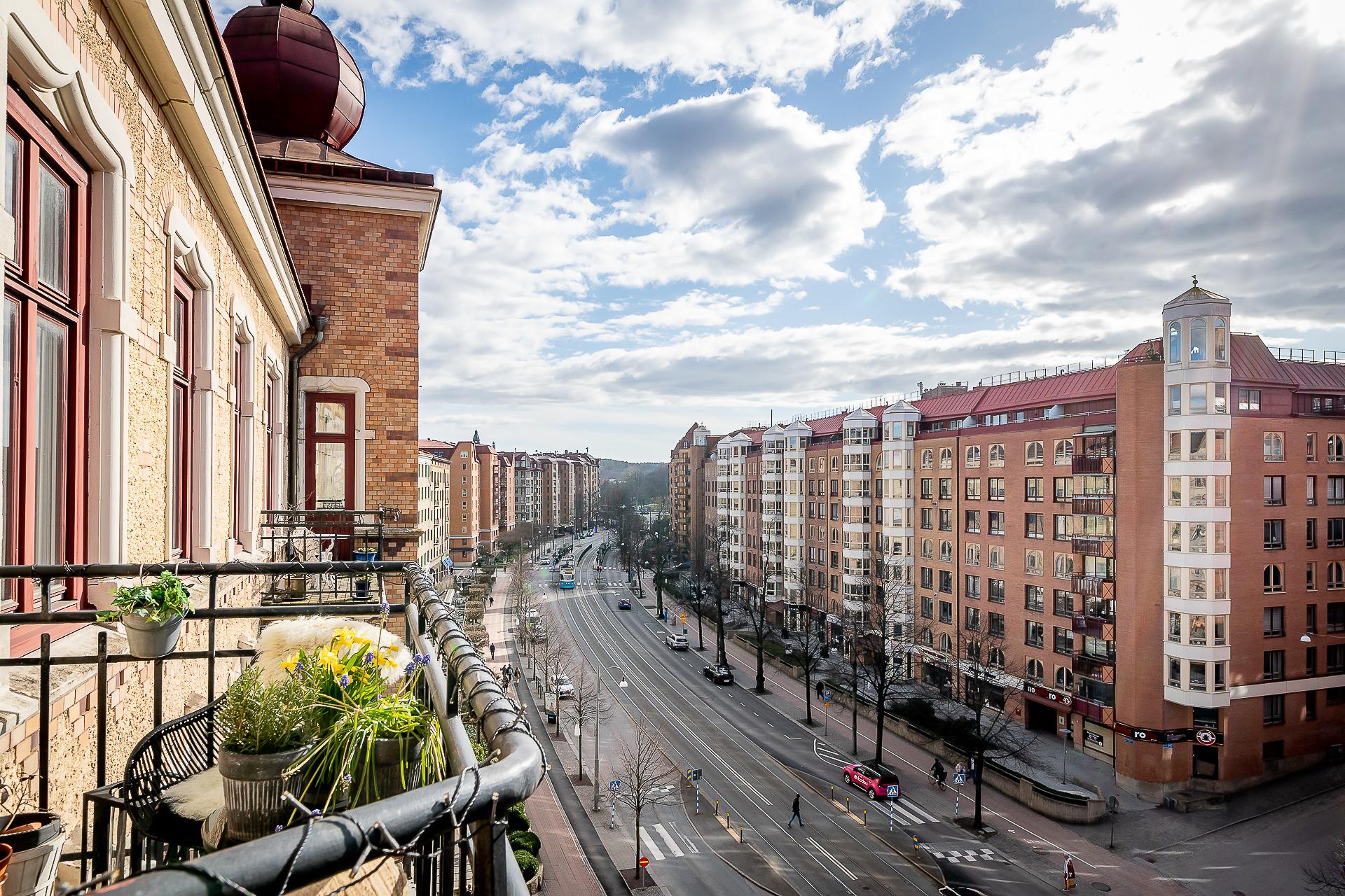 Sekelskiftesfemma om 150 kvadrat på Linnégatans solsida. Högsta ordinarie våningsplan, västerbalkong, serveringsgång, fiskbensparkett, flera rum i fil, badrum med tvättmaskin och gäst-toa. Tre kakelugnar och möjlighet till hela fyra sovrum. Hissen tar dig upp till plan fem och månadsavgiften till lågbelånade Brf Solhörnan är blygsamma 3 237 kr inklusive fiberbredband.